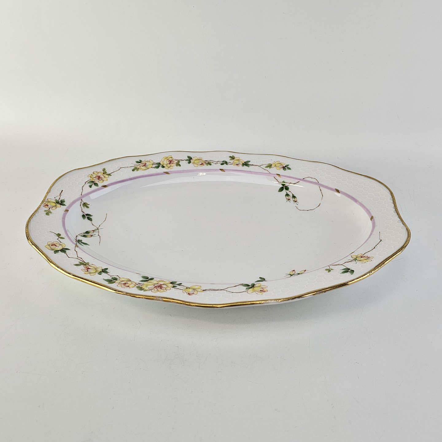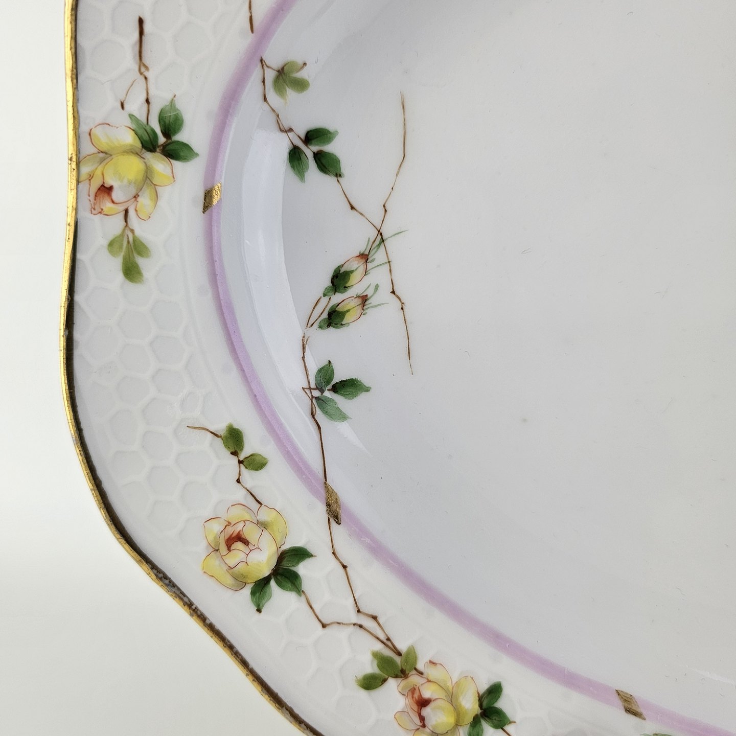 Service i hvidt porcelæn med hamret kantmønster dekoreret med gule blomsterranker og lyslilla streg. Stellet er med guldkant og det er mærket med bølger anvendt frem til 1890.