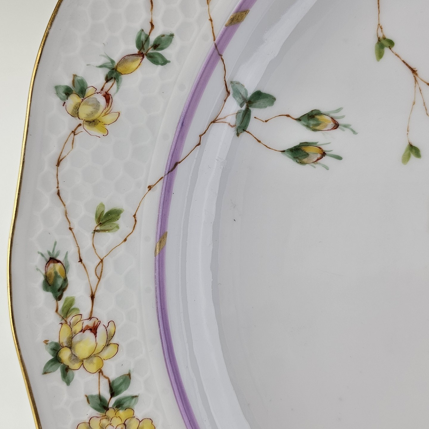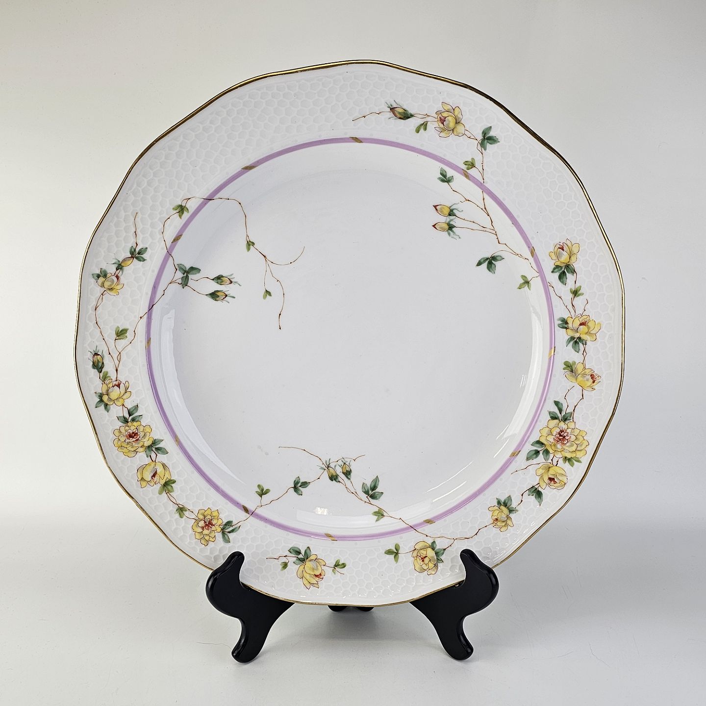 Service i hvidt porcelæn med hamret kantmønster dekoreret med gule blomsterranker og lyslilla streg. Stellet er med guldkant og det er mærket med bølger anvendt frem til 1890.