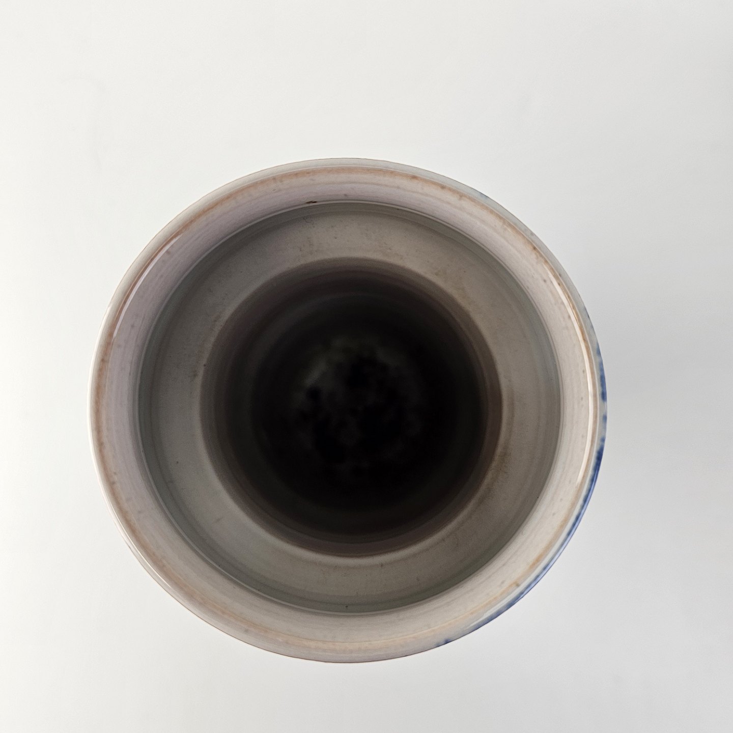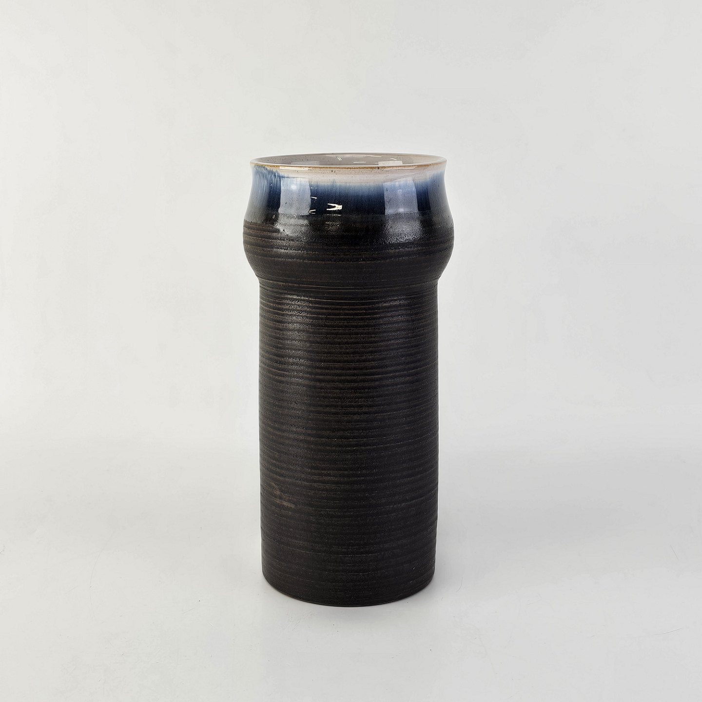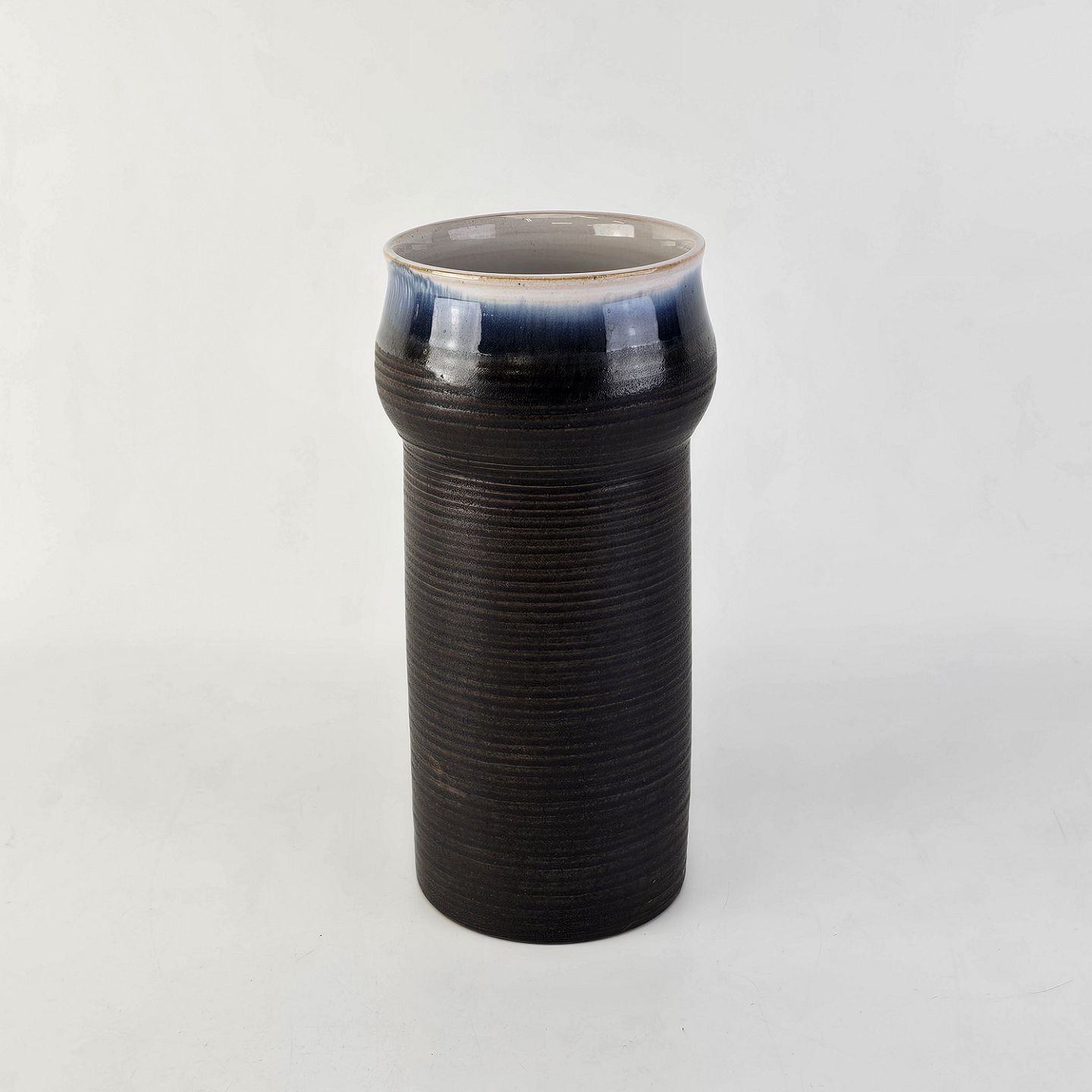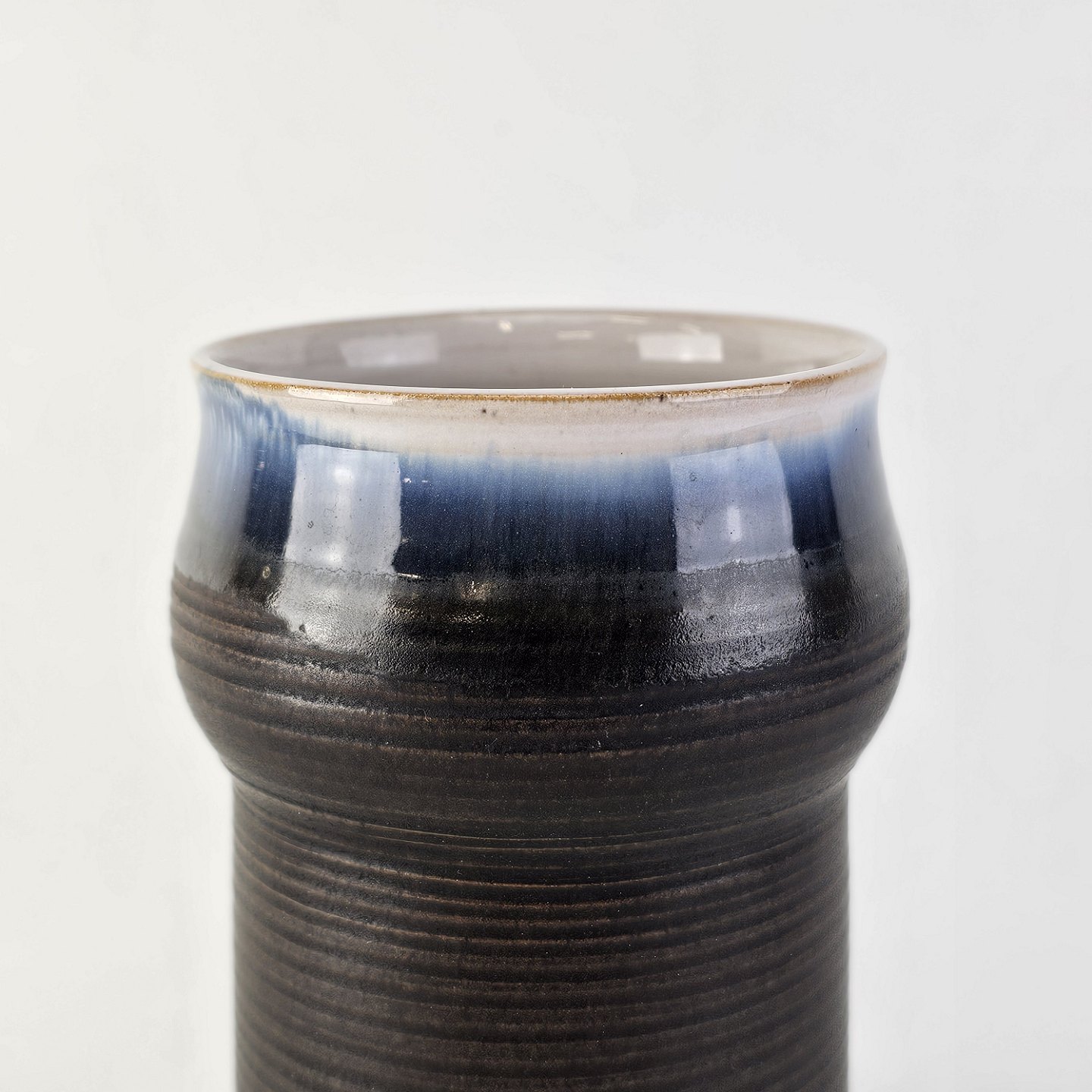 Riflet vase i glaseret keramik i sorte, blå og hvide nuancer