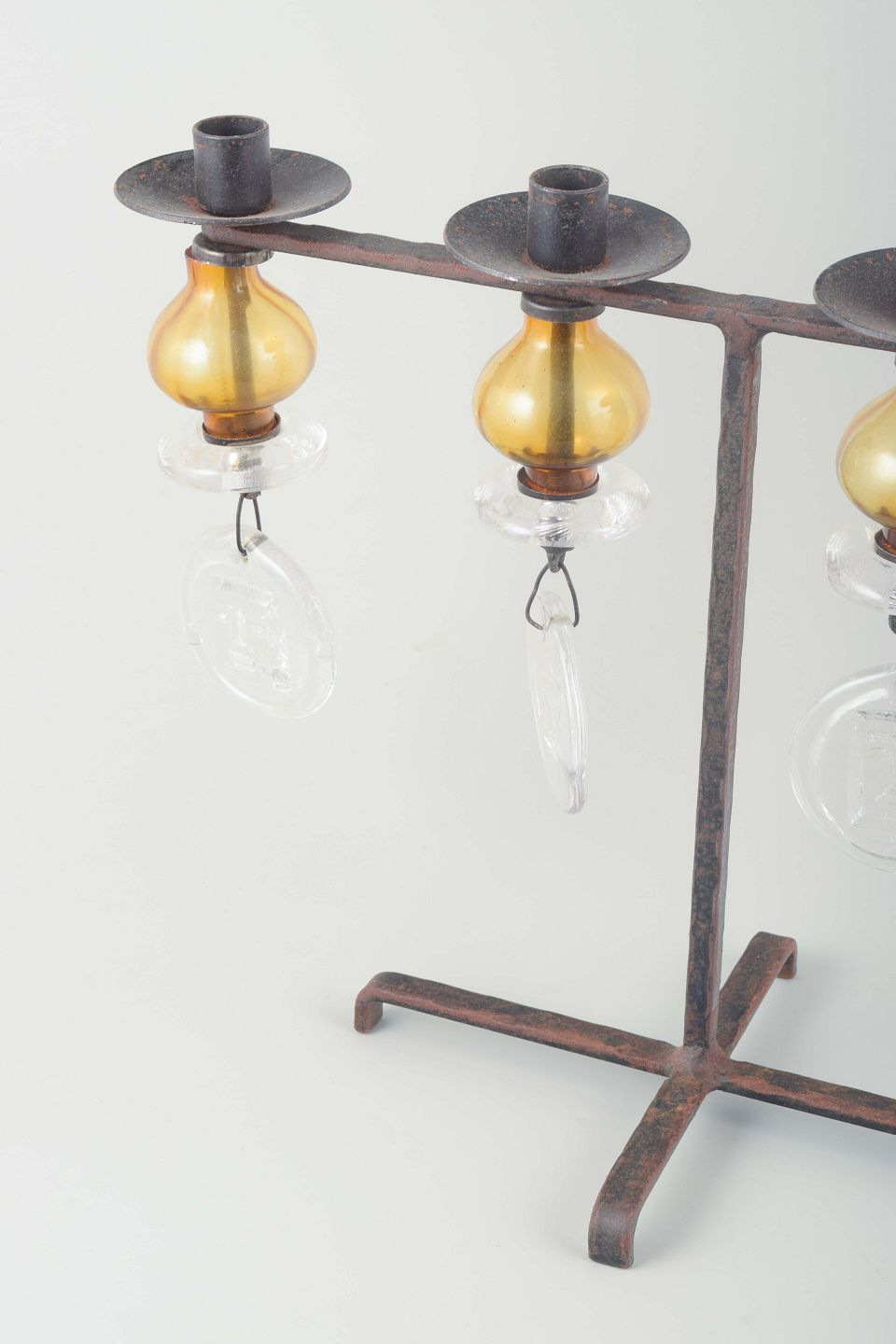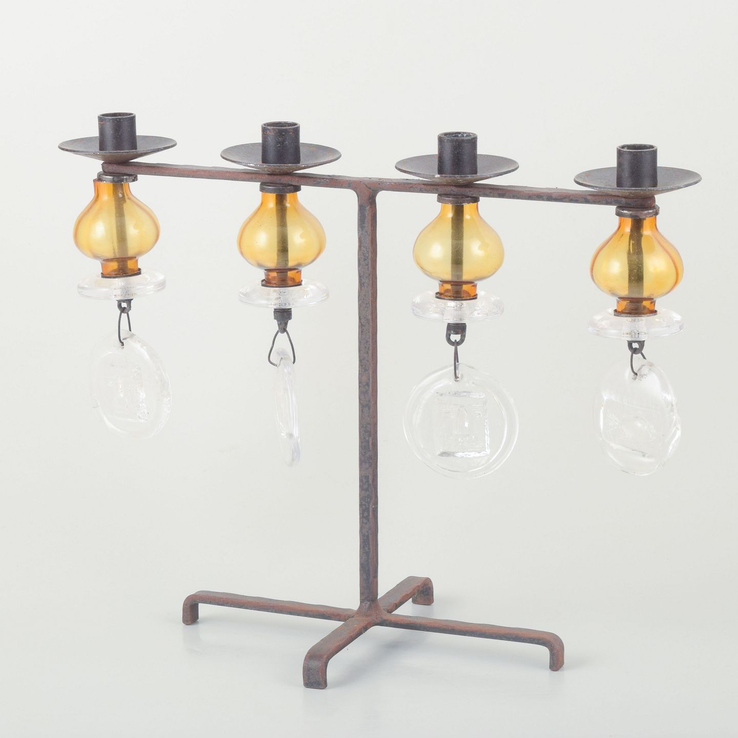 En dekorativ firearmet stage af Erik Höglund for Kosta Boda, udført i jern med håndblæste glasprismer i rav og klart glas. Prismerne bærer det karakteristiske indpressede ansigtsmotiv, der blev et signaturtræk i Höglunds design.