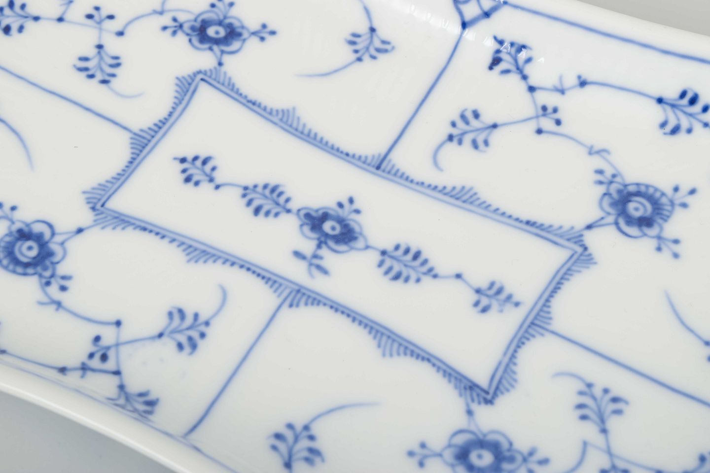 En klassisk serveringsbakke fra Royal Copenhagen i det ikoniske musselmalede Riflet-mønster, håndmalet med elegant blå dekoration. Formen er let svunget med markeret kant, velegnet både som brugskunst og dekorativt indslag i samlingen.