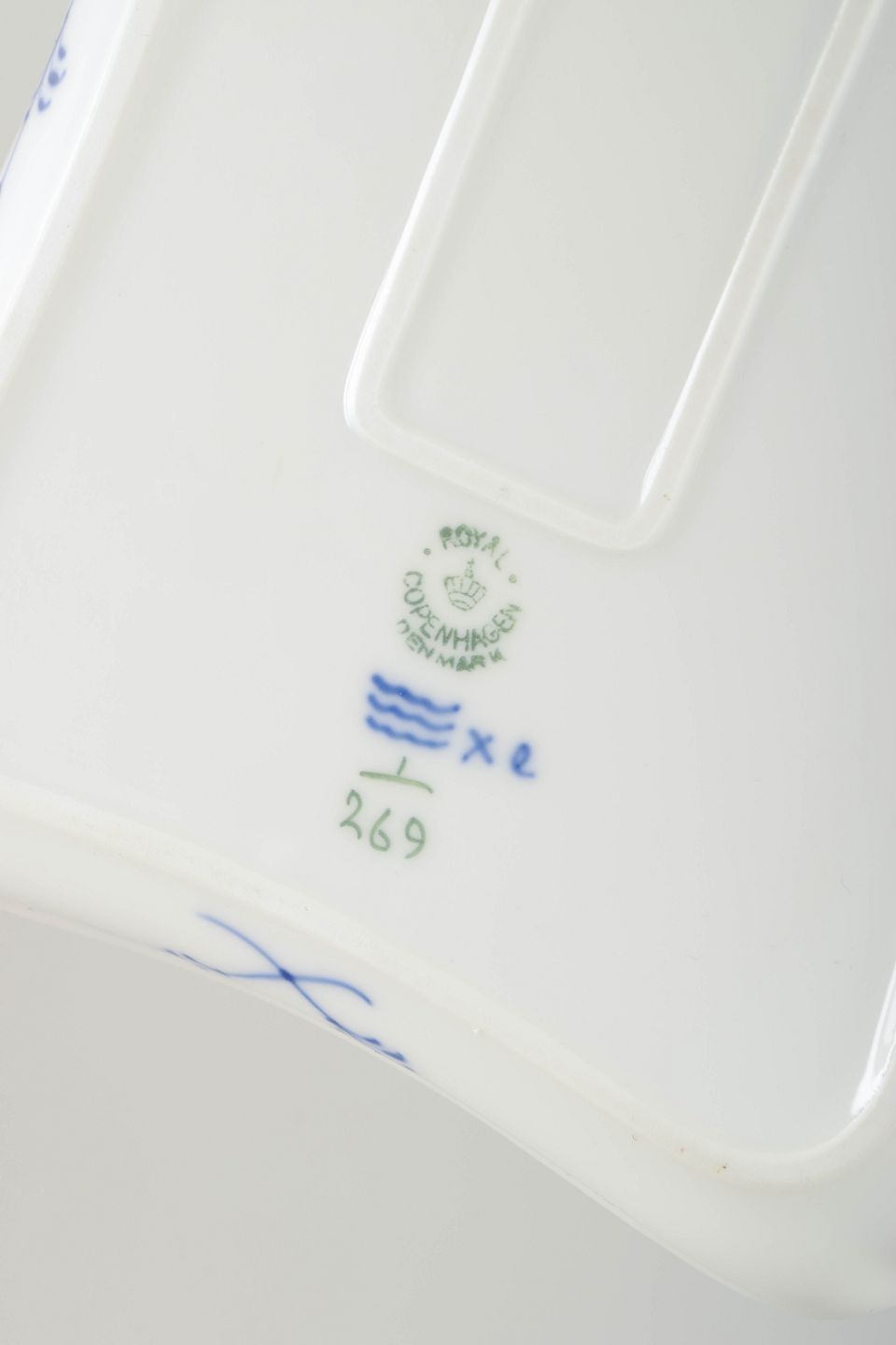 Stempel: Royal Copenhagen mærke med tre bølgelinjer, modelnummer “269”, malersignatur