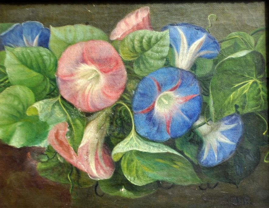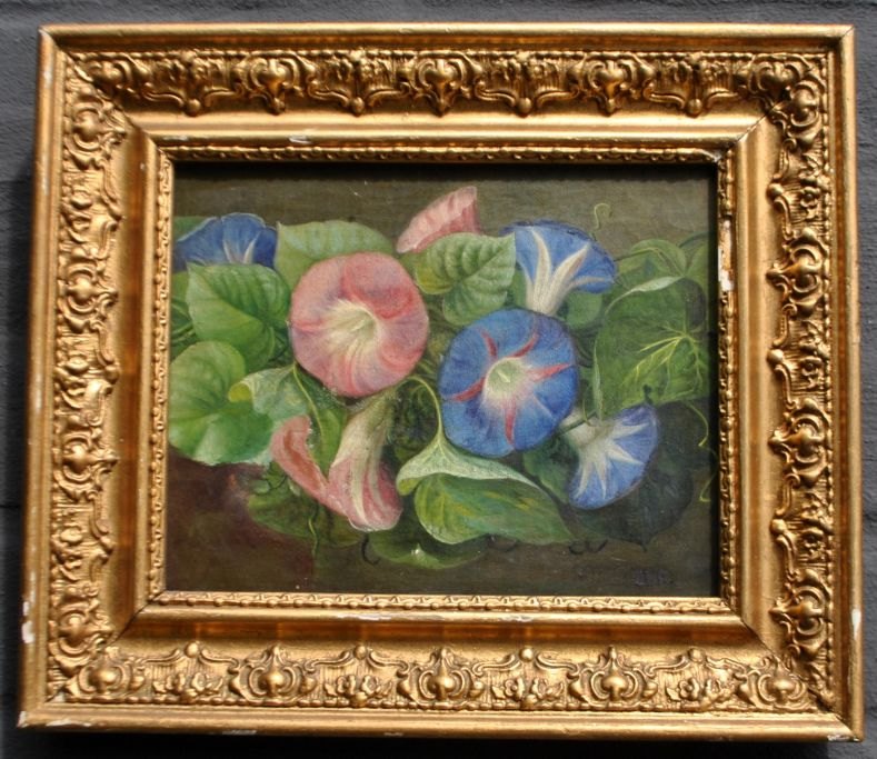 Dänischer Künstler (19. Jahrhundert): Arrangement mit Winden auf einem Tisch. Öl auf Leinwand. Signiert: HR. 16,5 x 21 cm.