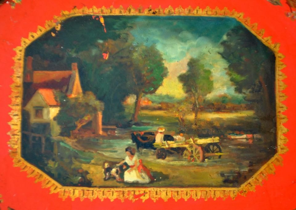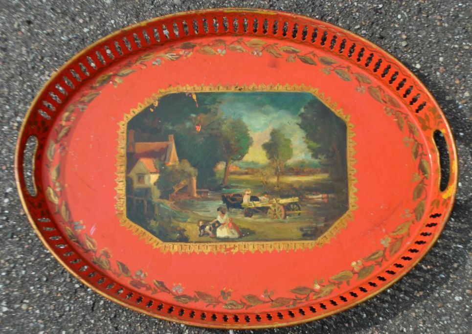 Großes englisches Metalltablett mit Malerei, 19. Jahrhundert