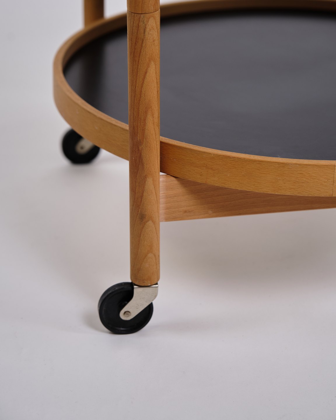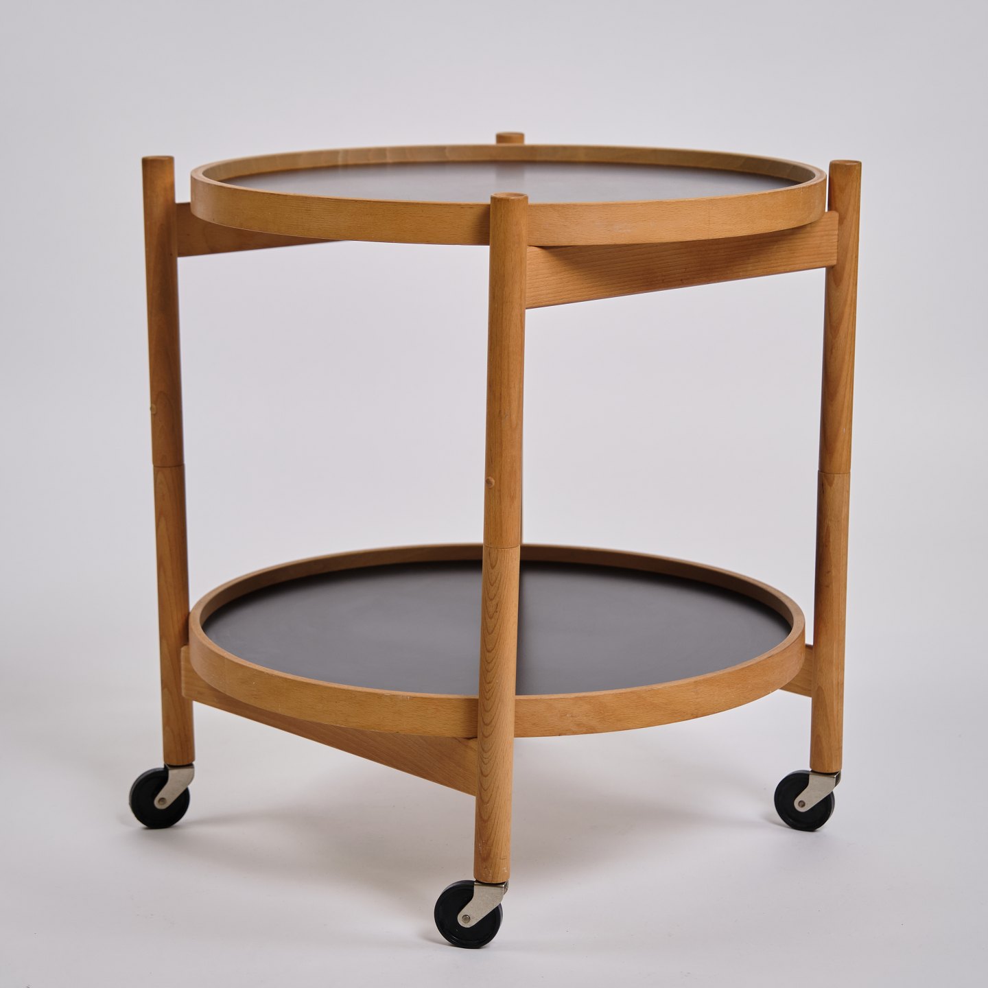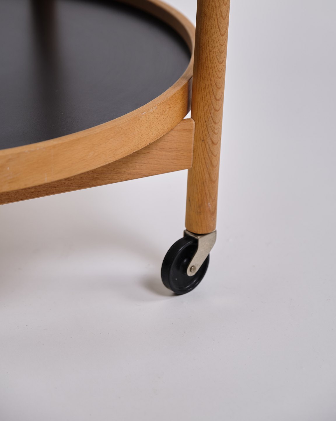 Text zugänglich auf Dänische: Hans Bølling bakkebord for Brdr. Krüger. Teaktræ med hvid/sort vendbare plader. H: 55,5 cm, Dia: 50 cm, B: 43 cm. Klassisk dansk design.