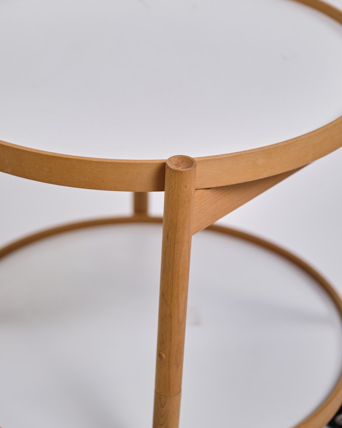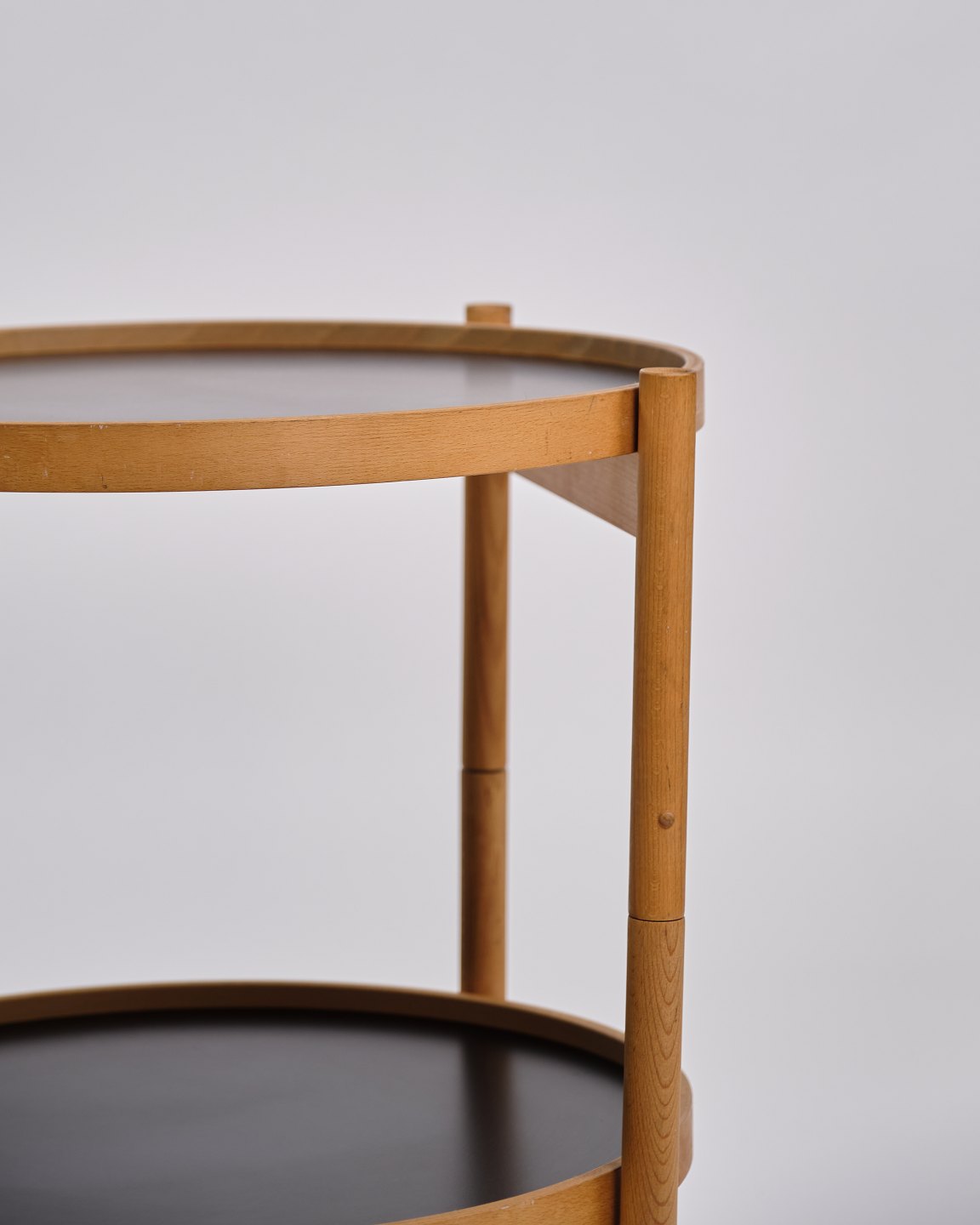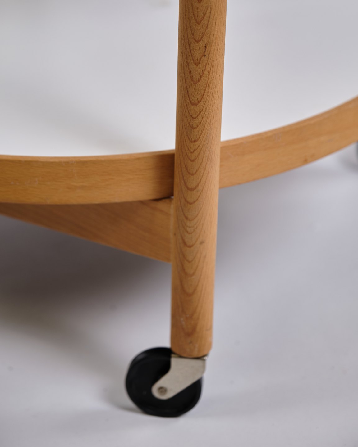Text zugänglich auf Dänische: Hans Bølling bakkebord for Brdr. Krüger. Teaktræ med hvid/sort vendbare plader. H: 55,5 cm, Dia: 50 cm, B: 43 cm. Klassisk dansk design.