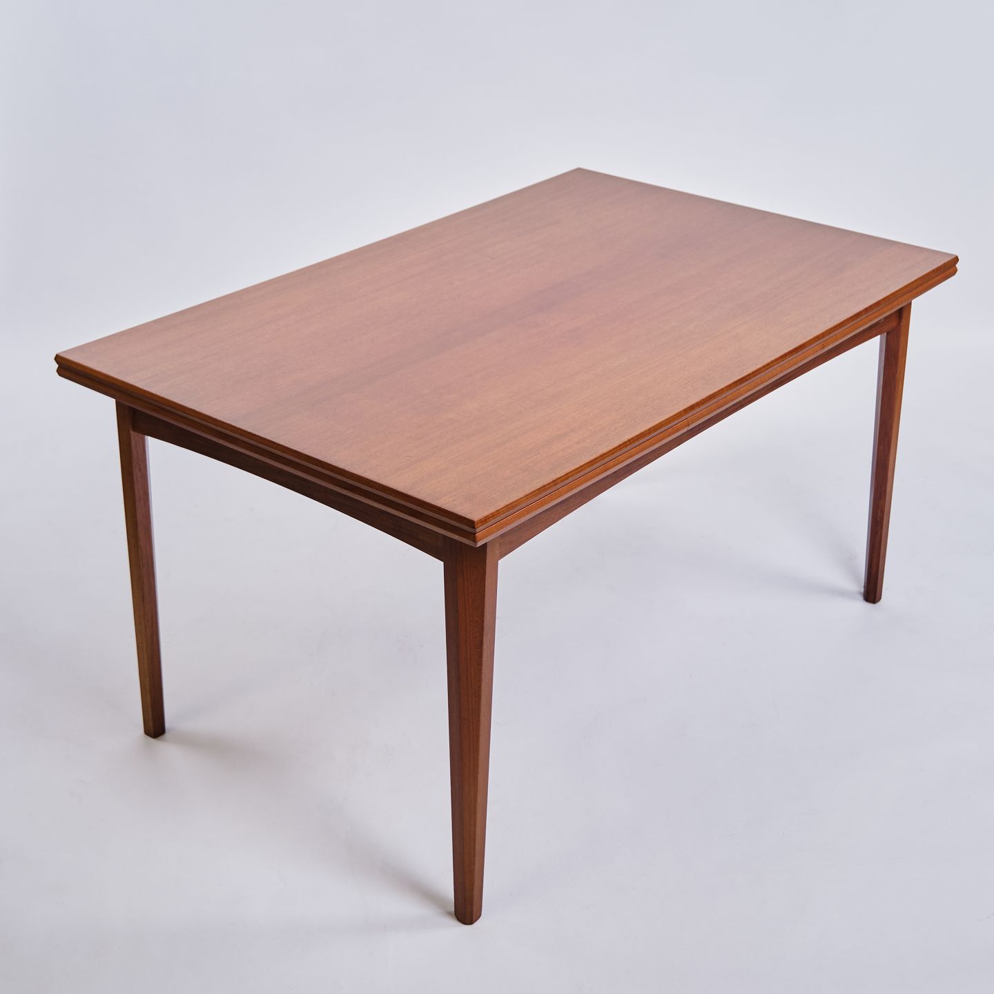 Text zugänglich auf Dänische: Dansk spisebord i teaktræ fra 1960. Hollandsk udtræk med 2 tillægsplader á 50 cm. H: 73,5 cm, B: 140 cm, D: 90 cm. Klassisk dansk snedkerhåndværk.
