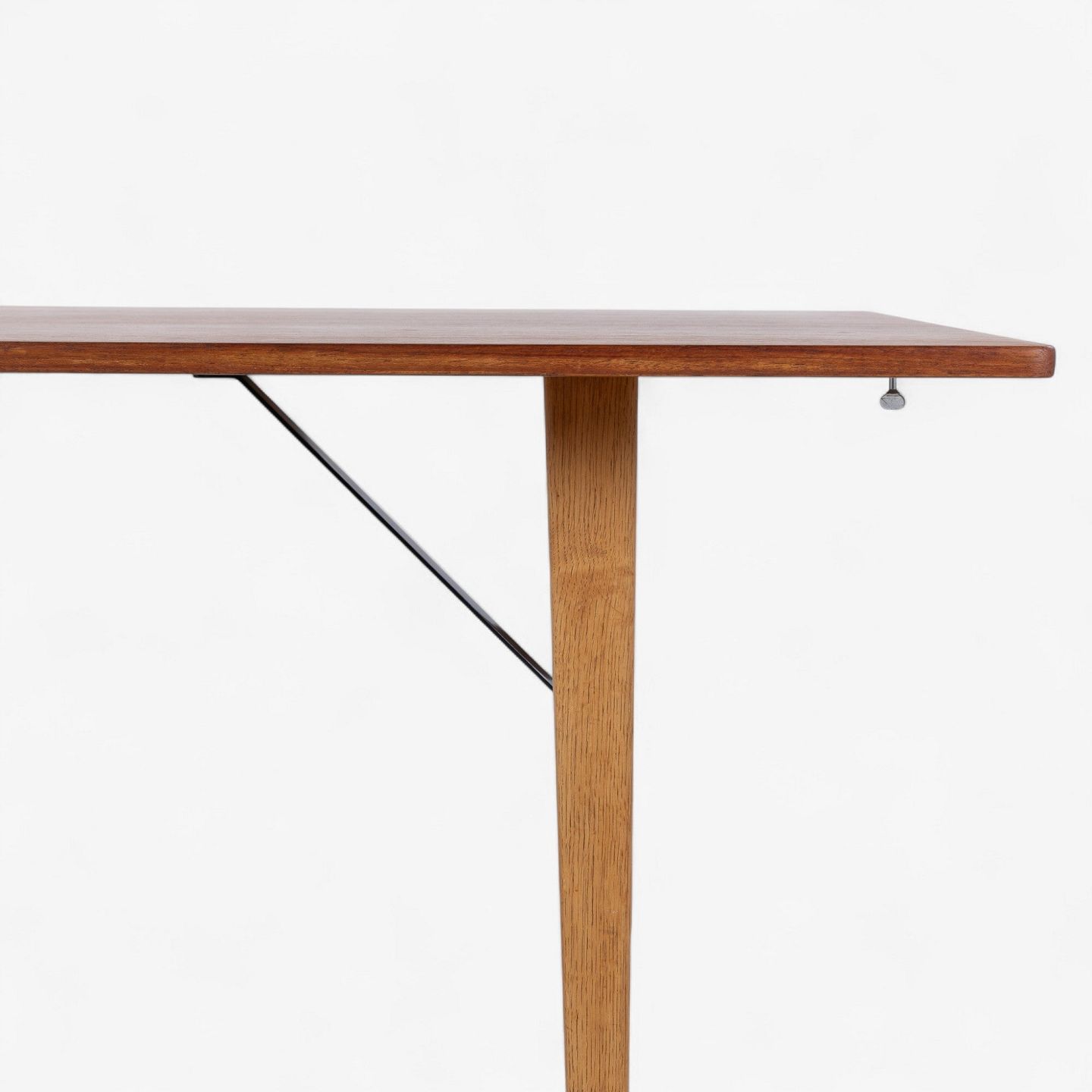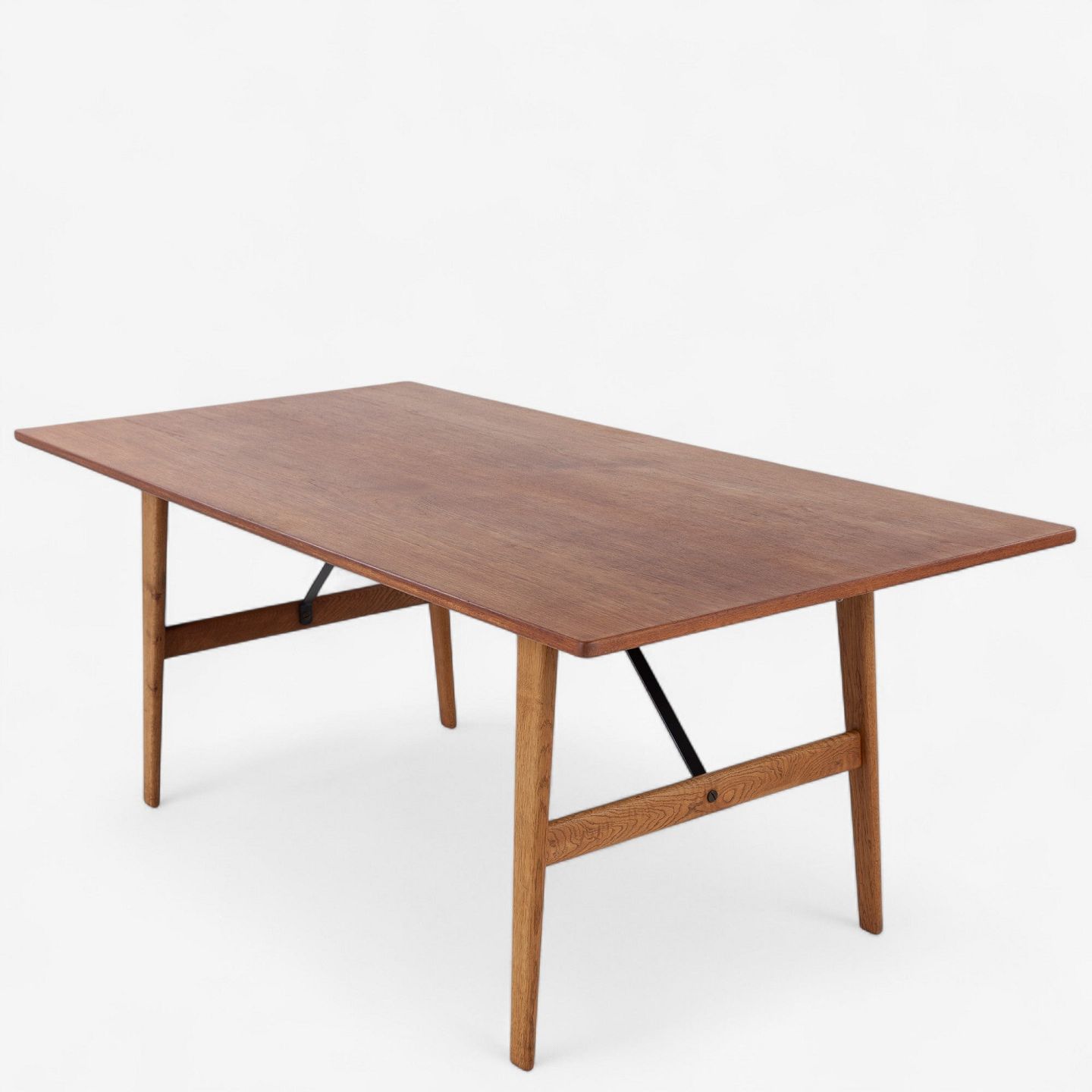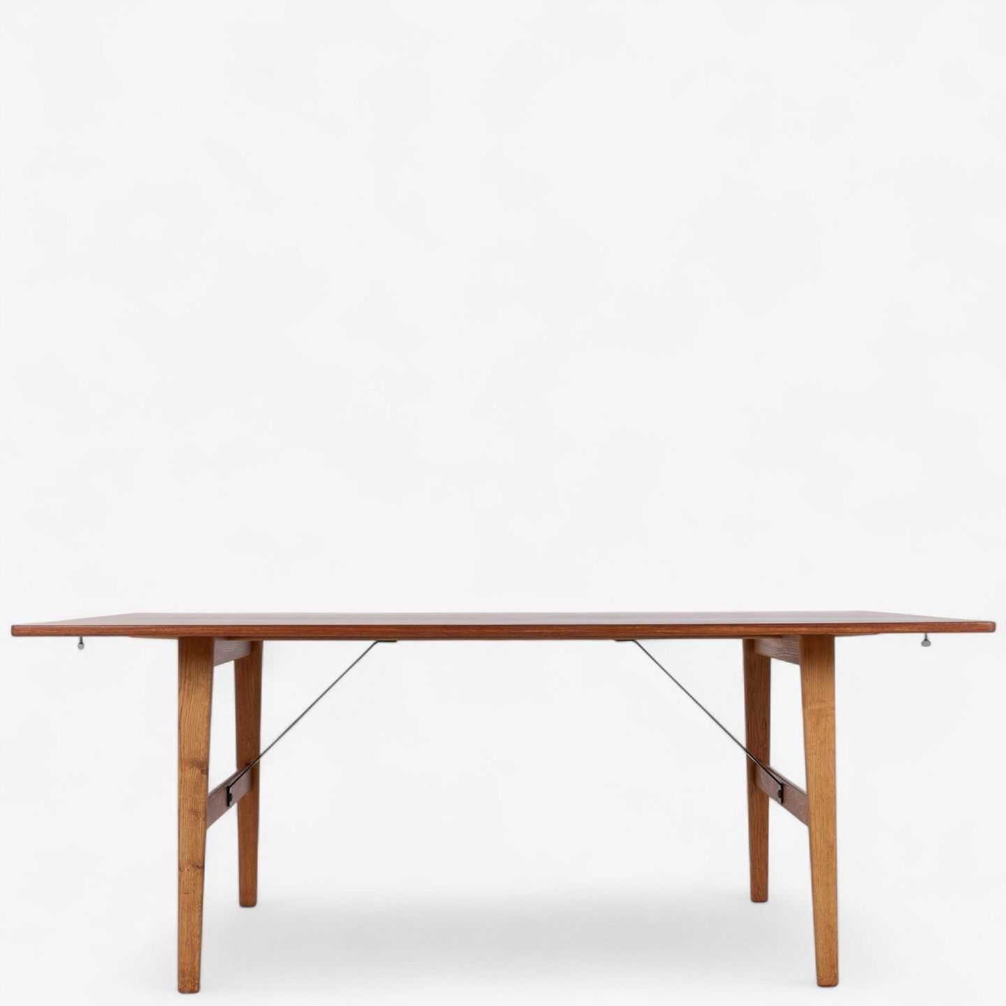 'Jagtbord'-spisebord med plade i teak og stel i eg.