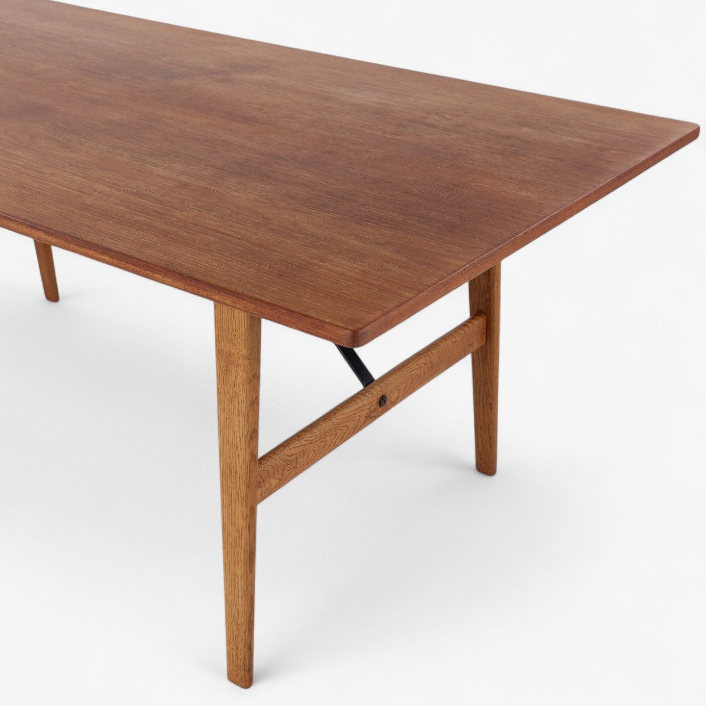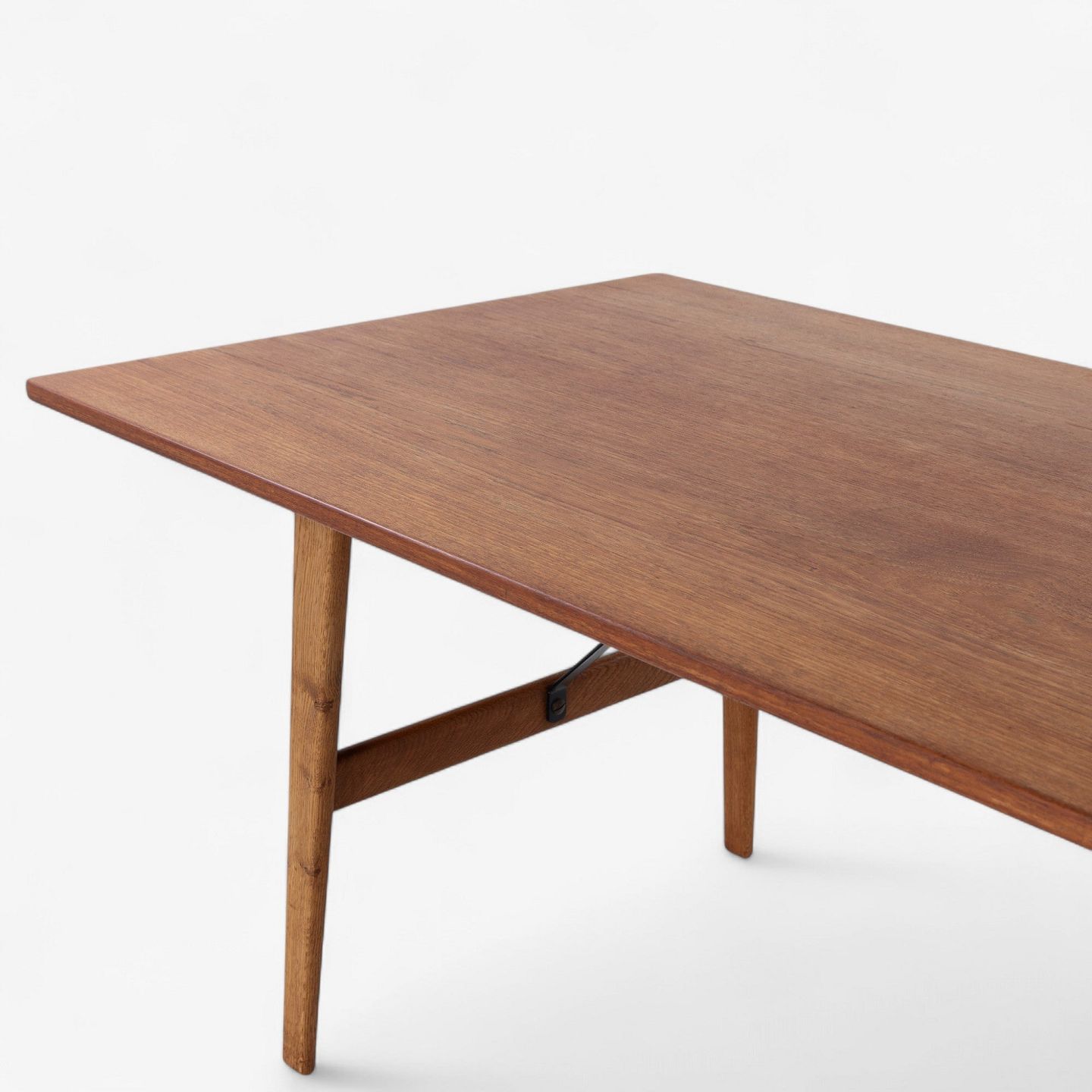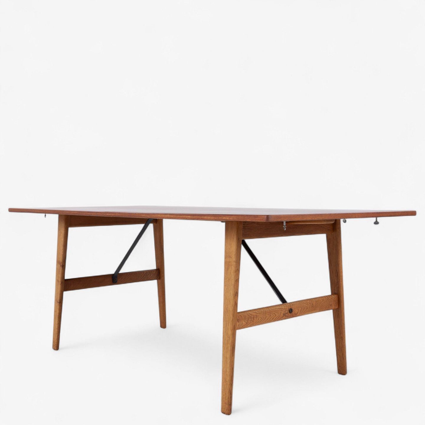 'Jagtbord'-spisebord med plade i teak og stel i eg.