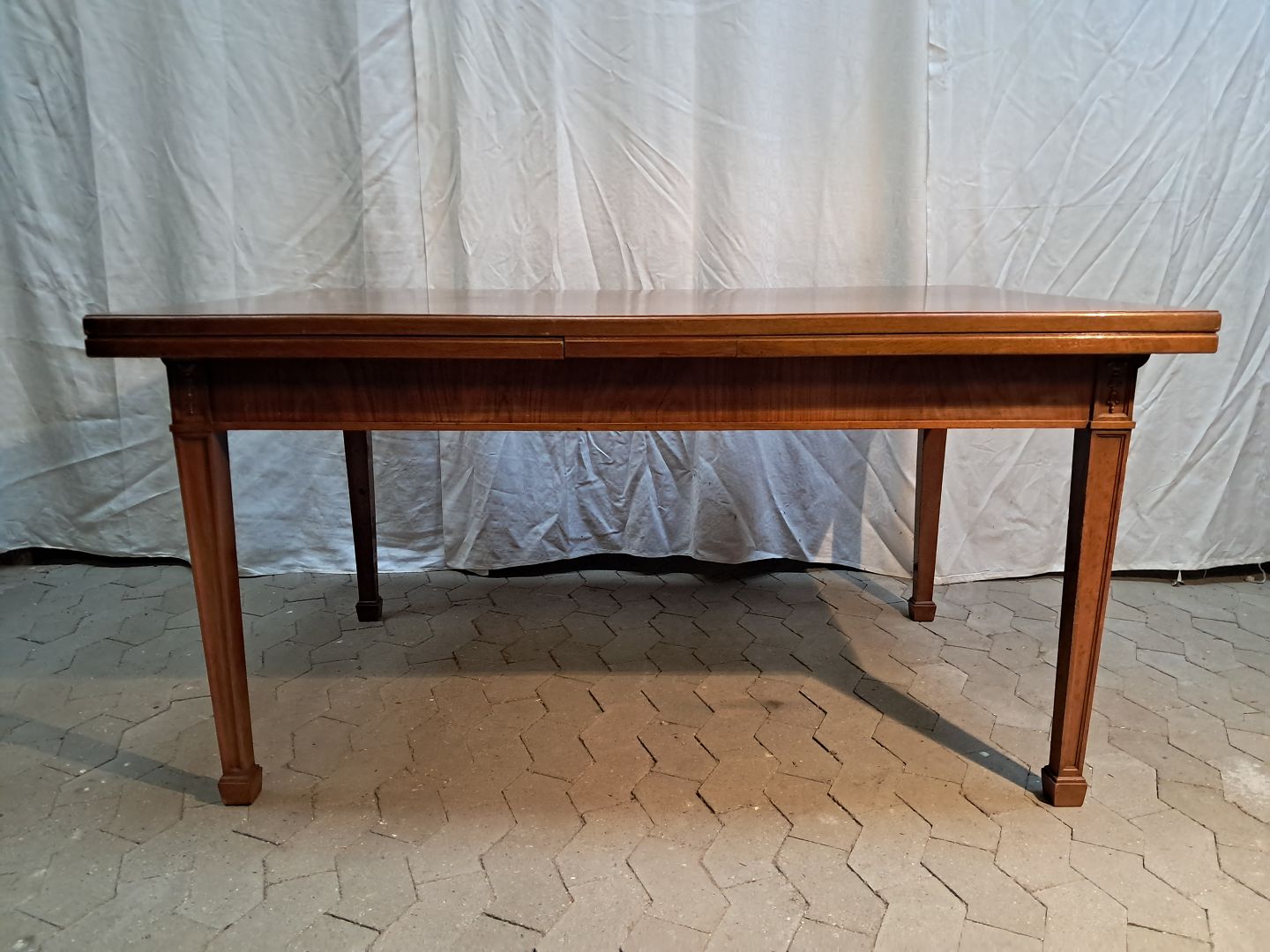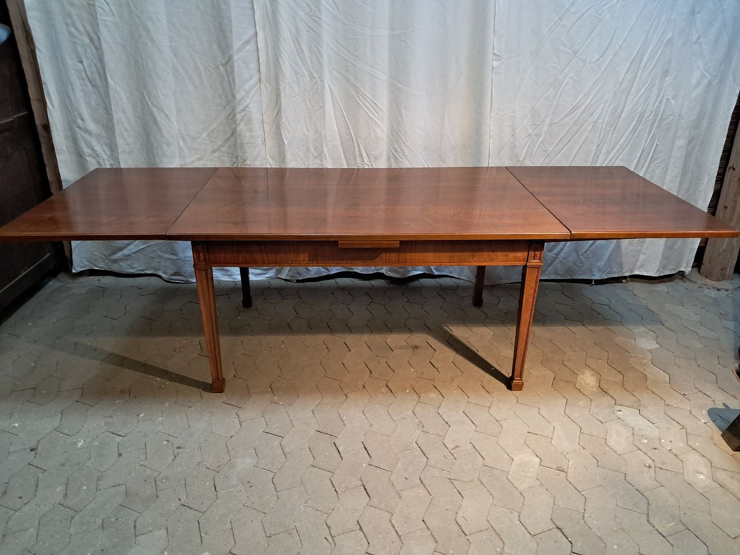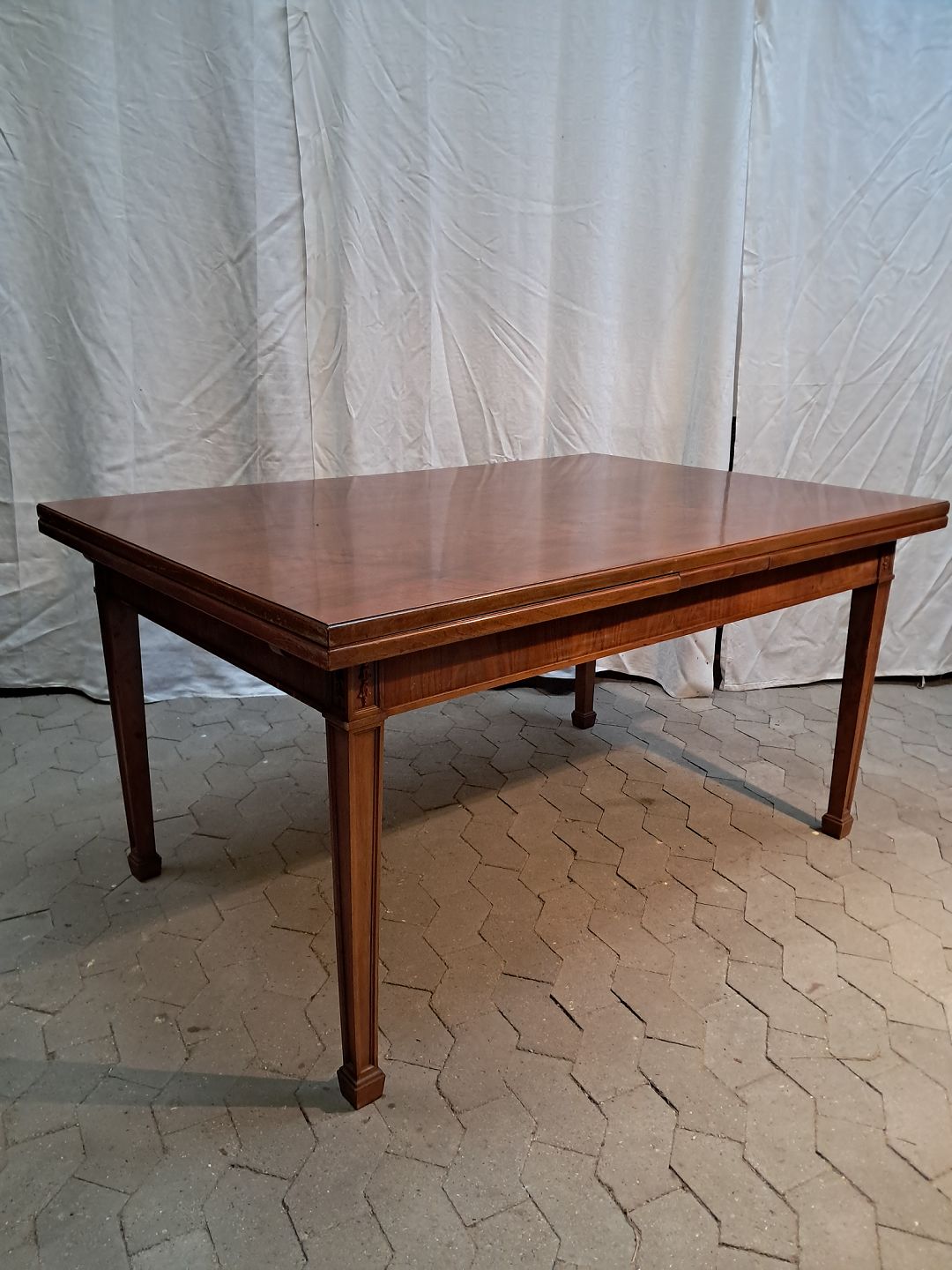 Spisebord i fineret nødetræ med hollandsk udtræk, fra 1950erne.