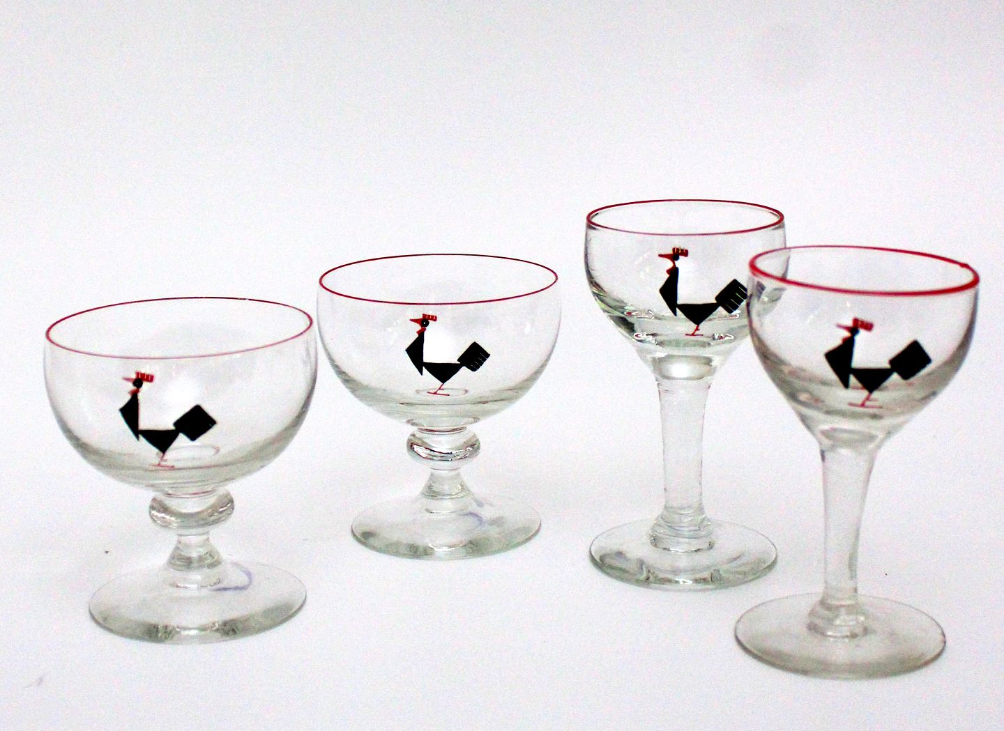 Text zugänglich auf Dänische: Holmegaard Glasværk, Likør og snapseglas med emaljebemalet sort hane og rød kant. Designet af Jacob E. Bang og fremstillet på Malerstuen i Nyhavn 12 i perioden 1937-1957.