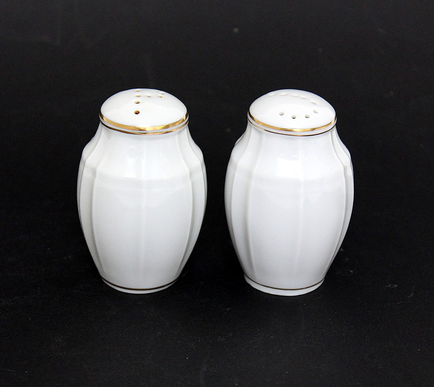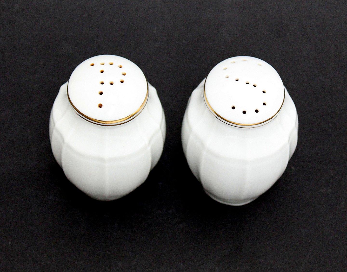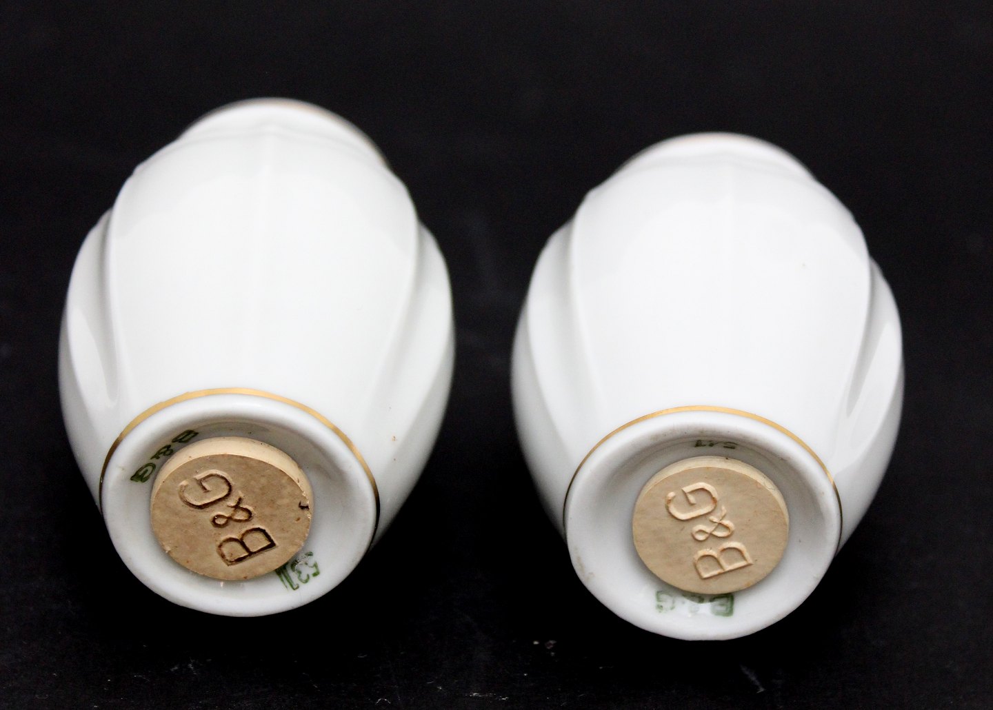 Text zugänglich auf Dänische: Bing & Grøndahl, Offenbach, Salt og Peber sæt. Hvidt kantet porcelæn med guld. Højde 7,5 cm. Salt og peber med original B&G propper. Pris: 375 kr. for sættet.