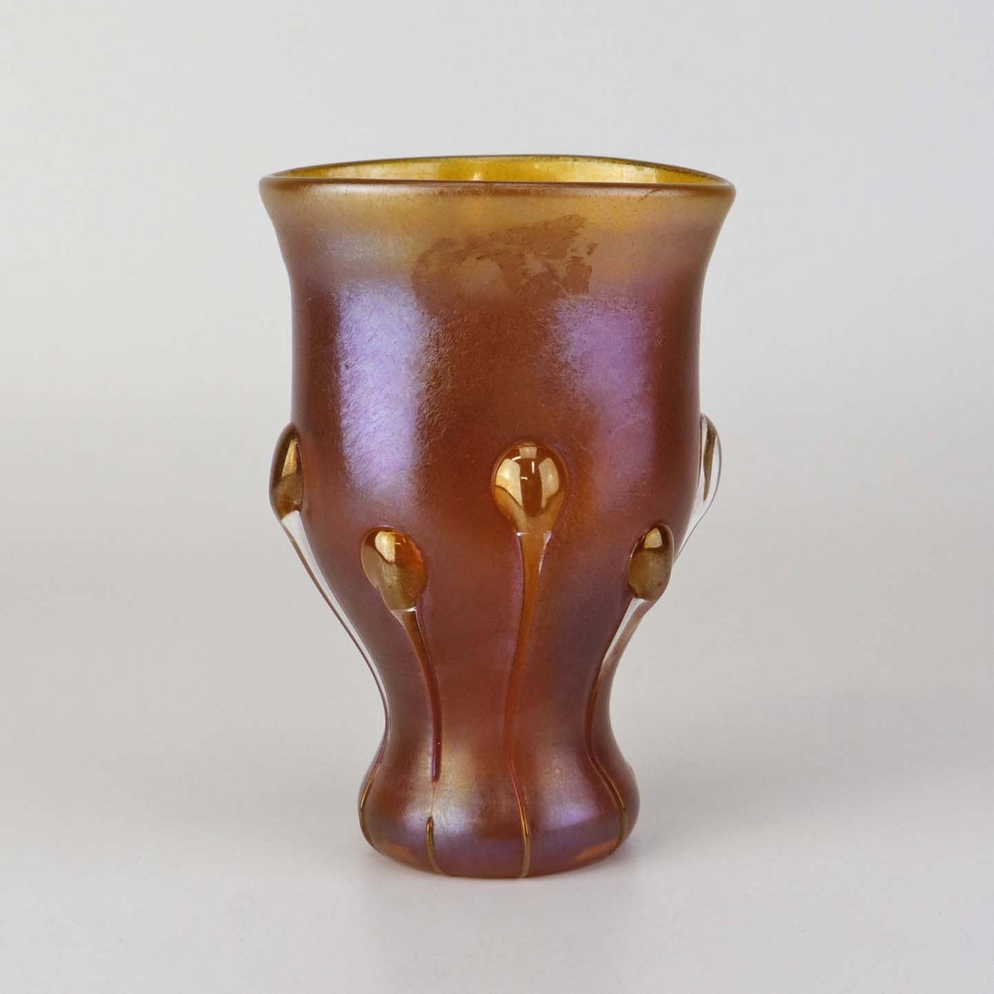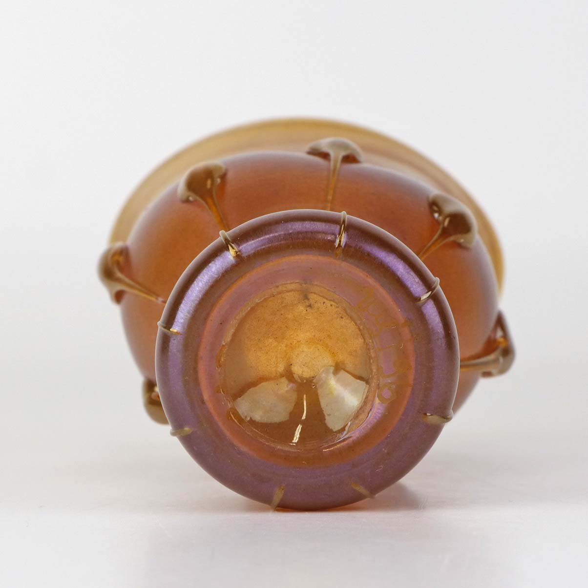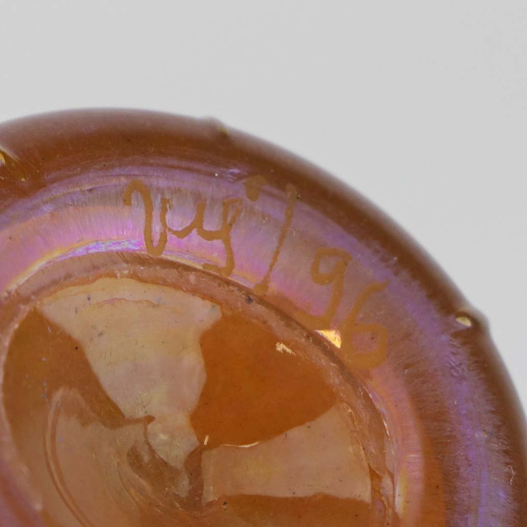 Text zugänglich auf Dänische: Kunstglas vase i Tiffany favrile glas med metallisk orange skær og haletudse dekoration. Model Tadpole.