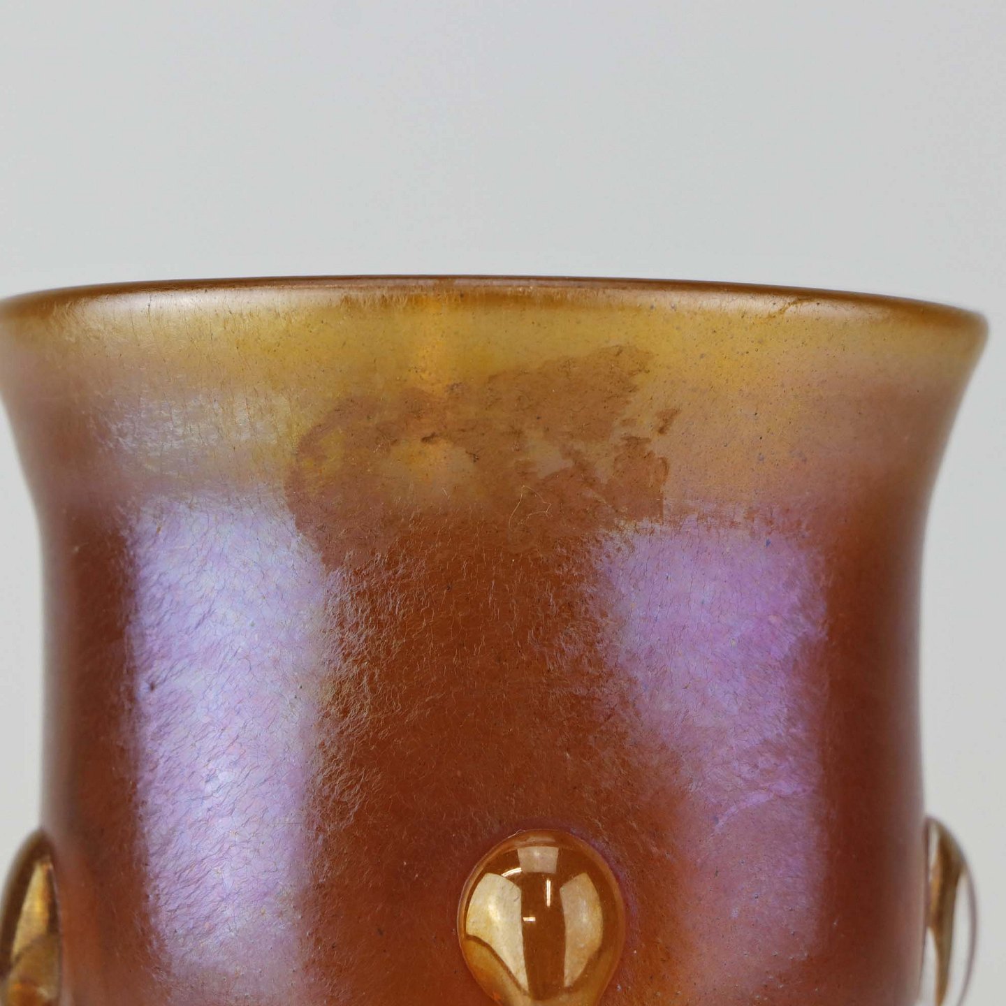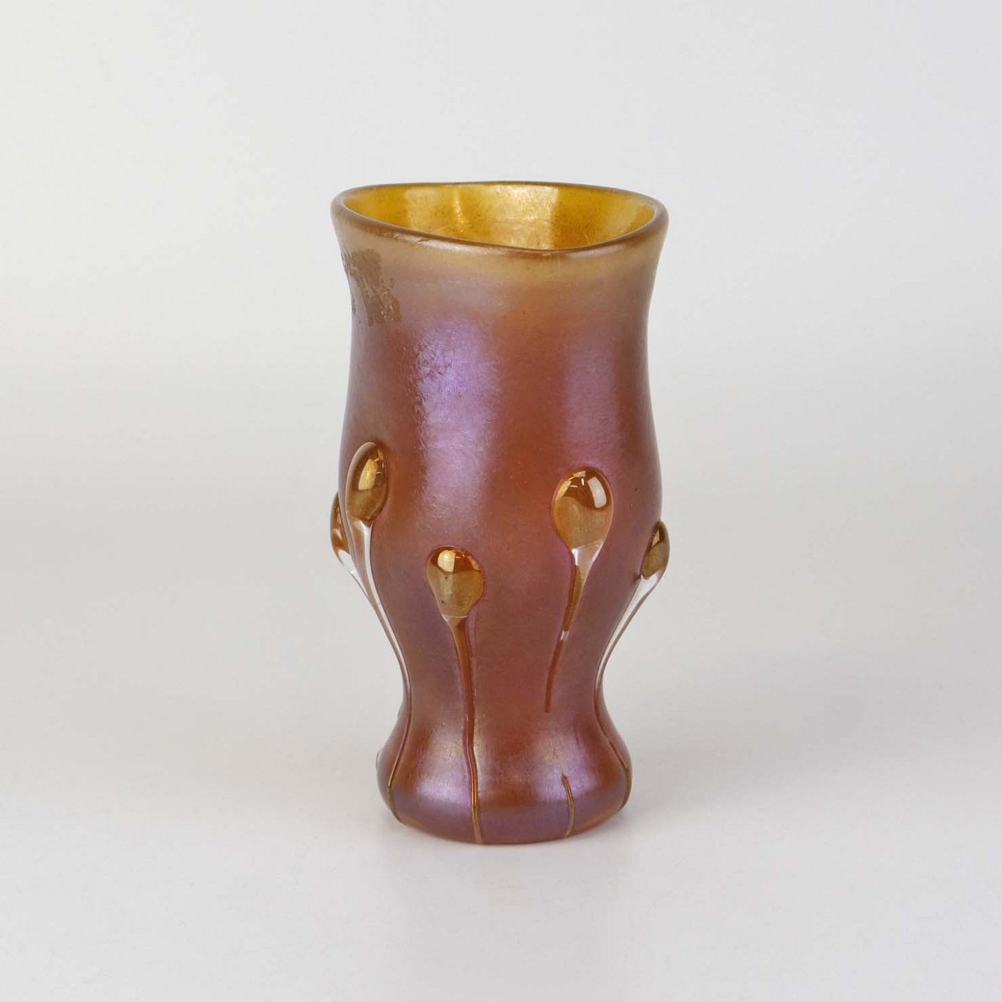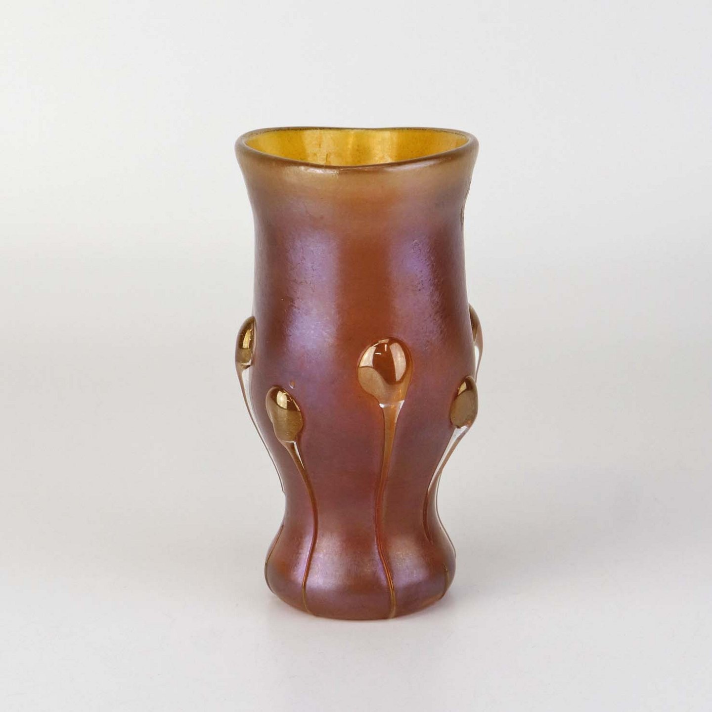 Text zugänglich auf Dänische: Kunstglas vase i Tiffany favrile glas med metallisk orange skær og haletudse dekoration. Model Tadpole.