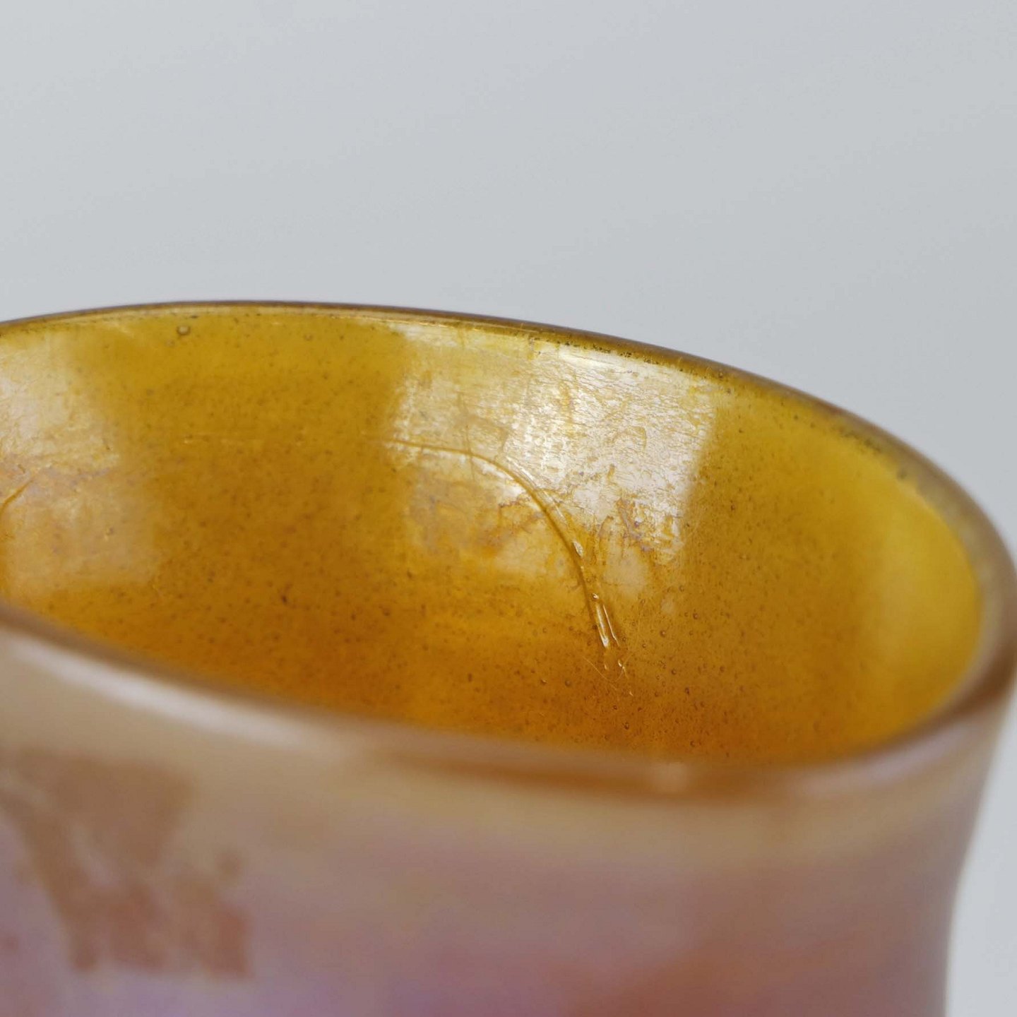Fremstår med ujævnhed i glasset på indevendig side samt klister-rest fra mærkat, som kan fjernes.