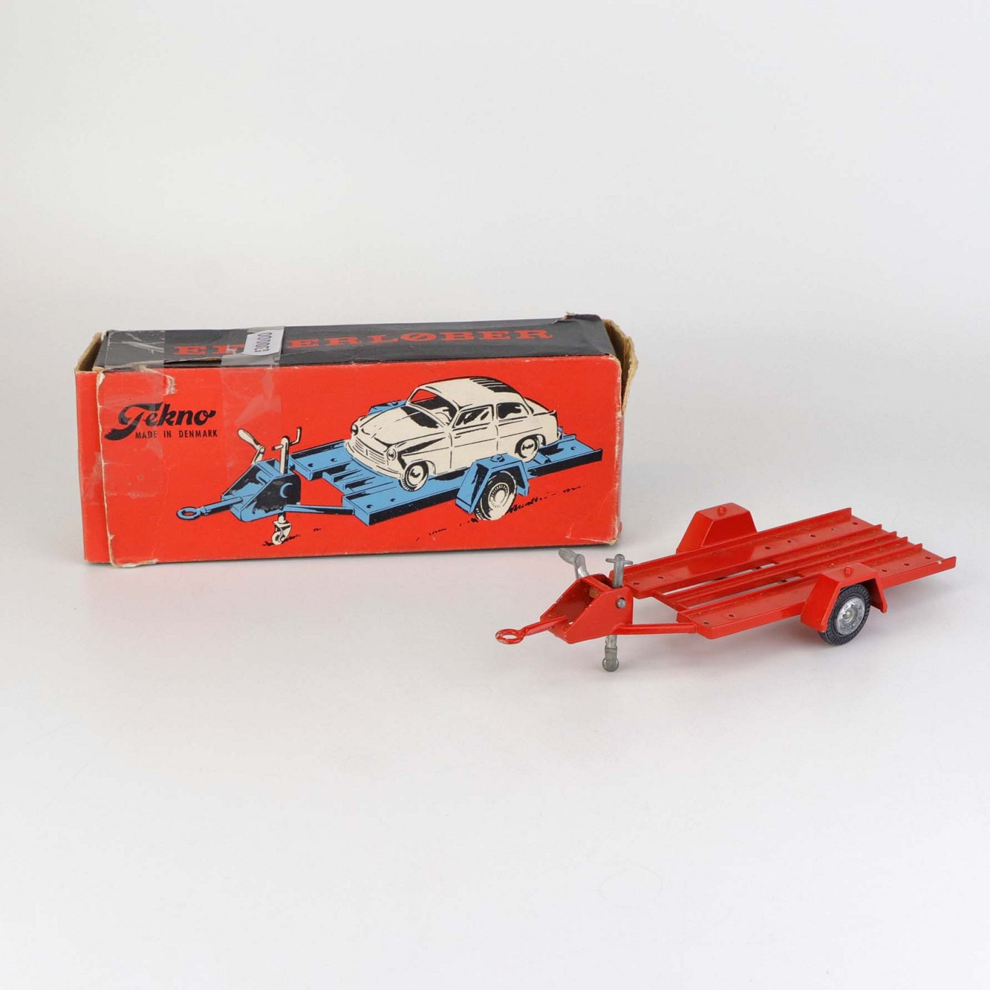 Legetøjsbil. Biltrailer model Efterløber fra falck serien i rødlakeret metal med gummi hjul samt original boks. Nr. 437