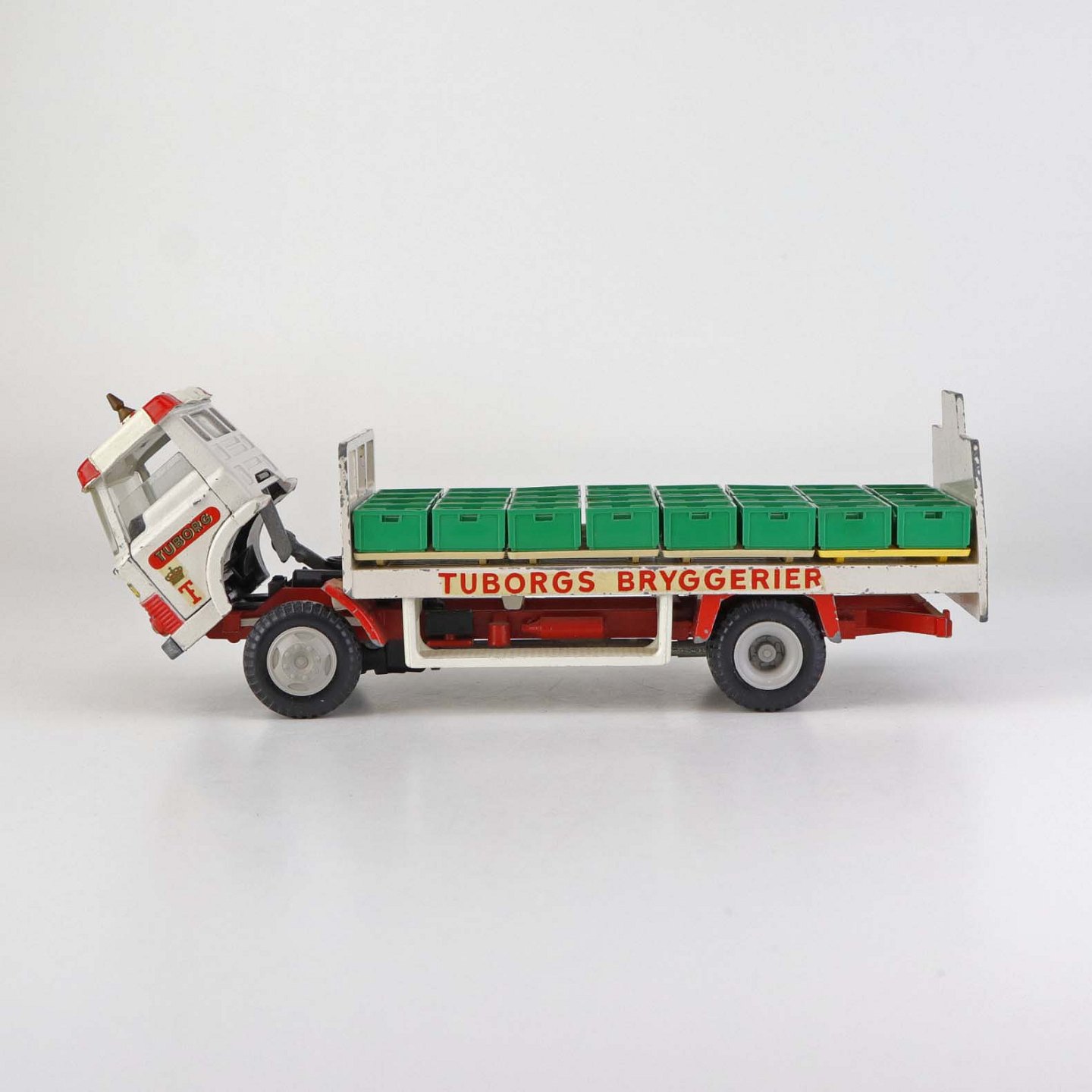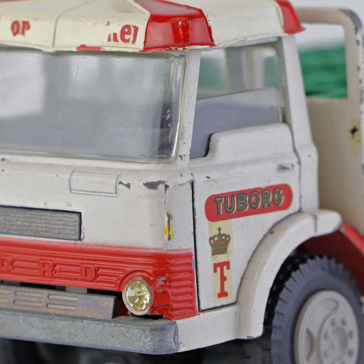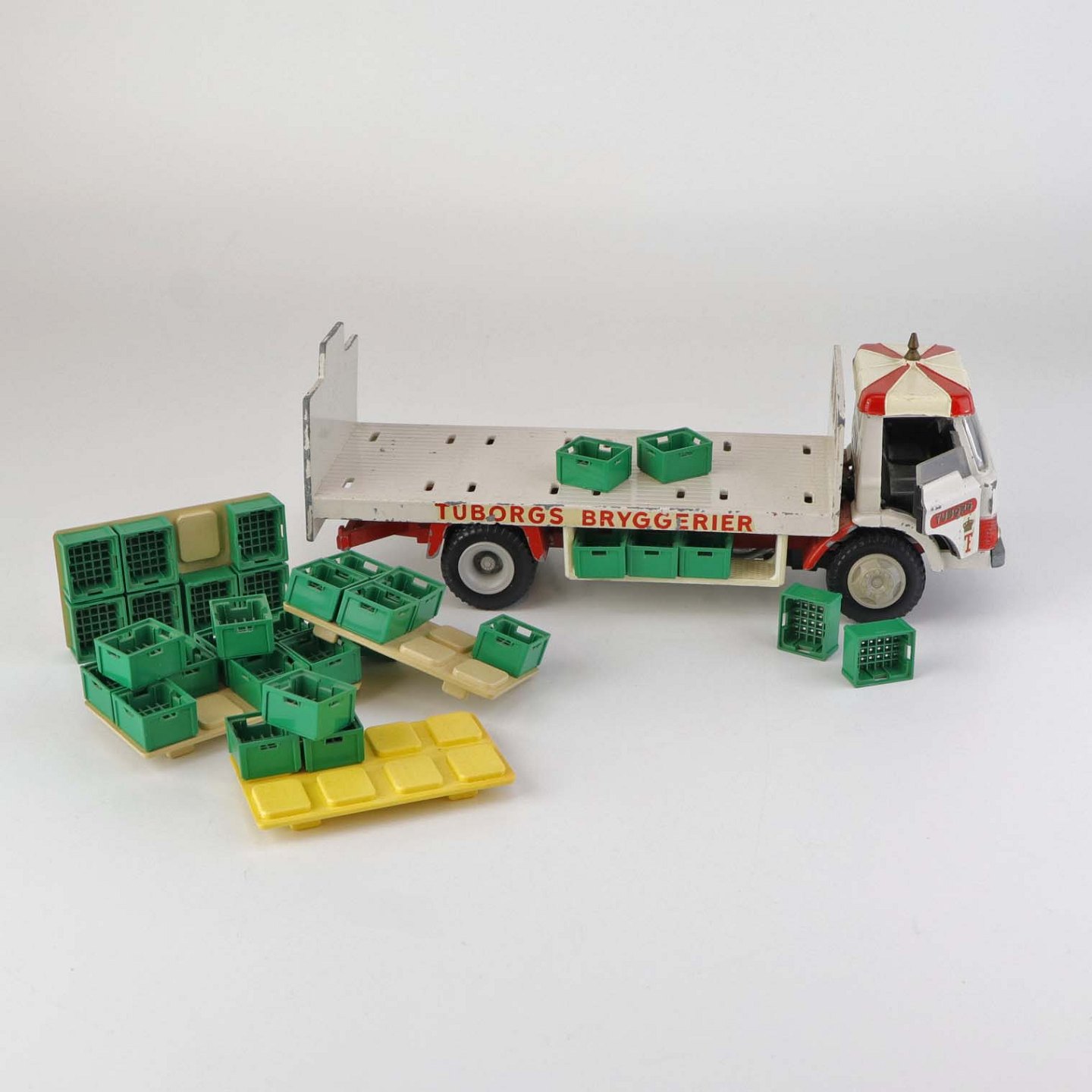 Ford D-800 legetøjsbil. Grøn Tuborg ølbil med i hvidlakeret metal med gummi hjul og 32 ølkasser i plast.
