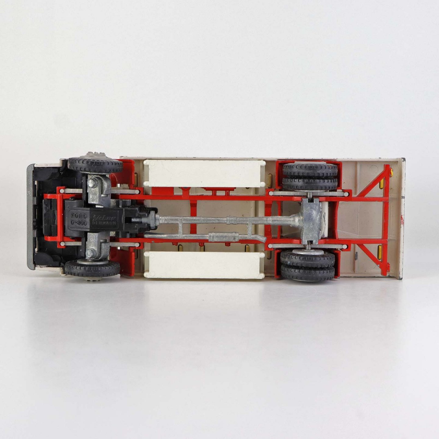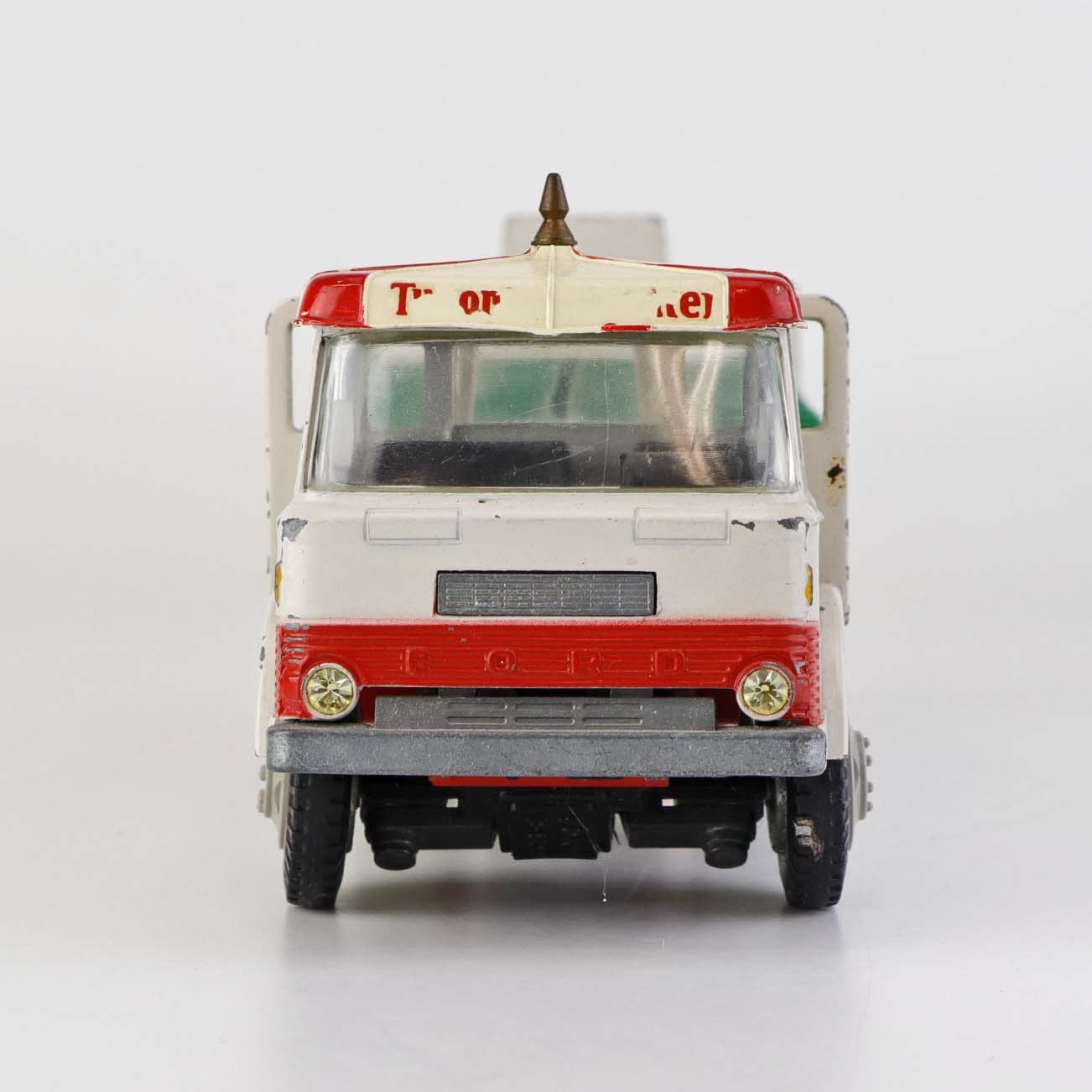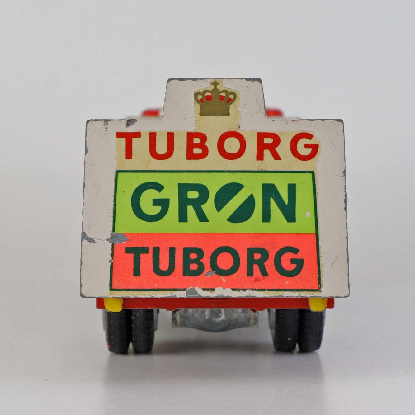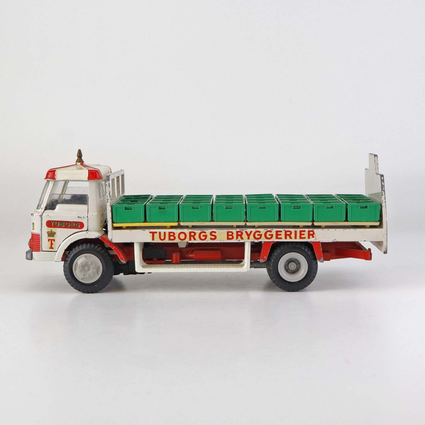 Ford D-800 legetøjsbil. Grøn Tuborg ølbil med i hvidlakeret metal med gummi hjul og 32 ølkasser i plast.