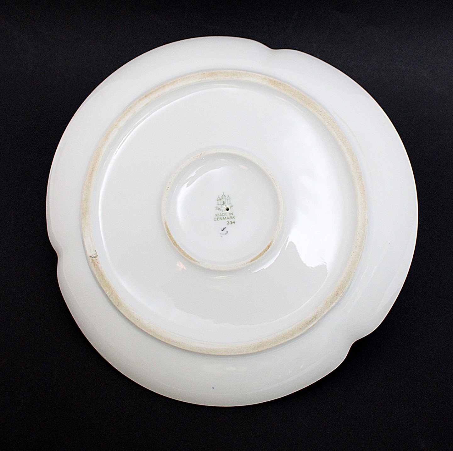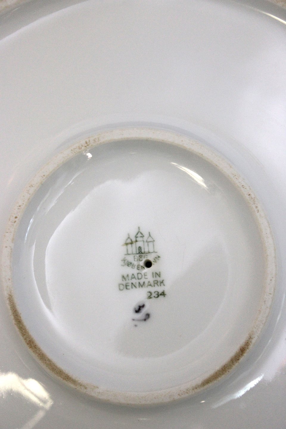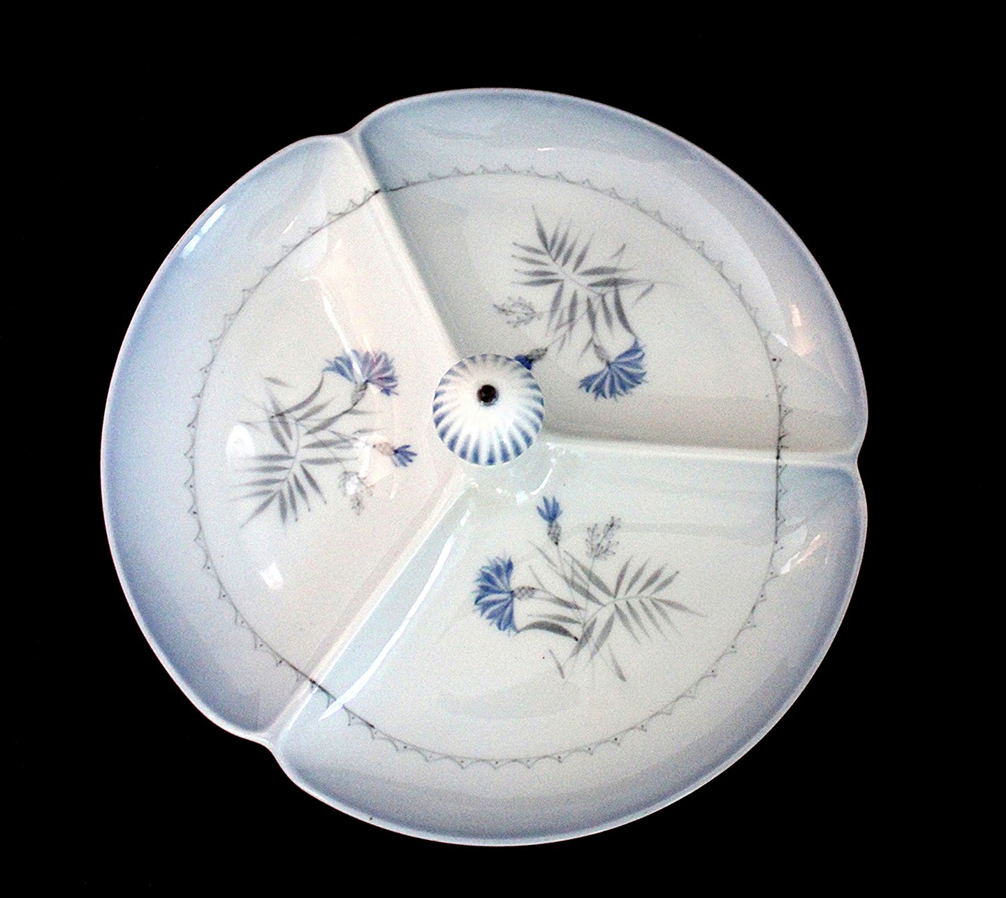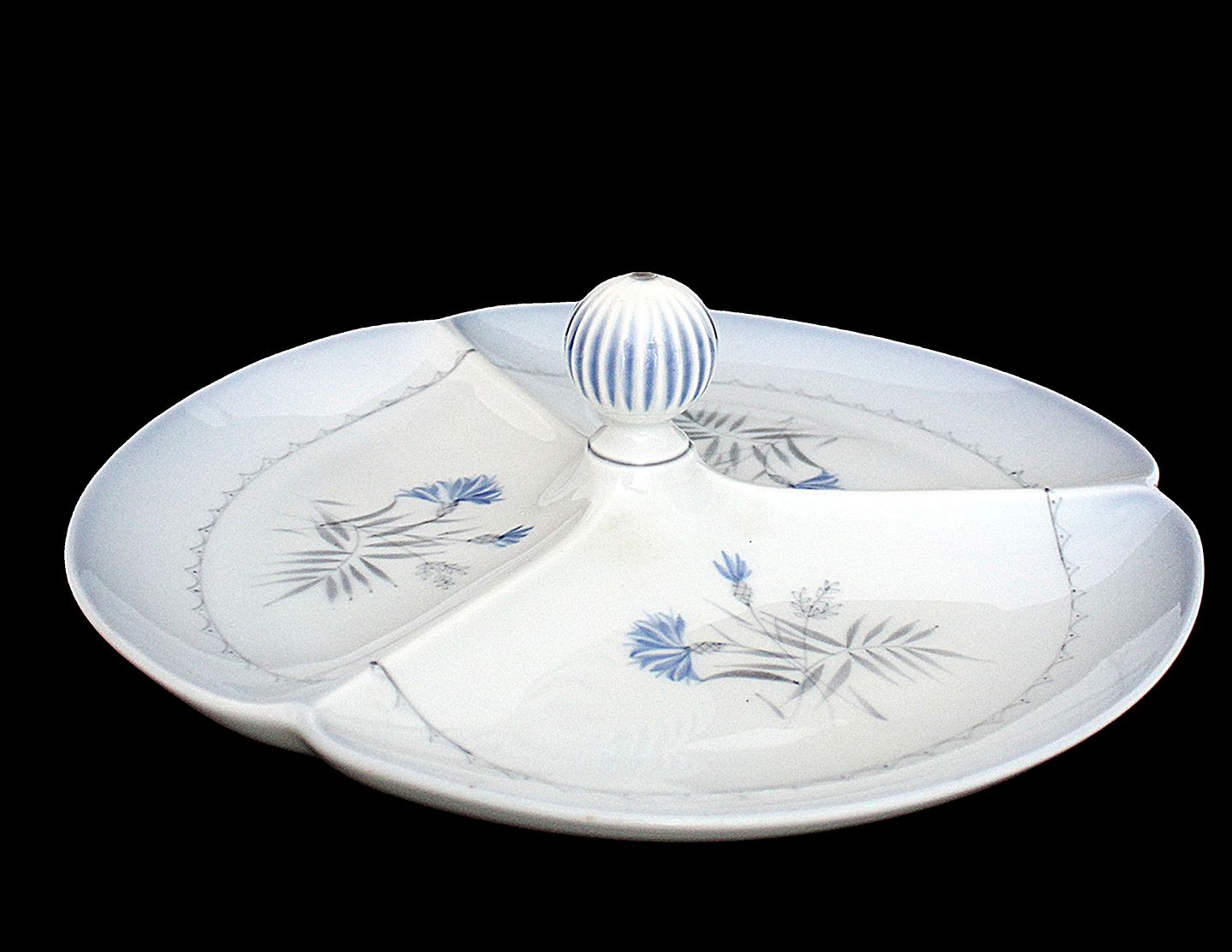 Text zugänglich auf Dänische: Bing & Grøndahl, Demeter, blå tone. Cabaretfad, Kabaretfad, meget sjælden. Inddelt med 3 rum og knop som håndtag. Nr. 234. Højde 10cm. Diameter 27 cm. Pris: 1150 kr. stk. Lager: 1