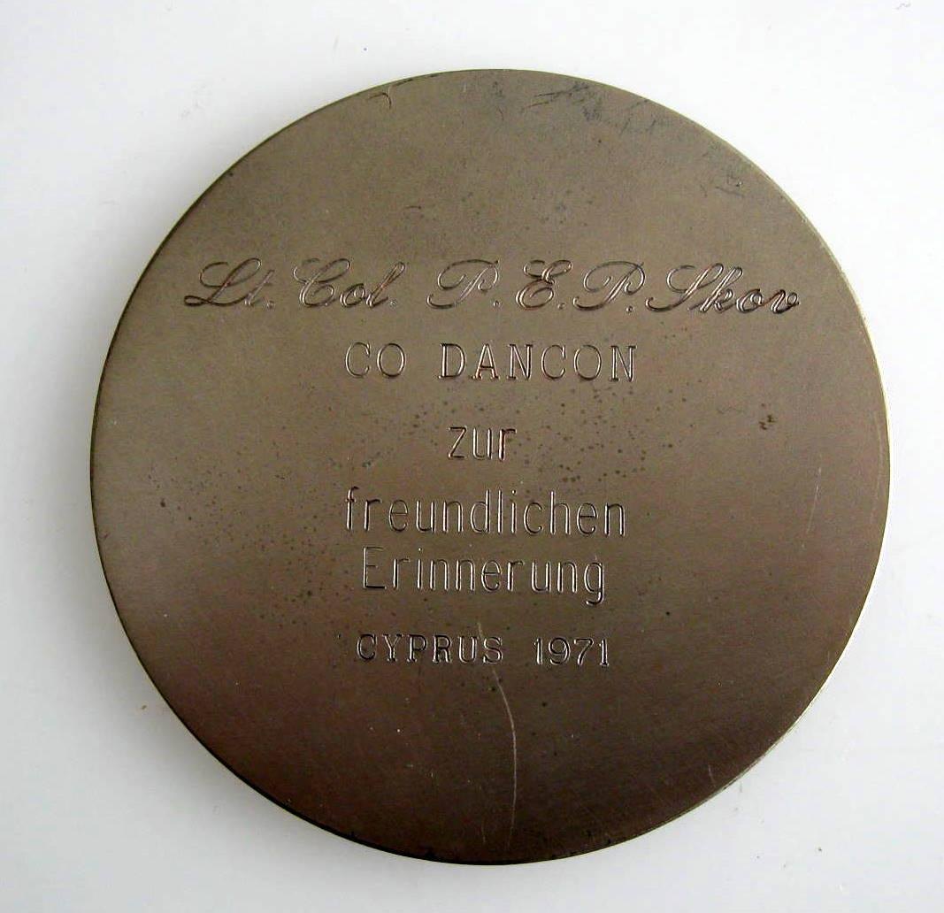 UN-Medaille - Vereinte Nationen Zivilpolizei - UNICYP. Österreichisches Kontingent. Dia:. 7,5 cm. Metall mit Emaille. Mit der Aufschrift:. Lt. Col. PEP Skov CO DANCON zur freundlichen Erinnerung, Zypern 1971. In origniales Etui. Provenienz: Oberstleutnant Poul Ervin O. Skov, Kommandant Dancon XIV, Zypern.