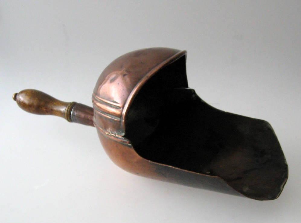 Kornmass-Gerät aus Kupfer. 19. Jh. Dänemark. Stiel aus gedrehtem Buchenholz. L.: 39 cm.
