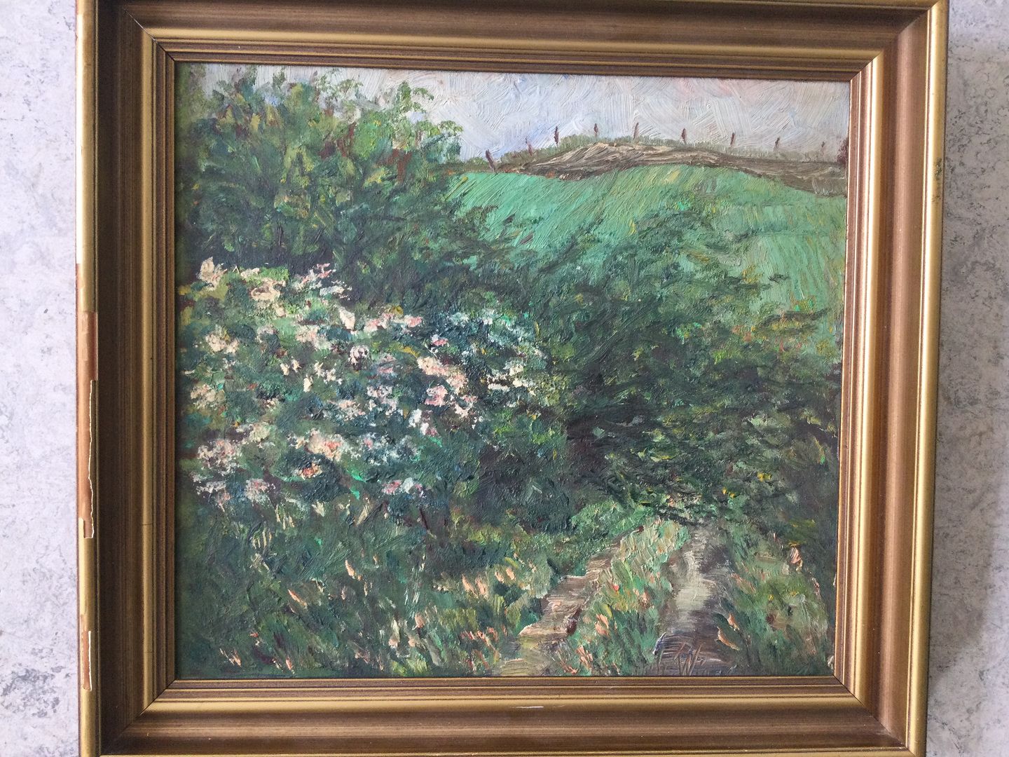 Text zugänglich auf Dänische: Maleri af Richard Wissntal - Landskab med blomstrende busk.