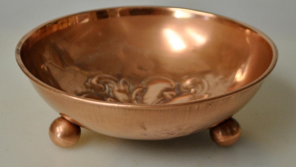Kupferschale, 19. Jahrhundert. Auf drei Kugelbeinen. Mit Blumendekor. H: 4 cm. Durchmesser: 13 cm.