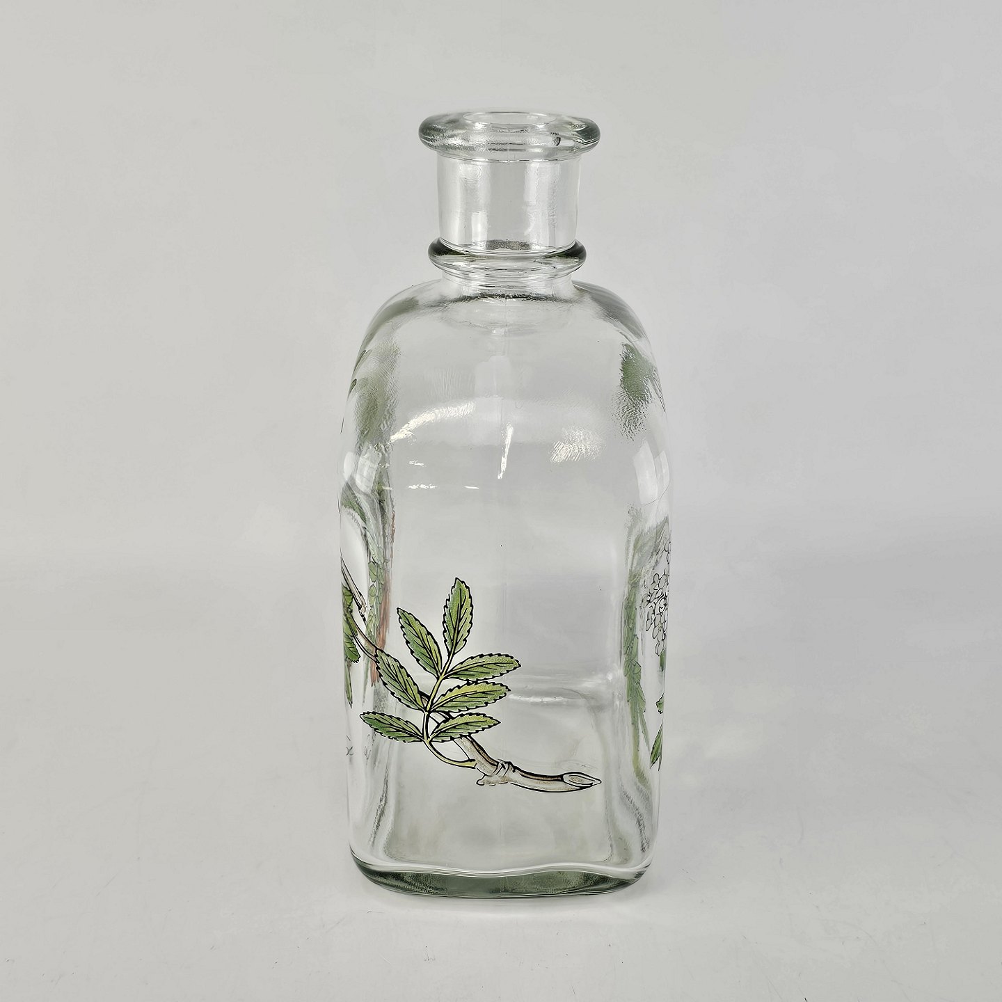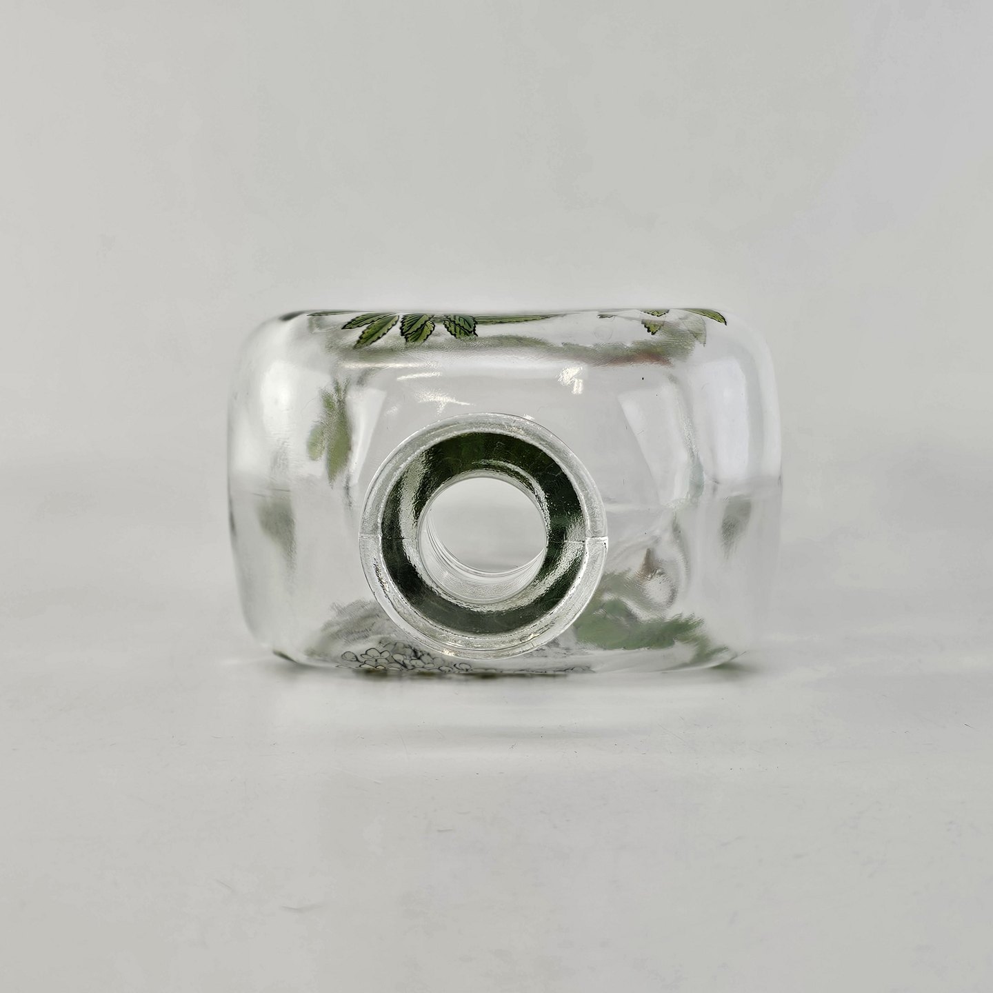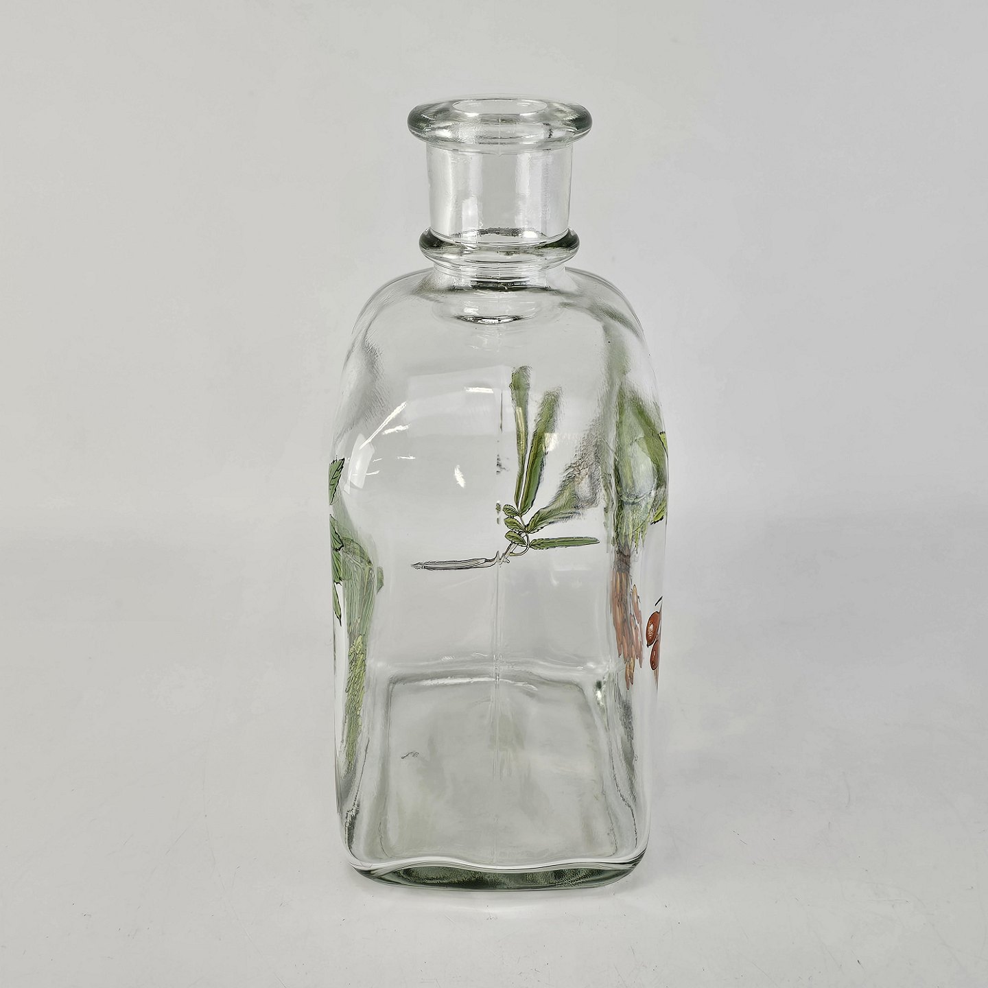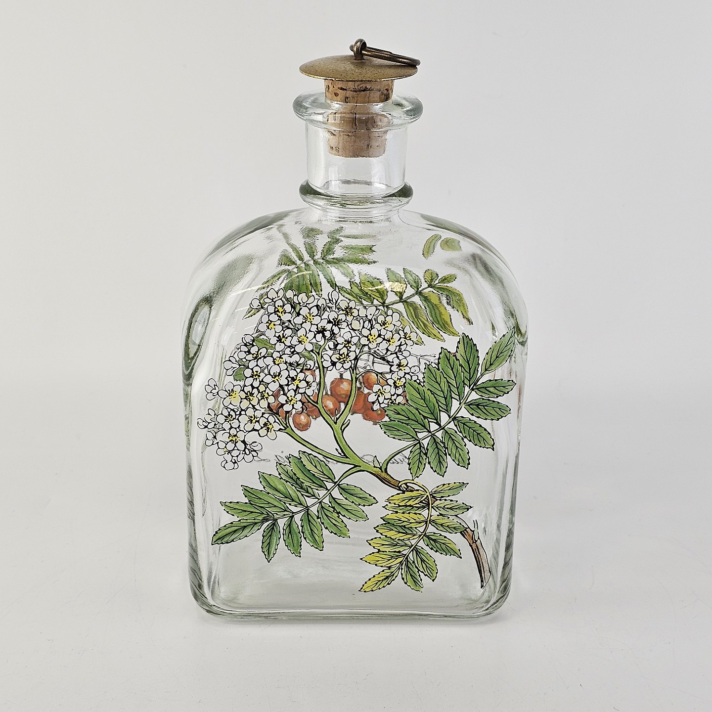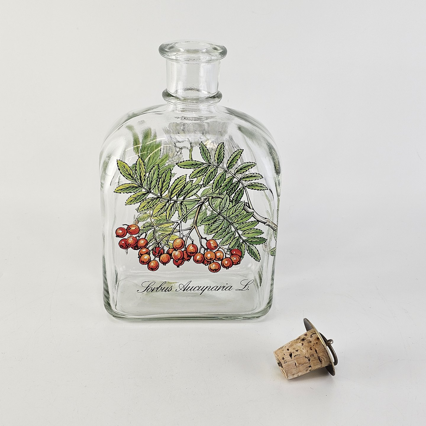 Text zugänglich auf Dänische: Karaffel i klart glas med korkprop fra serien Brændevins Amatøren, dekoreret med en gren af rønnebær og teksten Sorbus Aucuparia L.