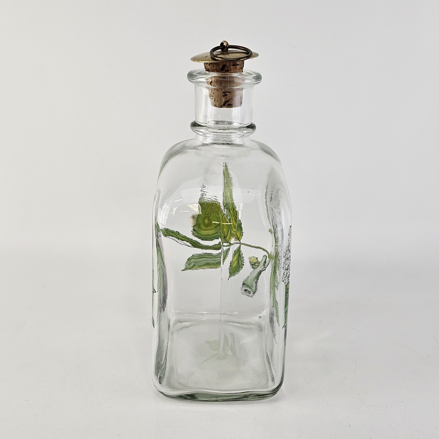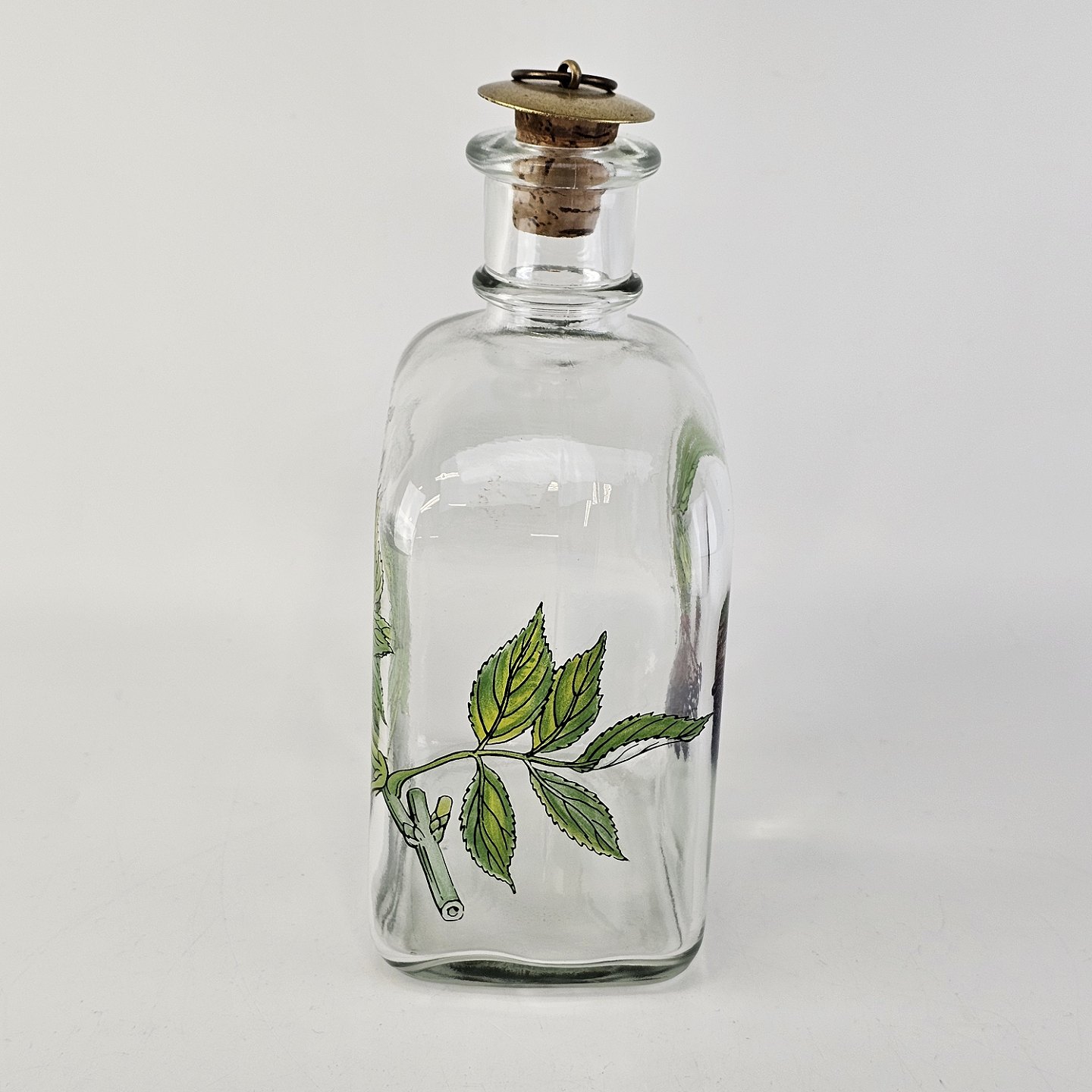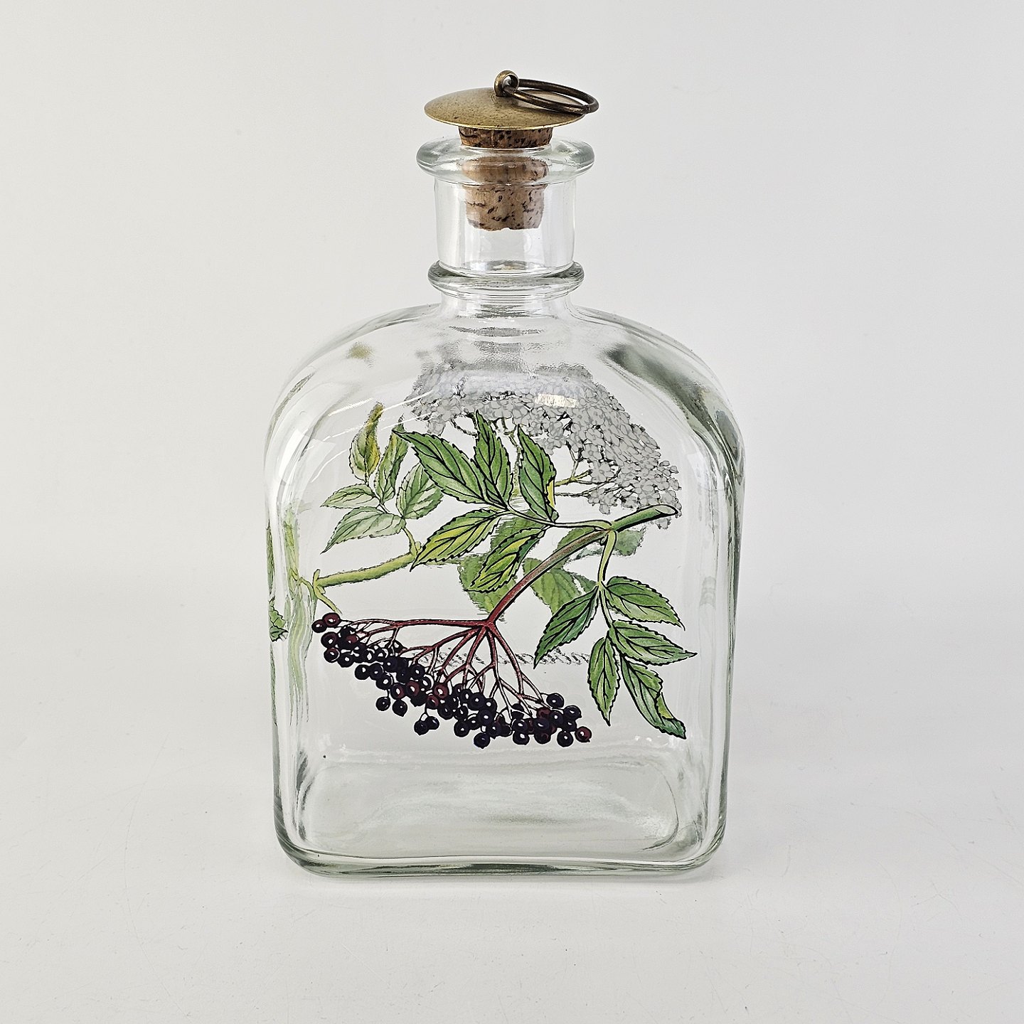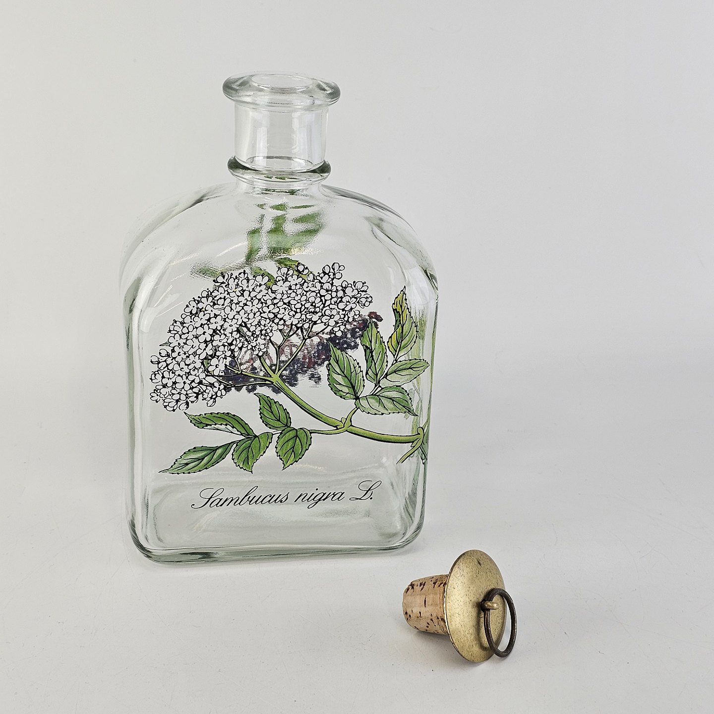 Text zugänglich auf Dänische: Karaffel i klart glas med korkprop fra serien Brændevins Amatøren, dekoreret med en gren af hyldeblomst og teksten Sambucus Nigra L.