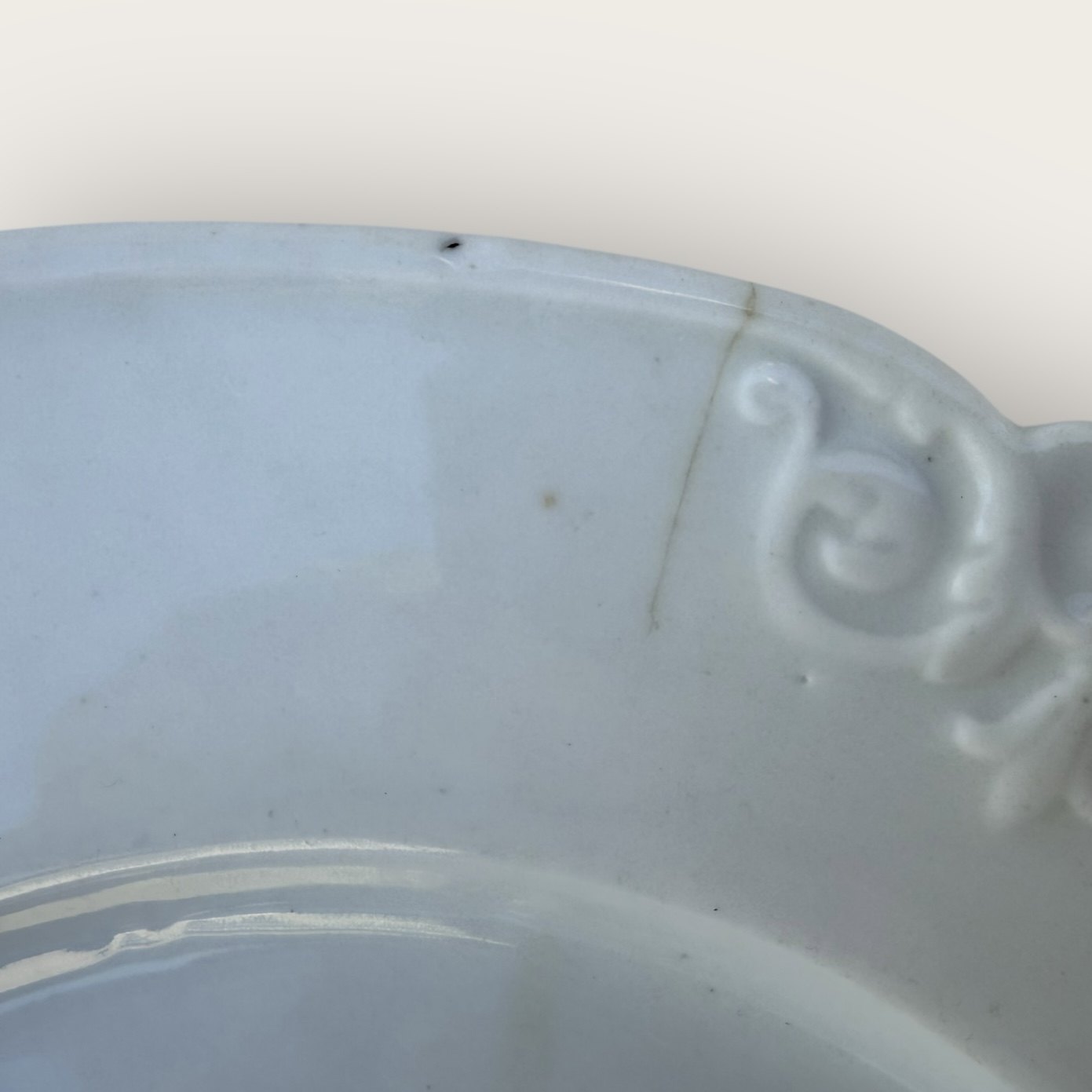 Royal Copenhagen, Rokoko weiß, flacher Teller, 26 cm Durchmesser, hat einen kleinen Haarriss (siehe Foto)