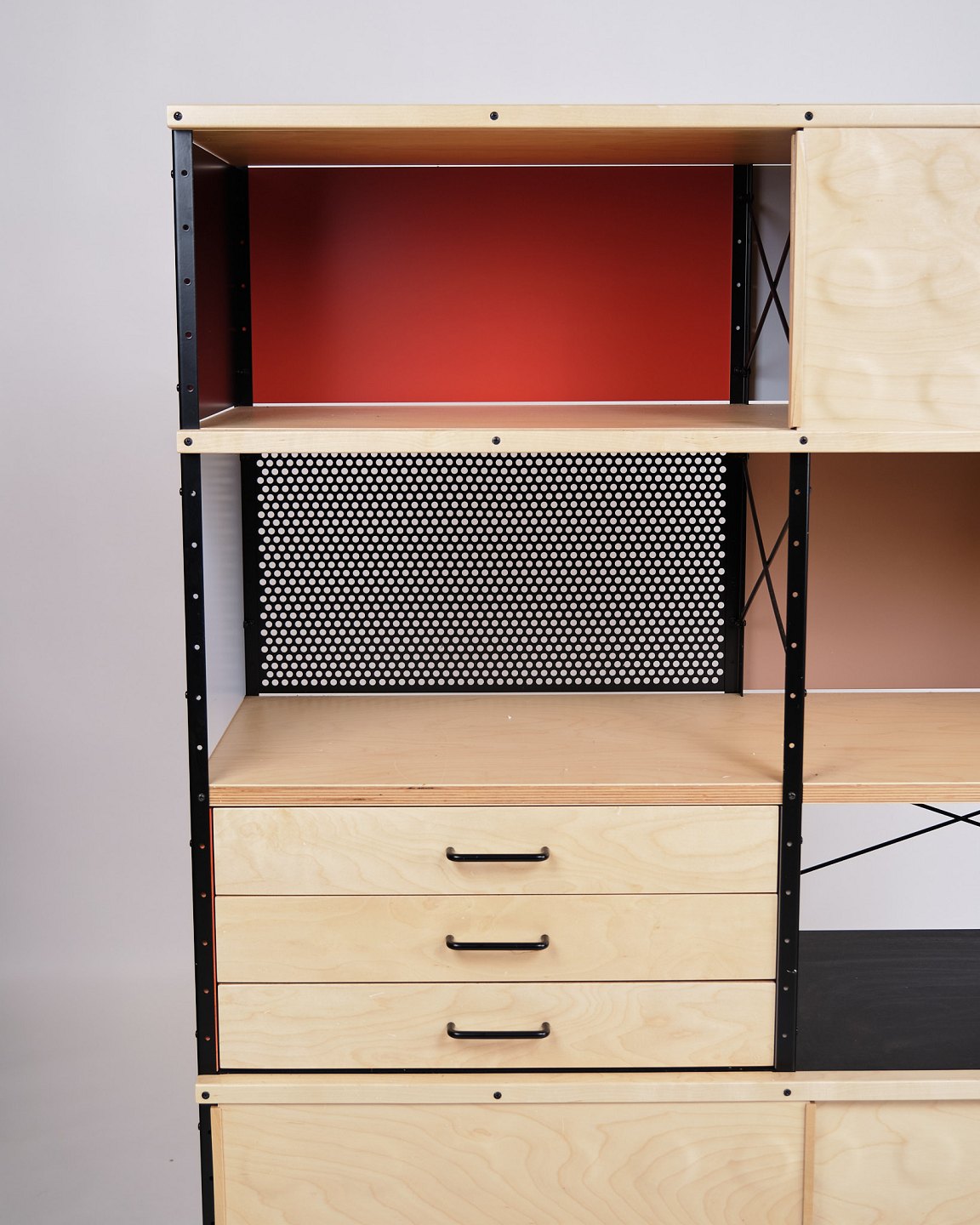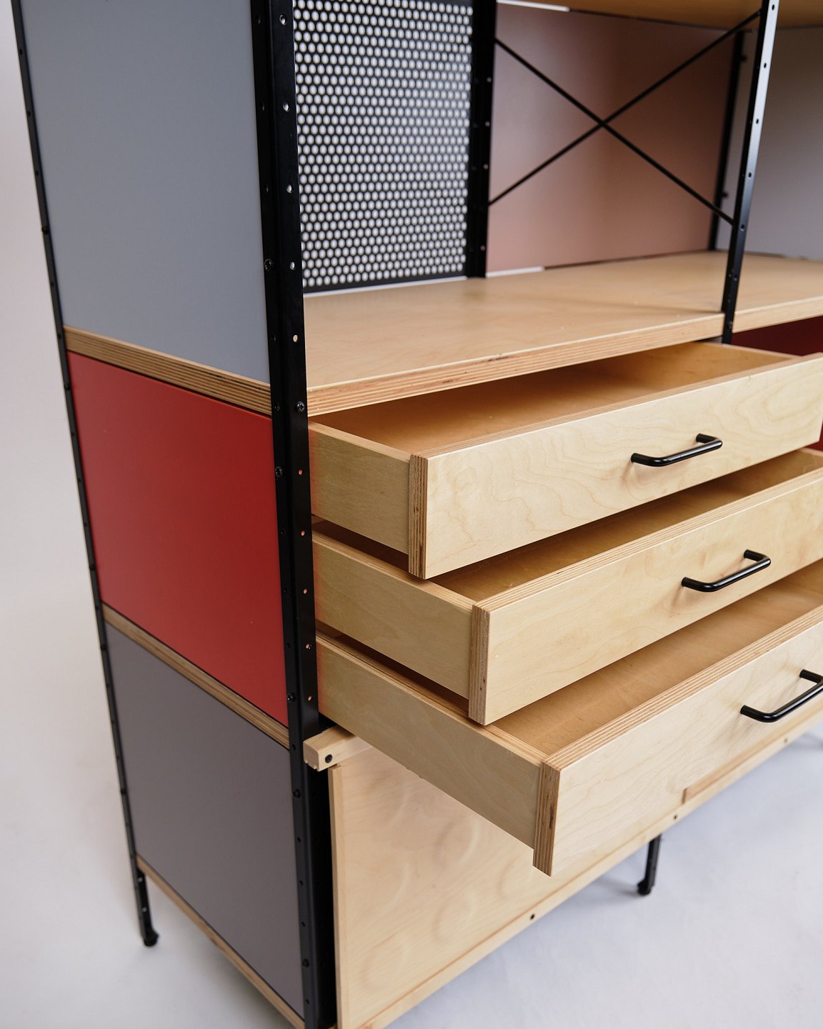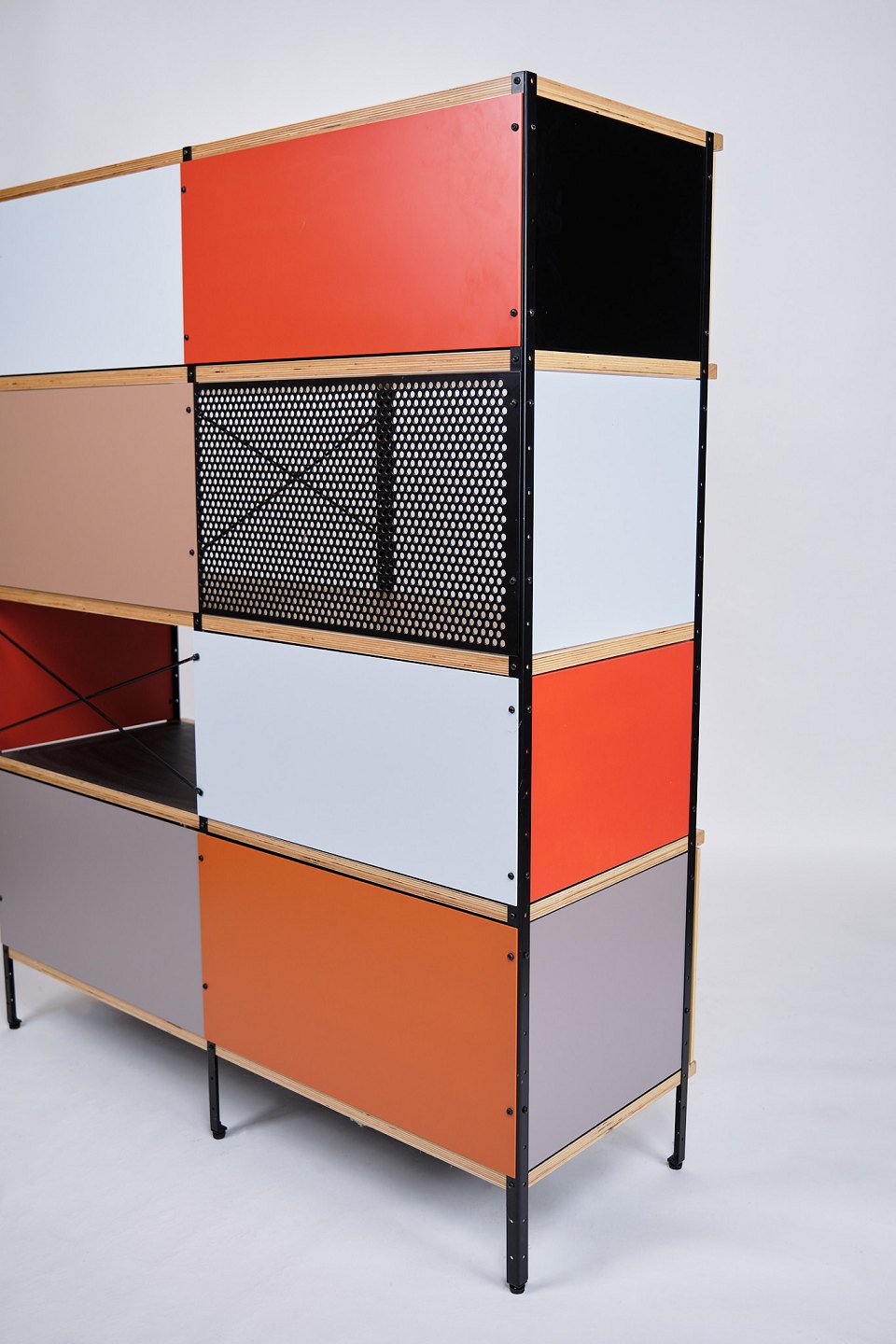 Text zugänglich auf Dänische: ESU bogreol designet af Charles og Ray Eames i 1949 og produceret af Vitra. Reolen er udført i ahorn og birketræ med et grafisk, modulært udtryk, som kombinerer funktionalitet og tidløs modernisme.
