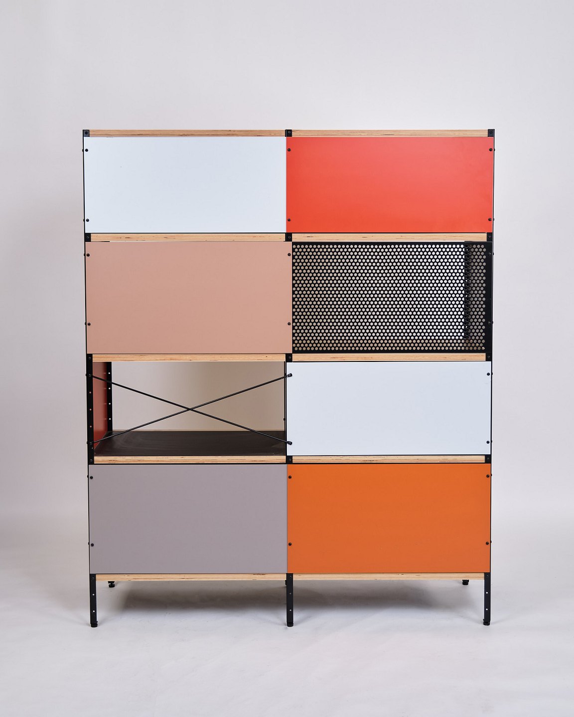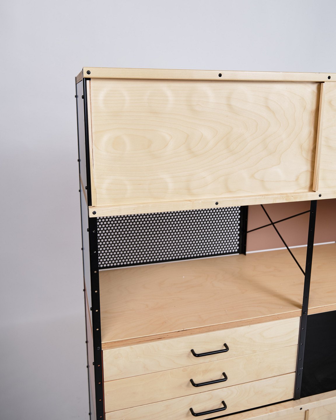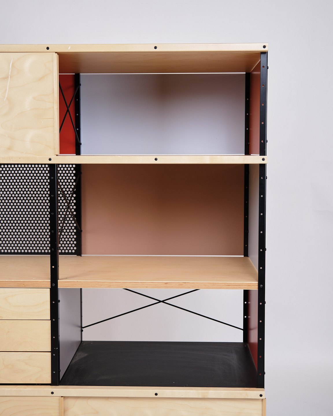 Text zugänglich auf Dänische: ESU bogreol designet af Charles og Ray Eames i 1949 og produceret af Vitra. Reolen er udført i ahorn og birketræ med et grafisk, modulært udtryk, som kombinerer funktionalitet og tidløs modernisme.