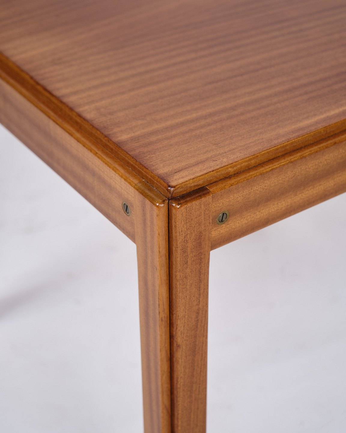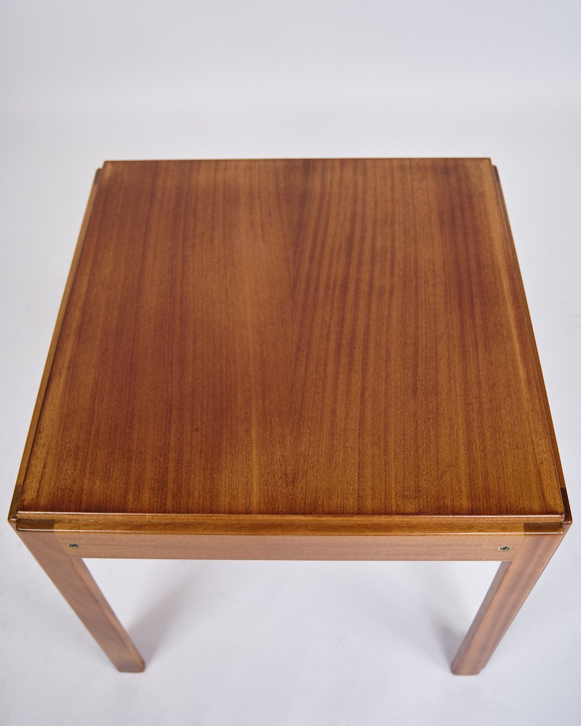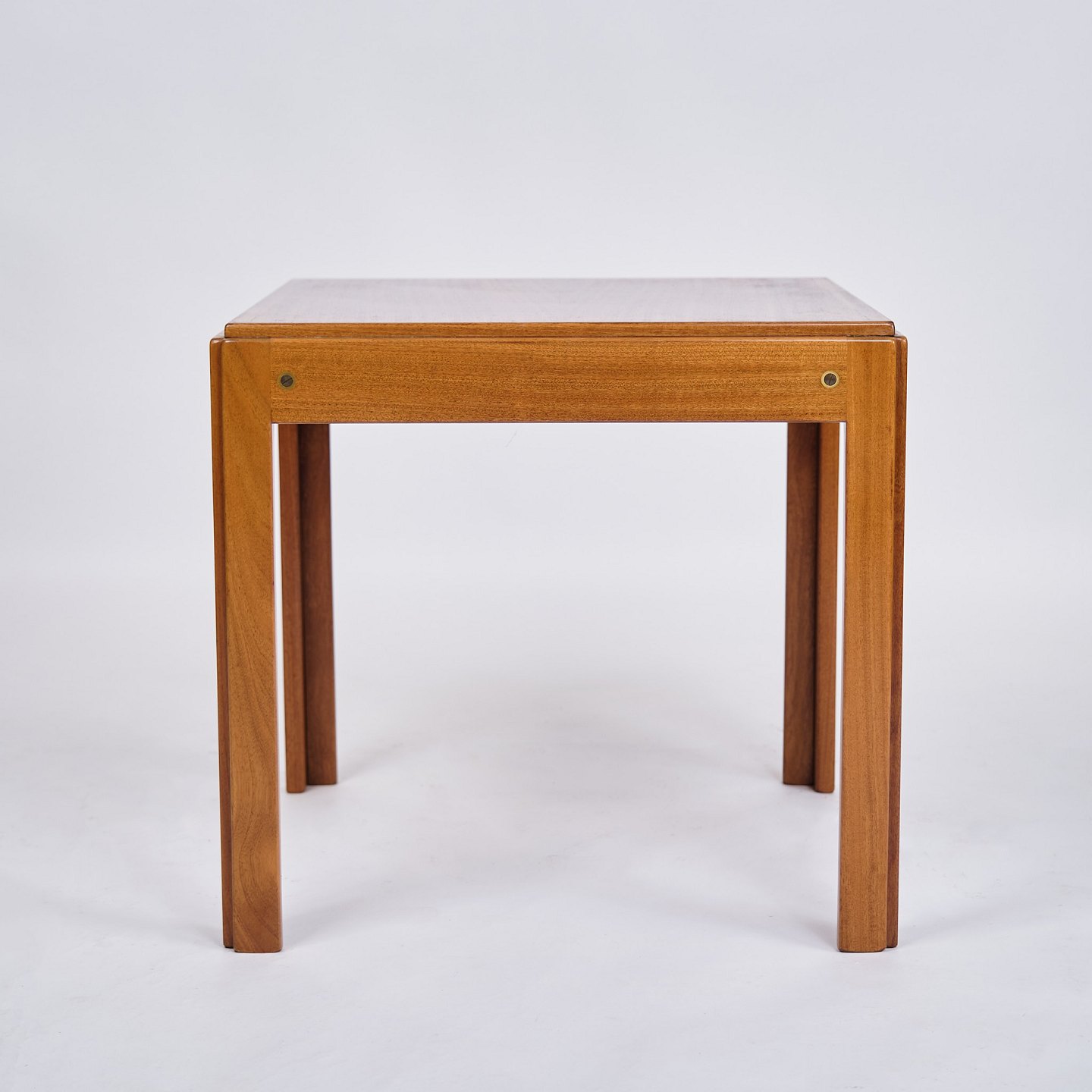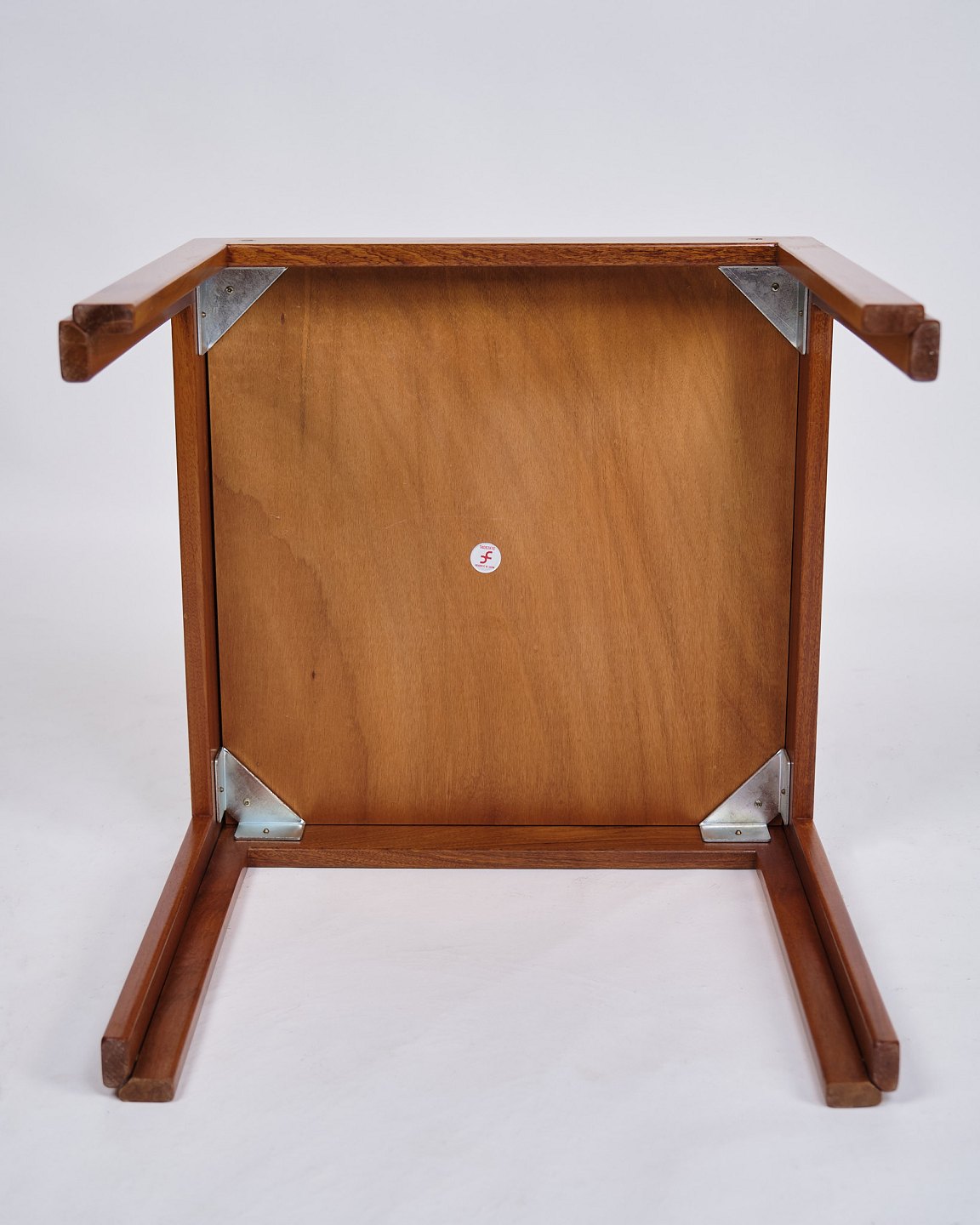 Text zugänglich auf Dänische: Kvadratisk teaktræsbord af Illum Wikkelsø. Dansk design fra 1960’erne med tidløst formsprog.