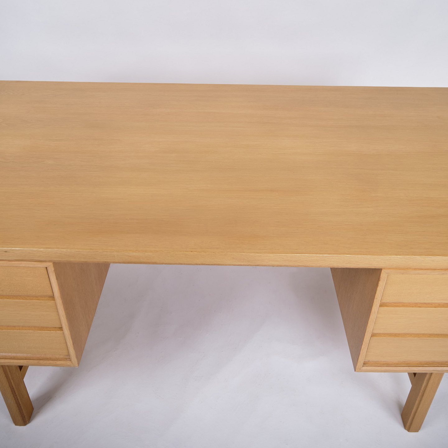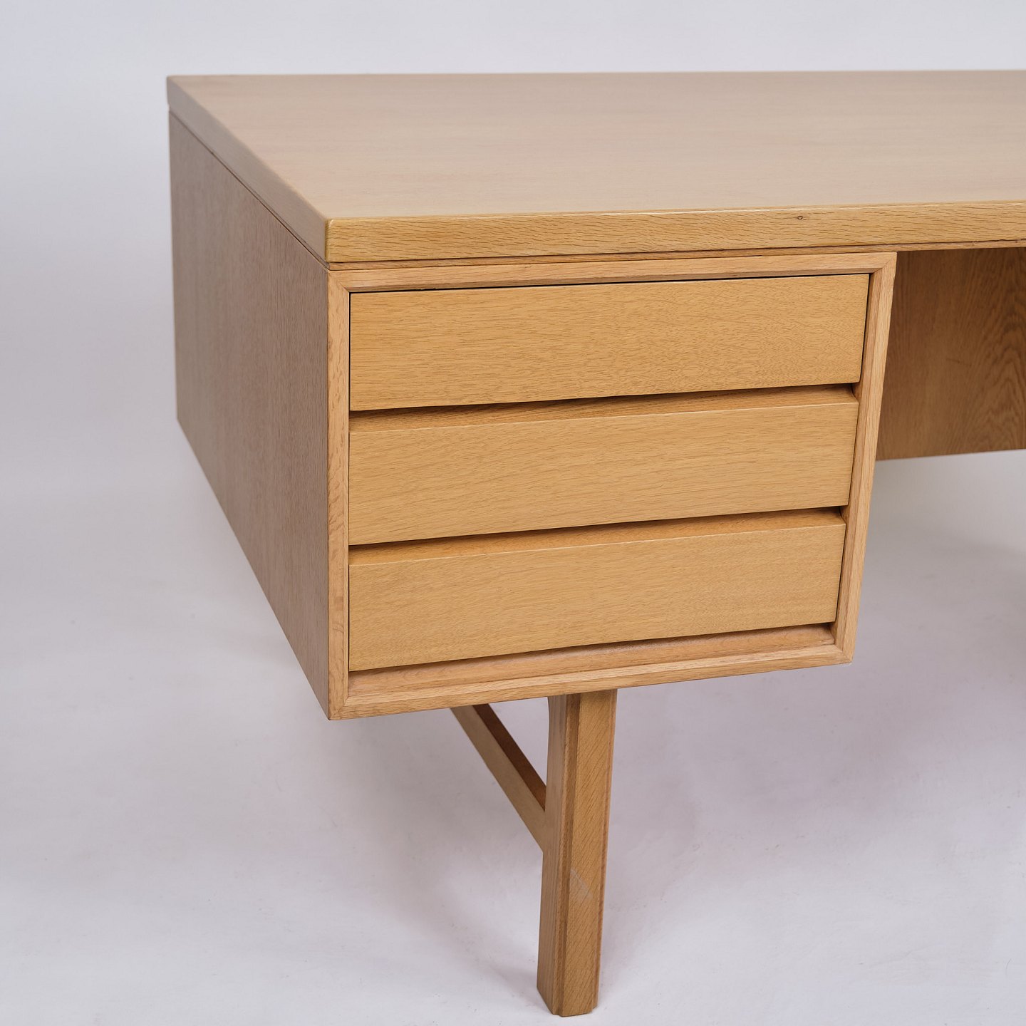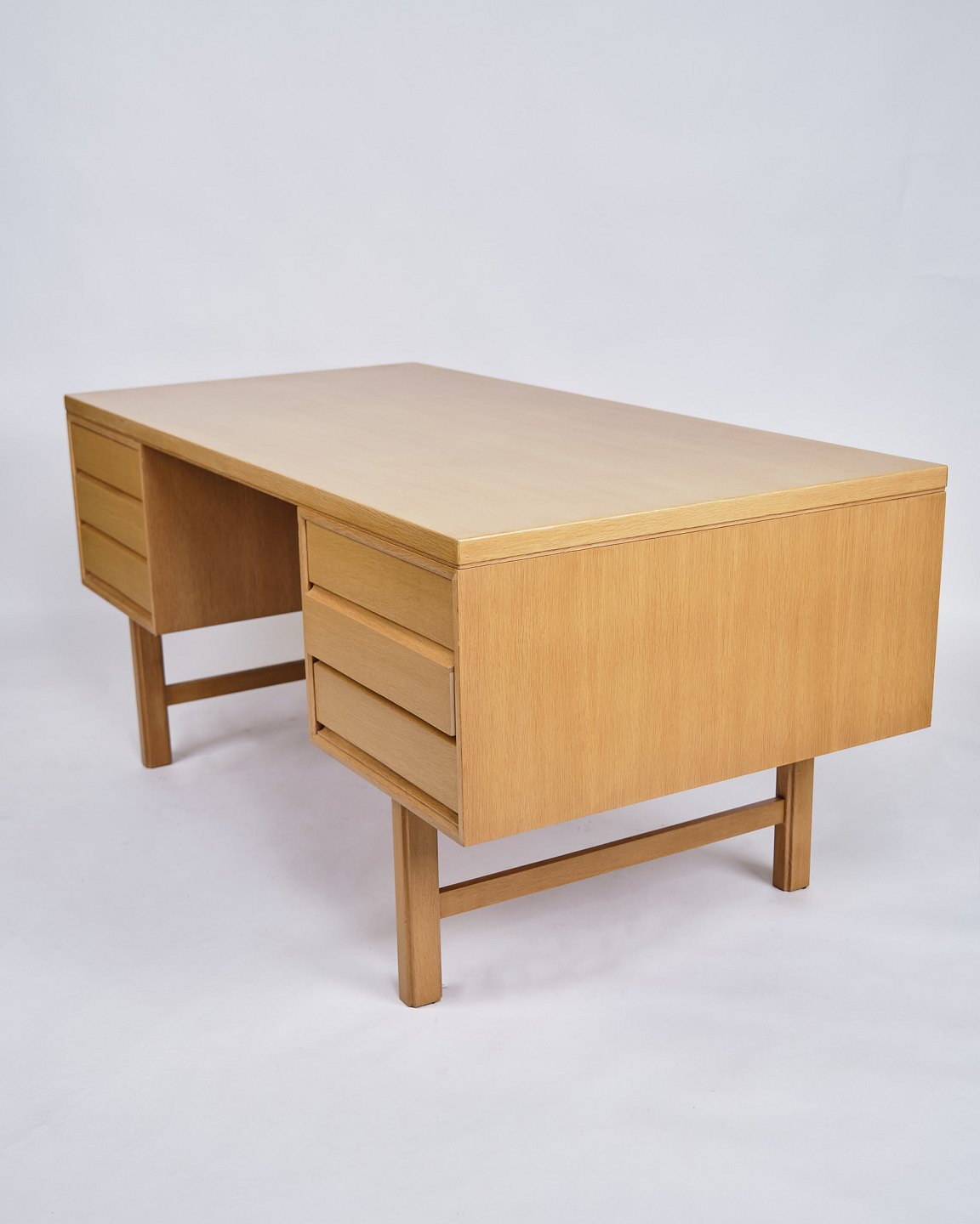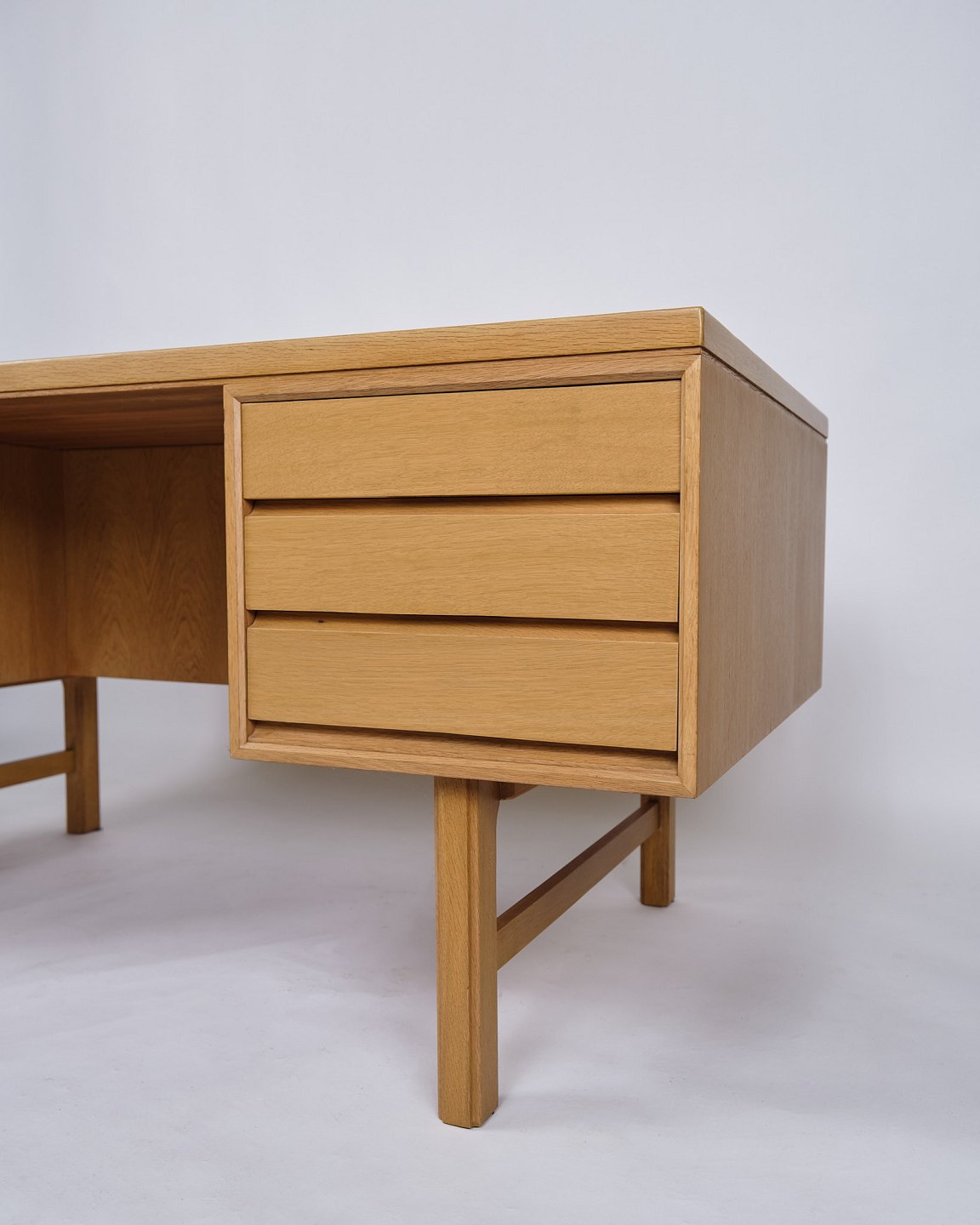 Text zugänglich auf Dänische: Fritstående skrivebord i egetræ af Omann Junior. Seks skuffer og klassisk dansk design fra 1960’erne.