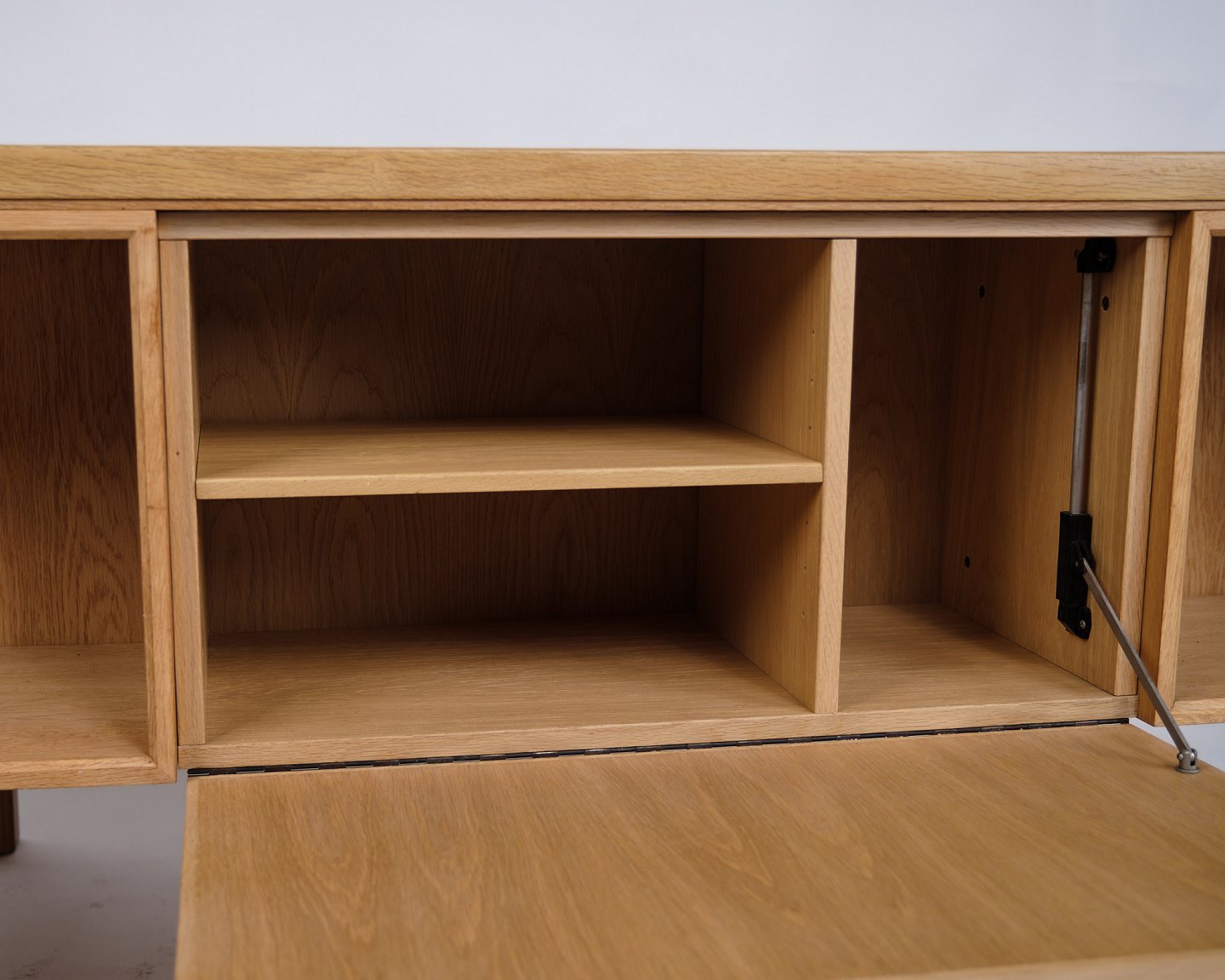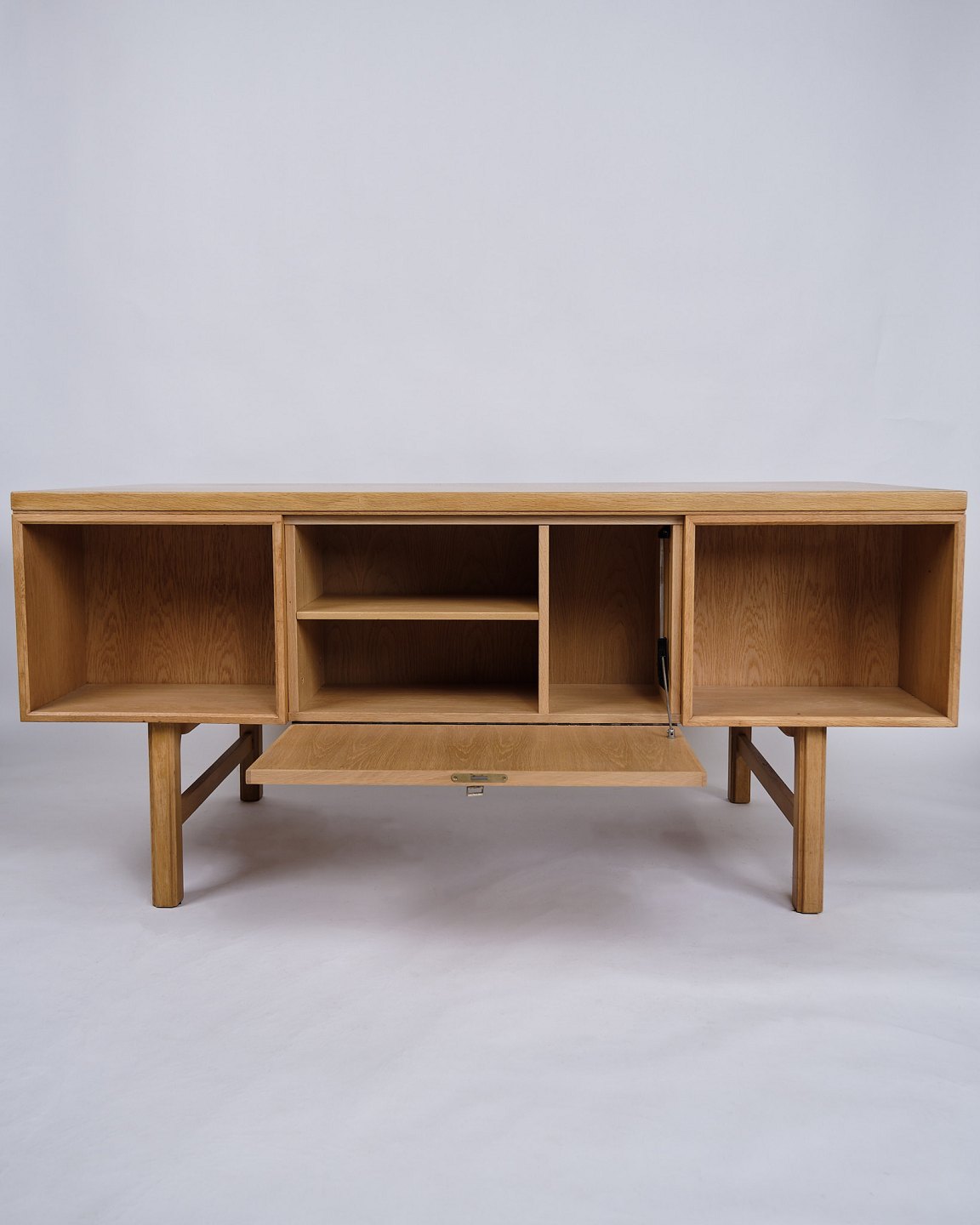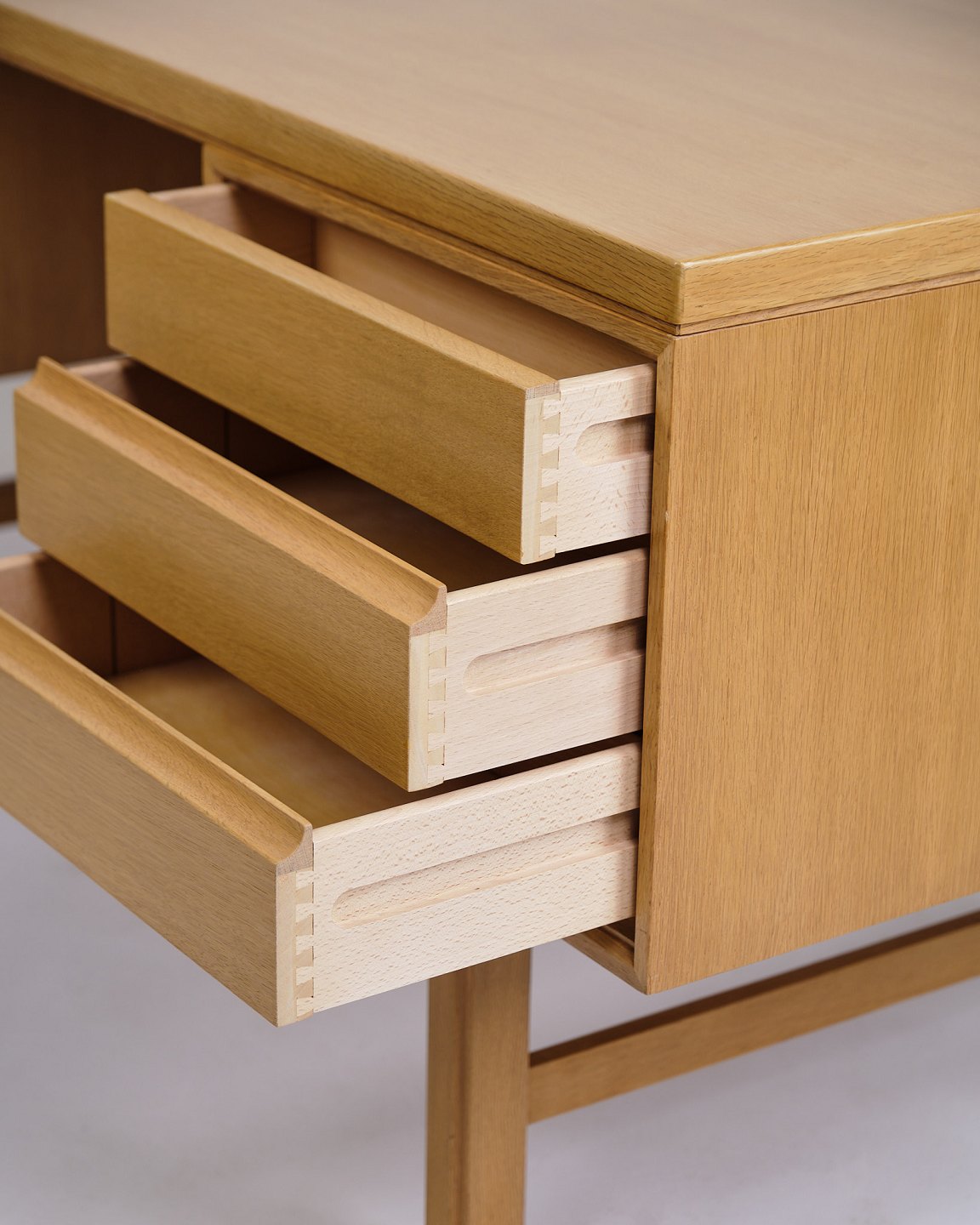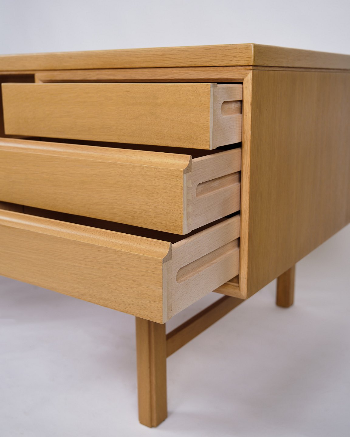 Text zugänglich auf Dänische: Fritstående skrivebord i egetræ af Omann Junior. Seks skuffer og klassisk dansk design fra 1960’erne.