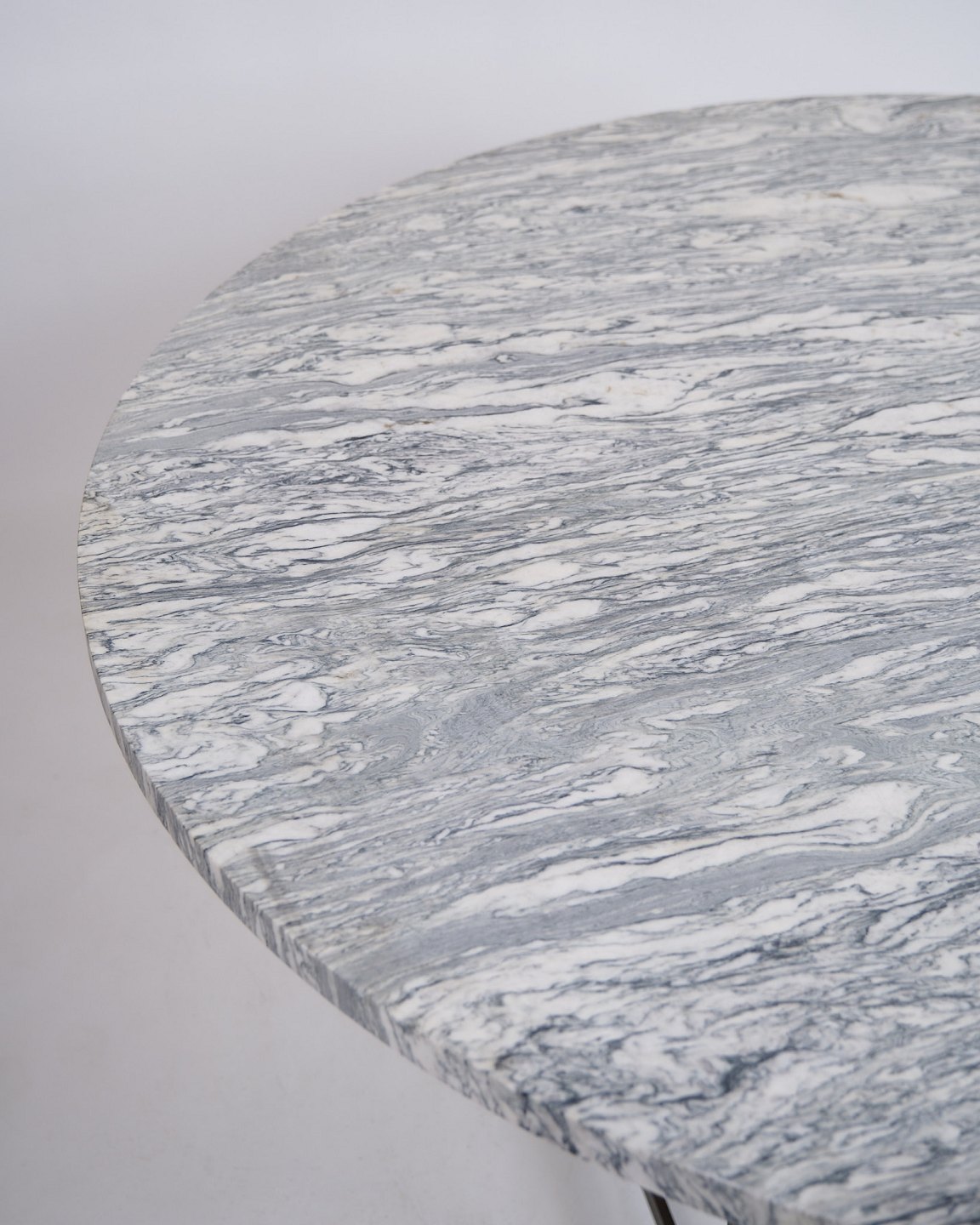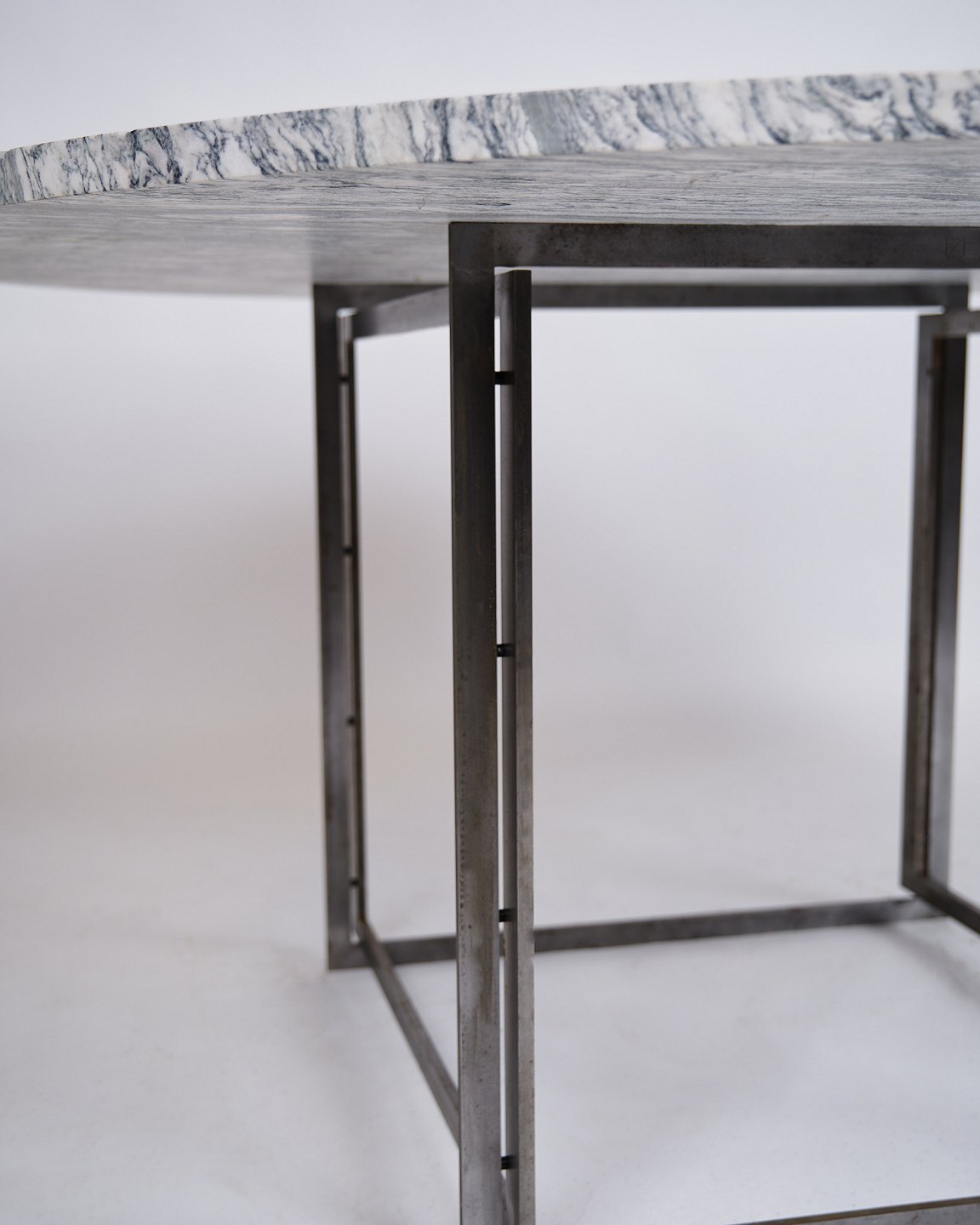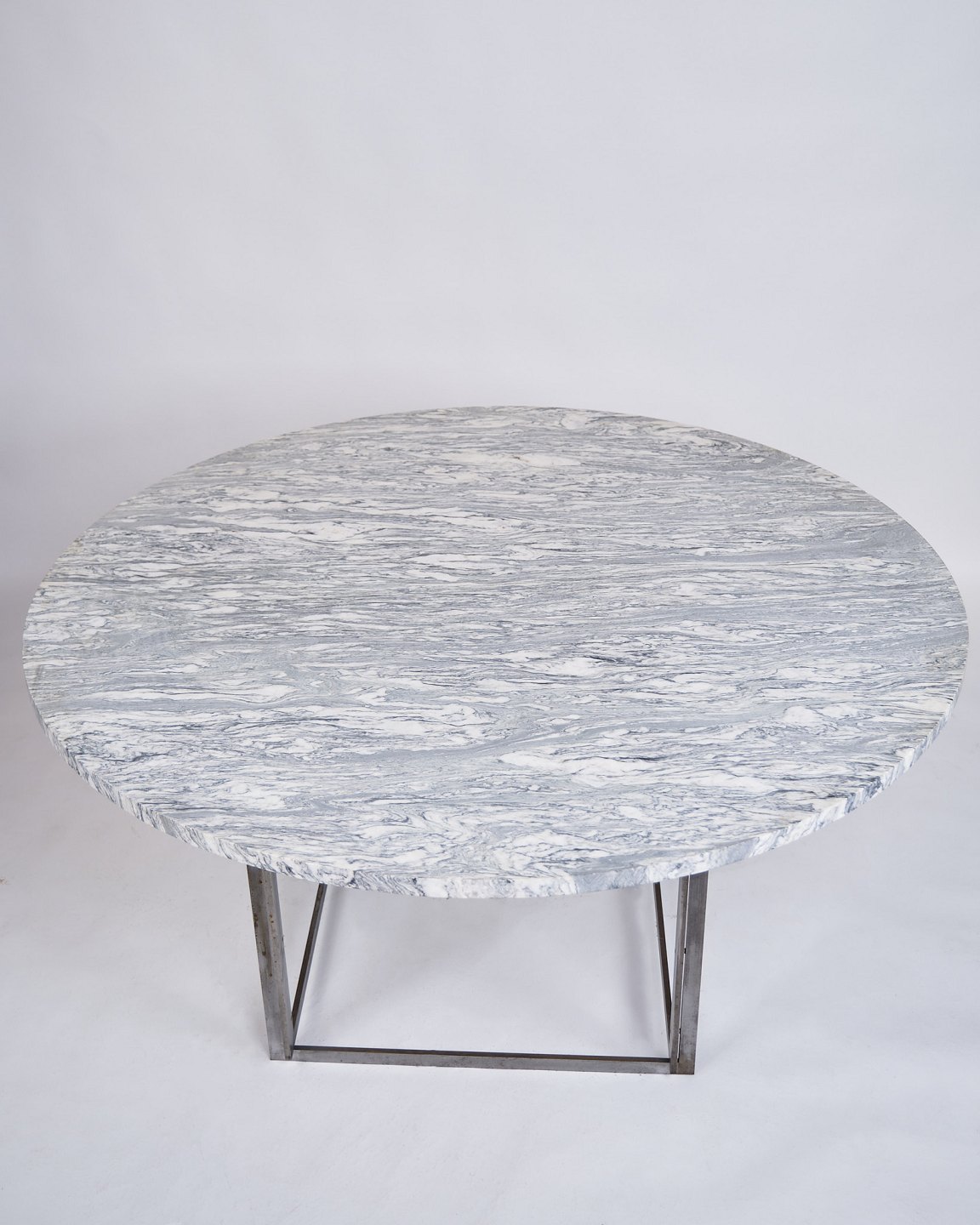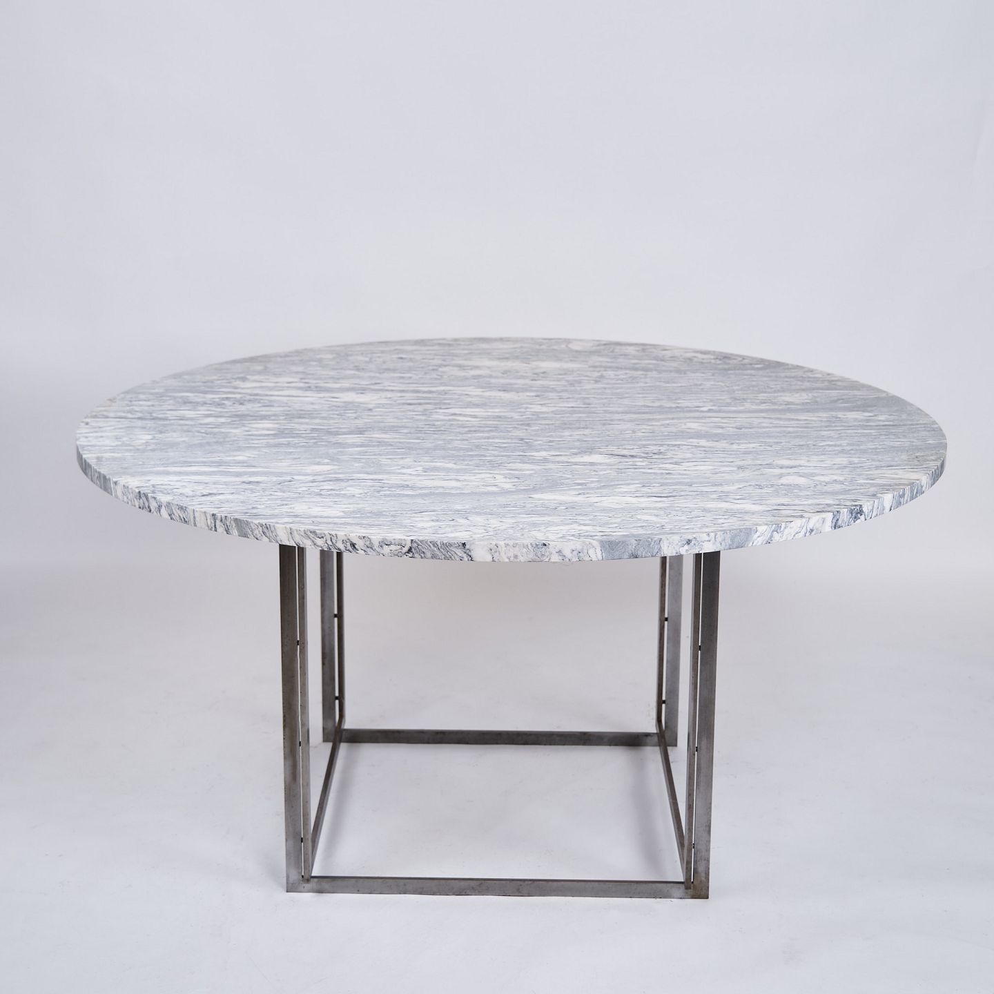 Text zugänglich auf Dänische: Sjældent spisebord, model PK54, designet af Poul Kjærholm og produceret af E. Kold Christensen i 1960’erne. Bordet er udført med en massiv rund cipollini-marmorplade, båret af et stålstel, karakteristisk for Kjærholms minimalistiske formsprog.