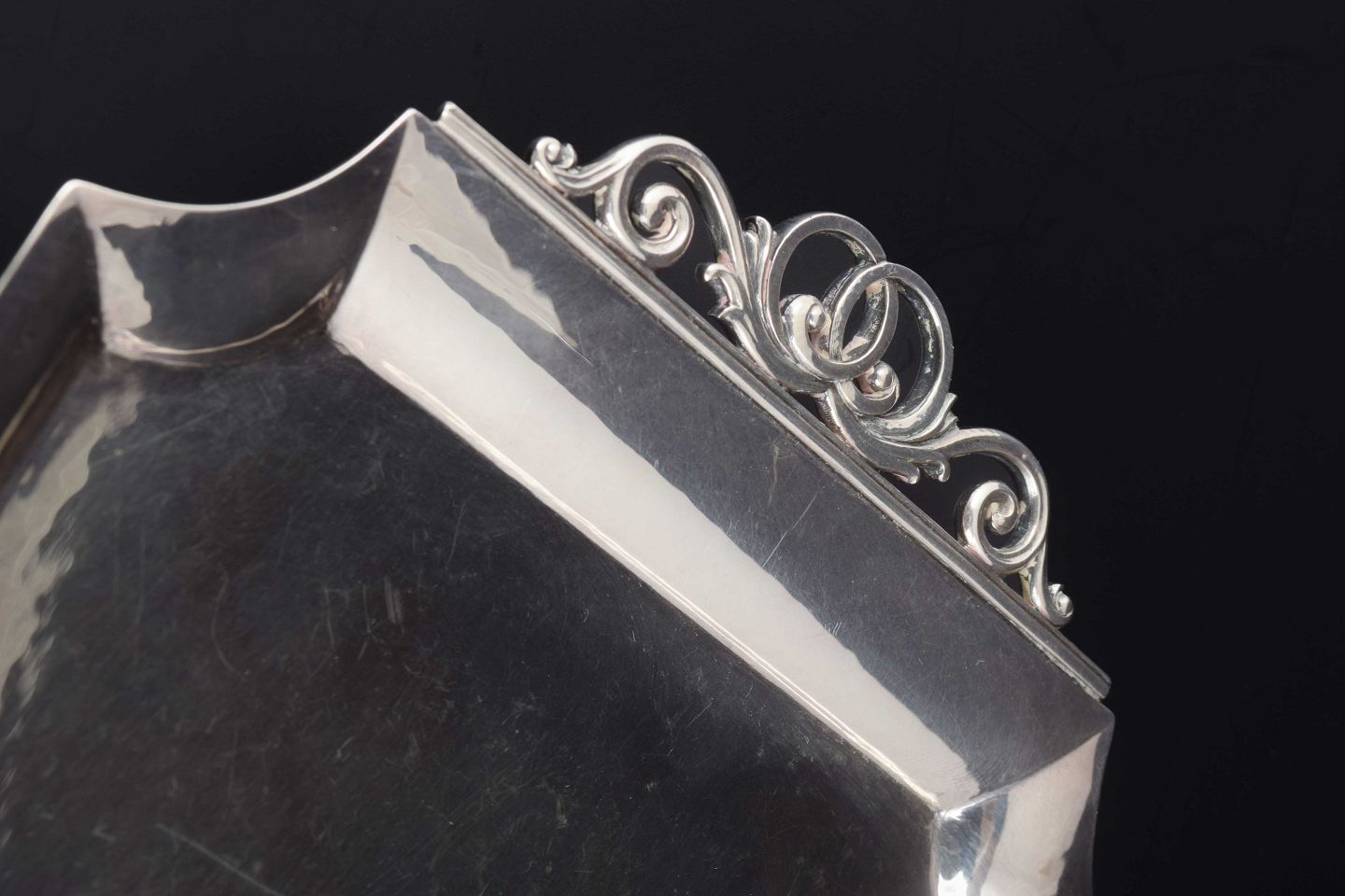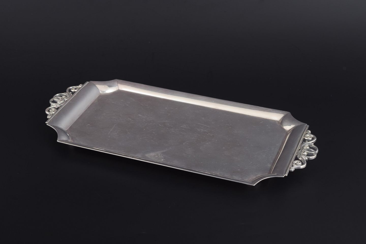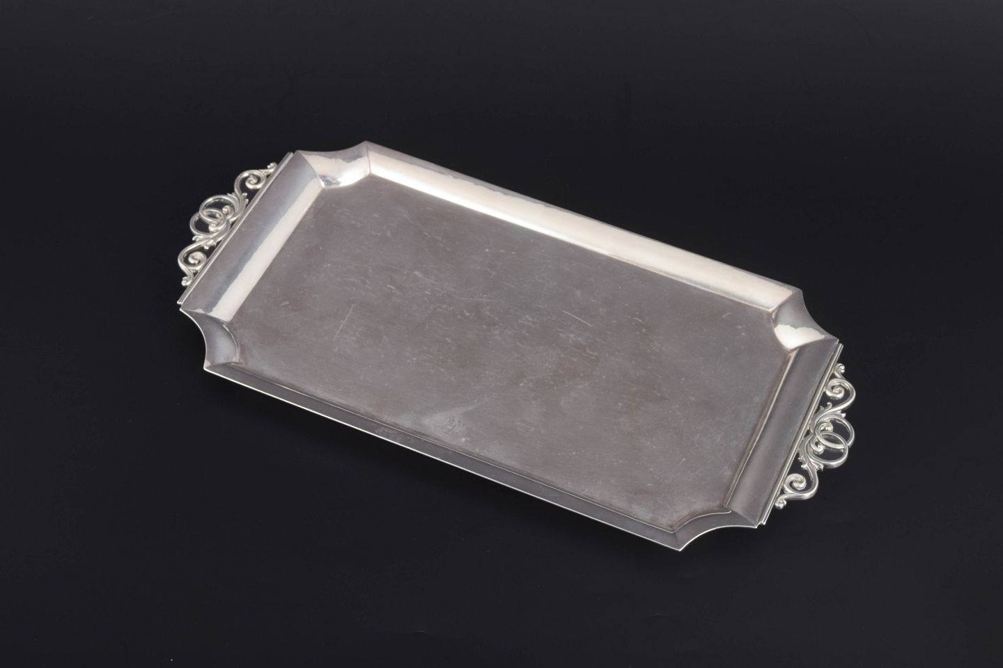 Rektangulær sterling sølvbakke med svungne hjørner og gennembrudt, volutformede håndtag.