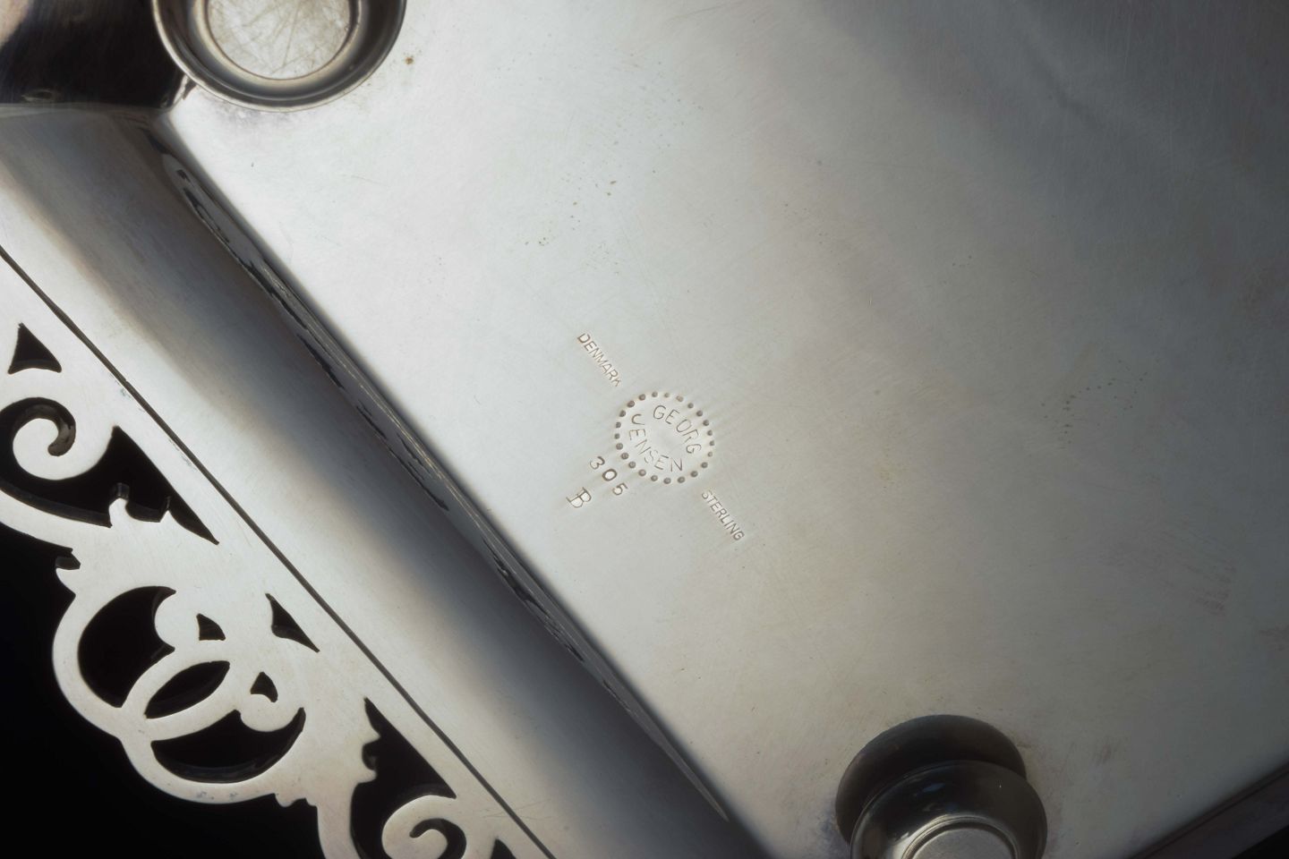 Georg Jensen (1866–1935) grundlagde sit sølvsmedeværksted i København i 1904, og firmaet blev hurtigt internationalt kendt for sin kombination af kunstnerisk formgivning og høj håndværksmæssig kvalitet. Efter Jensens død fortsatte værkstedet produktionen af både klassiske og nye modeller, og sølvbakker som model 305B repræsenterer husets elegante balance mellem funktionalitet og dekorativt formsprog.