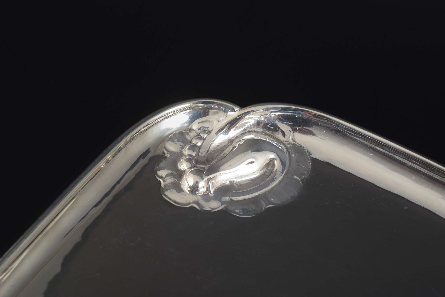 Elegant fad i massivt sterling sølv med bløde kanter, dekoreret i hjørnerne med stiliserede magnolia-blomster.