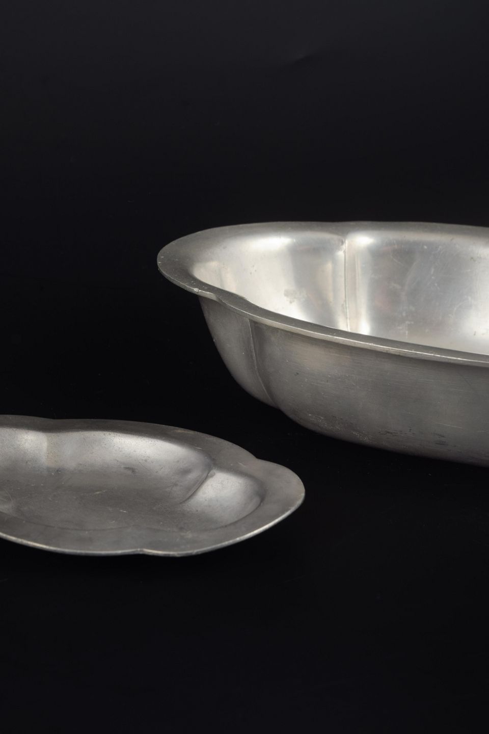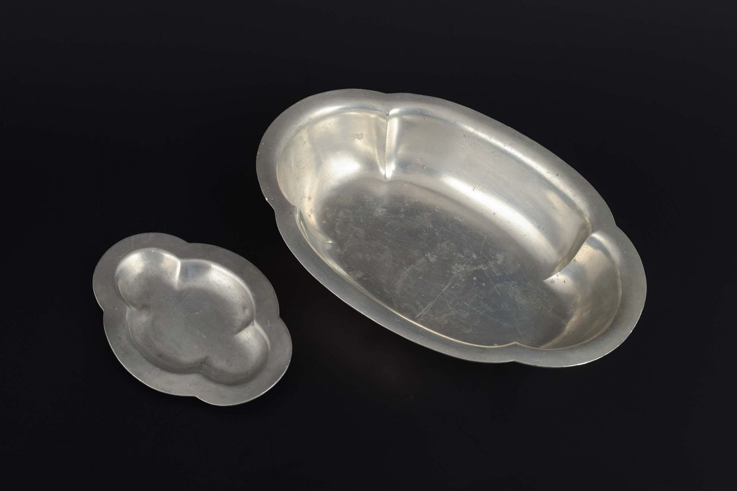 Oval og rund skål i tin, begge med blødt buede organiske former, 1930–1940.