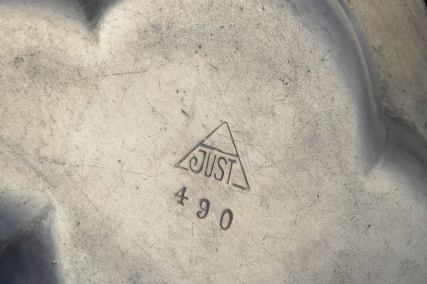 Just Andersen (1884–1943) var en dansk billedhugger og designer, kendt for sit arbejde i tin, sølv og den egenudviklede metallegering “Disko”. Han grundlagde sit værksted i København i 1918 og skabte et stort antal funktionelle og dekorative genstande med enkle, organiske former, der afspejler skandinavisk modernisme. Efter hans død i 1943 fortsatte firmaet under navnet Just, og tinproduktionen fortsatte ind i 1940’erne og 1950’erne.
