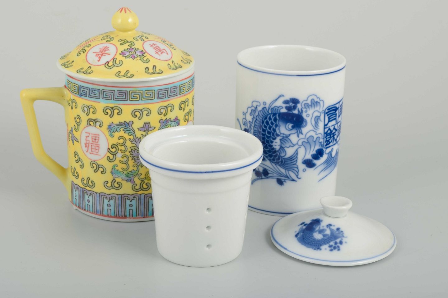 Cylindrisk formede porcelænskopper med hank, hver med låg og indvendig si. Den ene dekoreret på gul bund med flerfarvet emaljemaling og kinesiske skrifttegn, den anden i blå/hvid dekoration med fiskemotiv og kalligrafi.