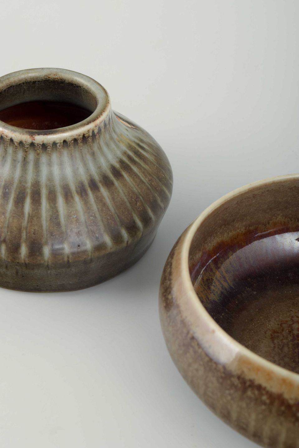 To stykker stentøj bestående af en lav, rund skål og en bredformet vase med riflet dekoration. Begge med brunlig glasur i nuancer af grå, beige og brun samt indvendig dyb glasur i rødbrune toner.