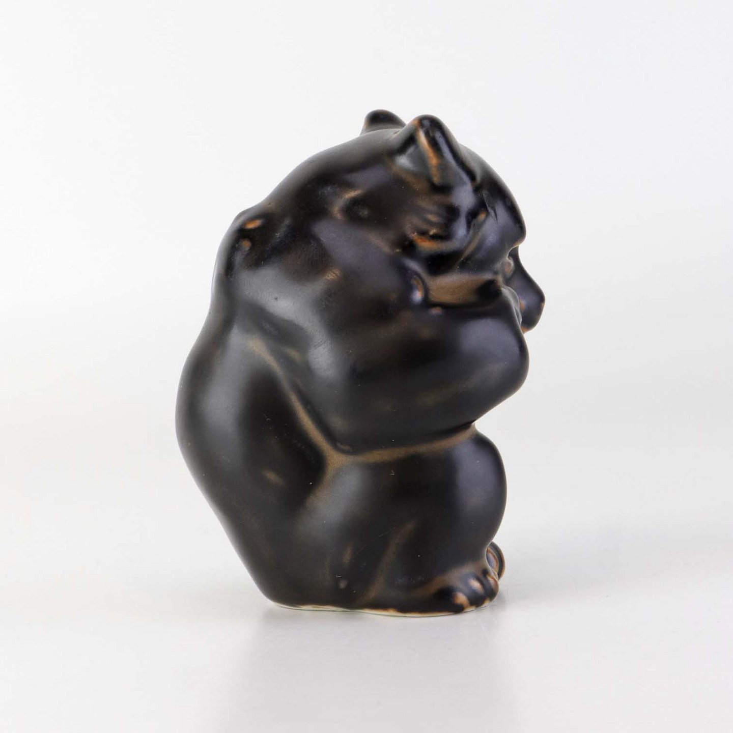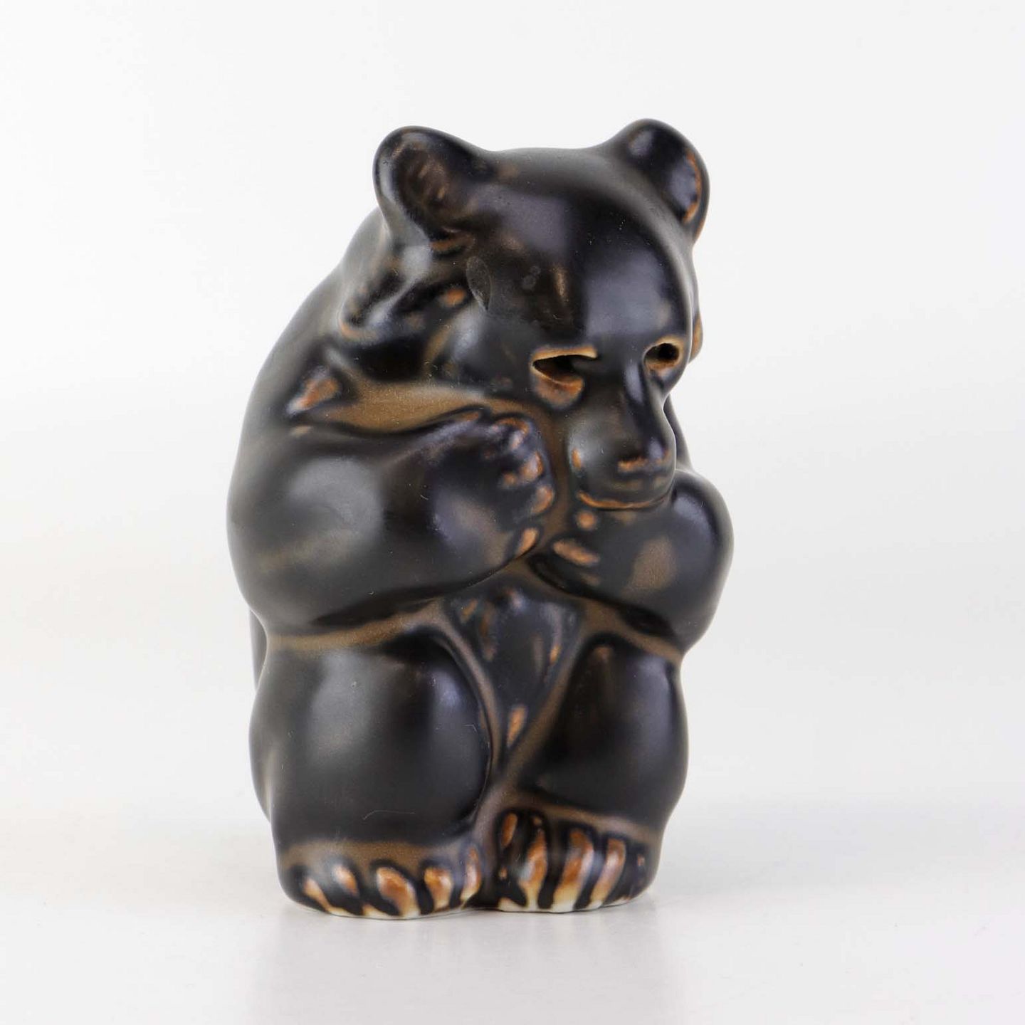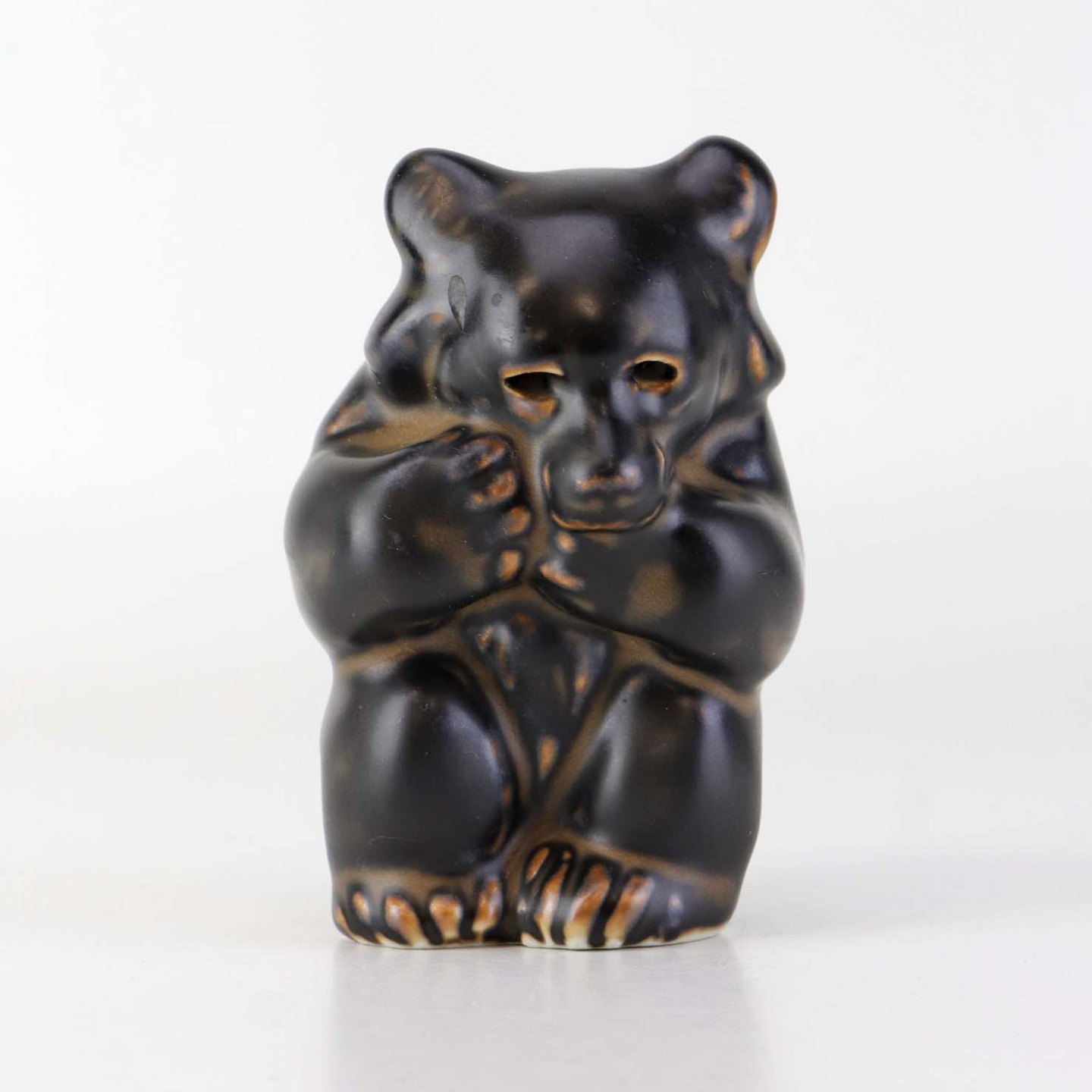 Figur i brunglaseret stentøj med motiv af siddende bjørneunge med den ene pote i munden. Nr. 21435