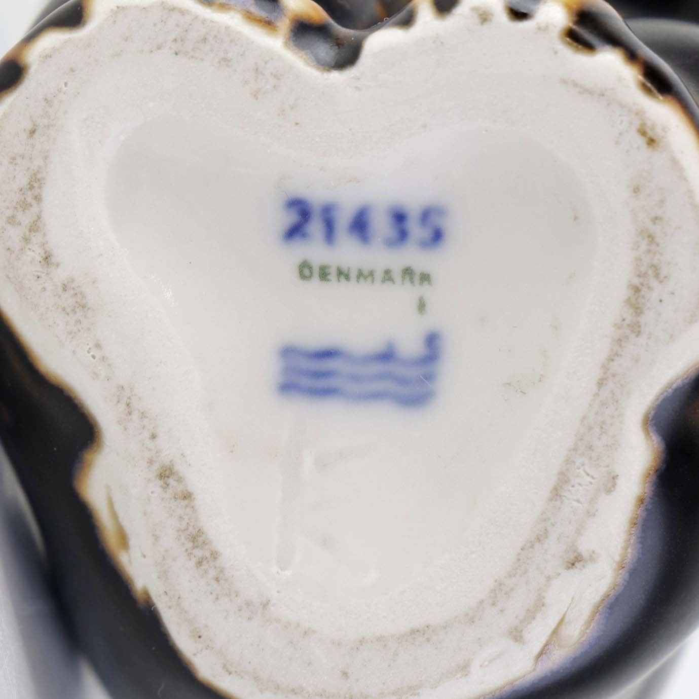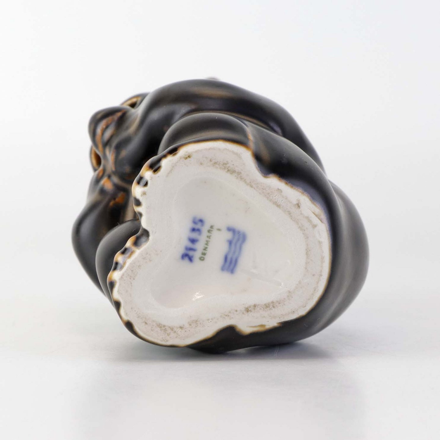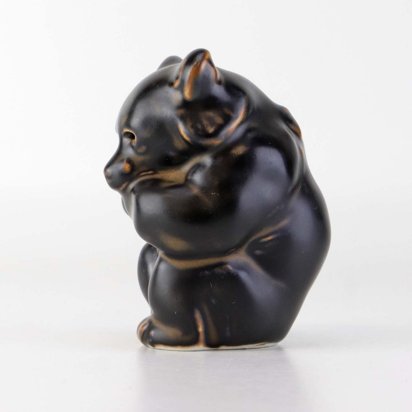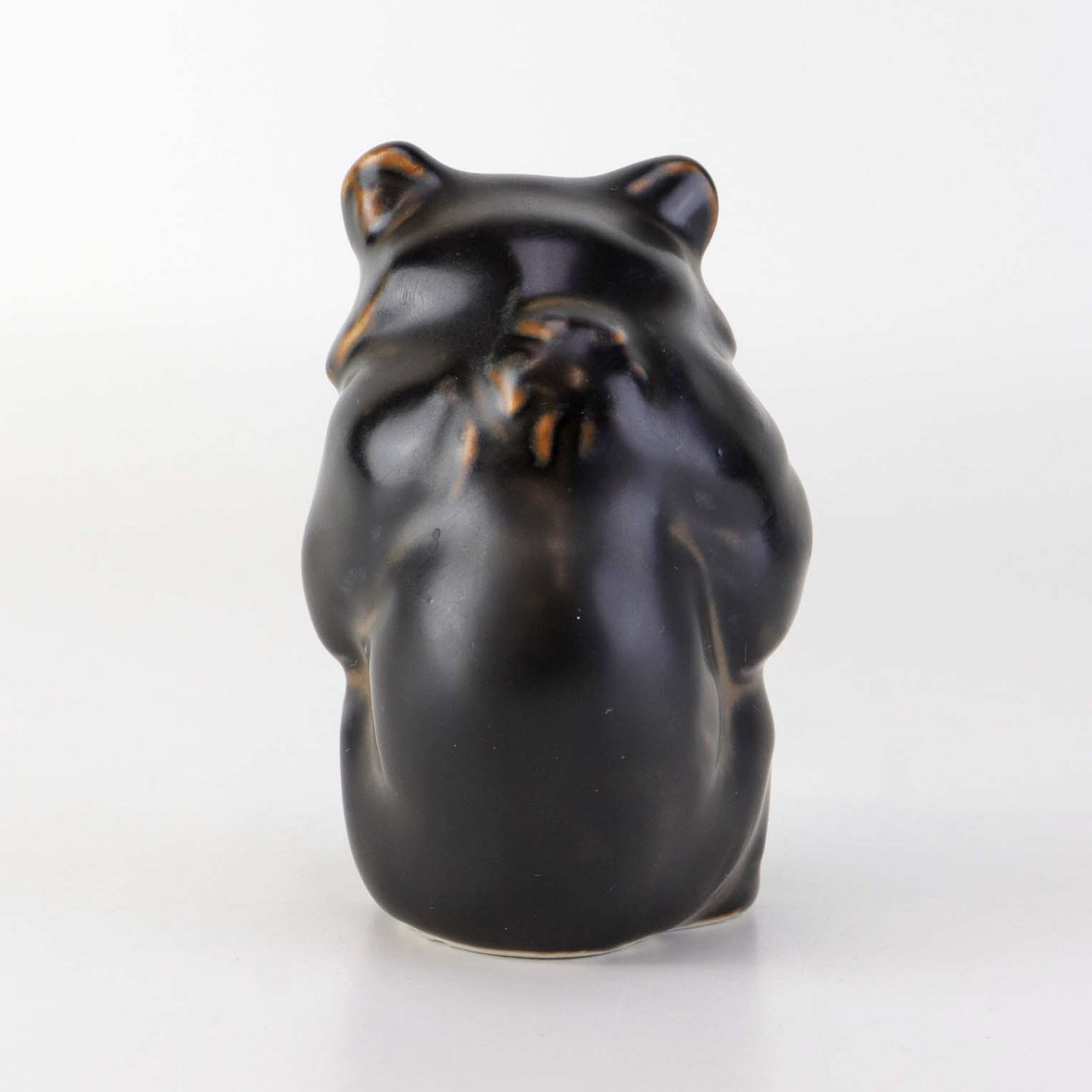 Figur i brunglaseret stentøj med motiv af siddende bjørneunge med den ene pote i munden. Nr. 21435