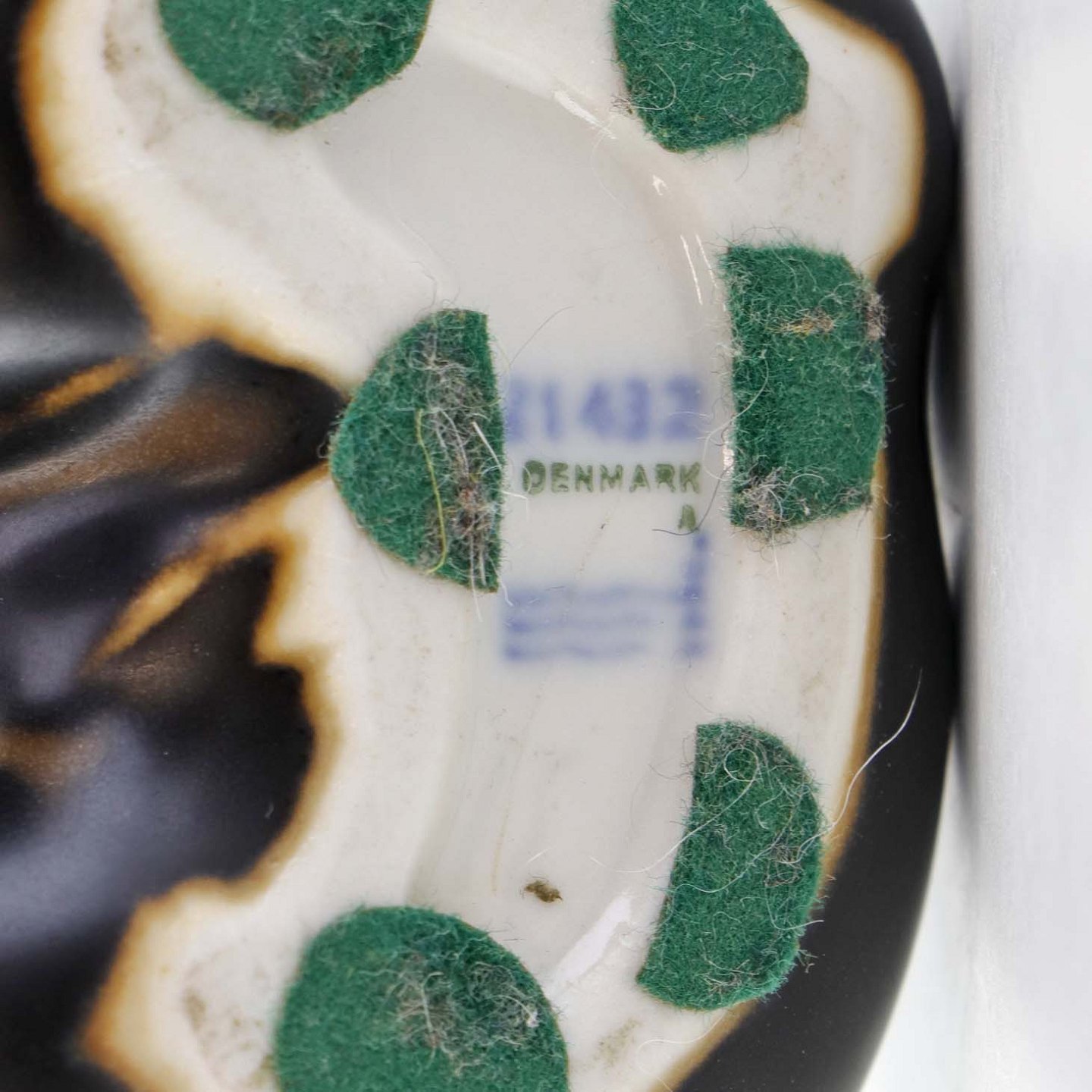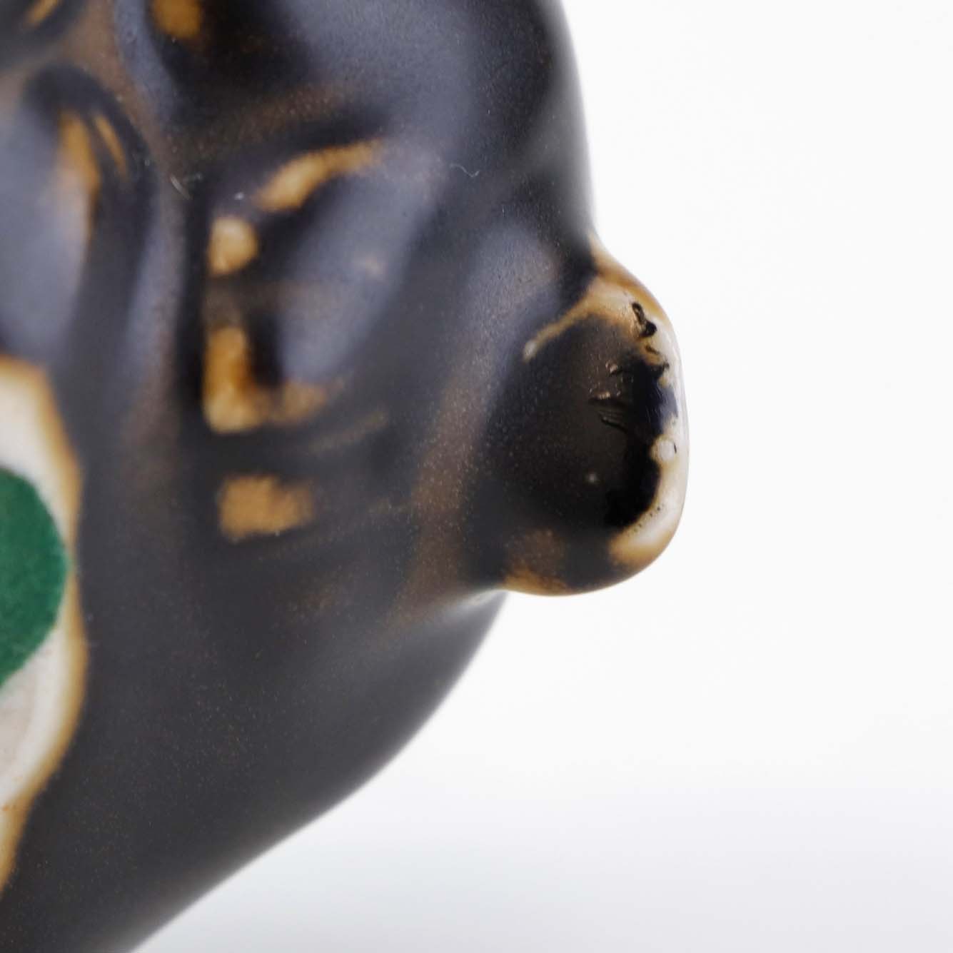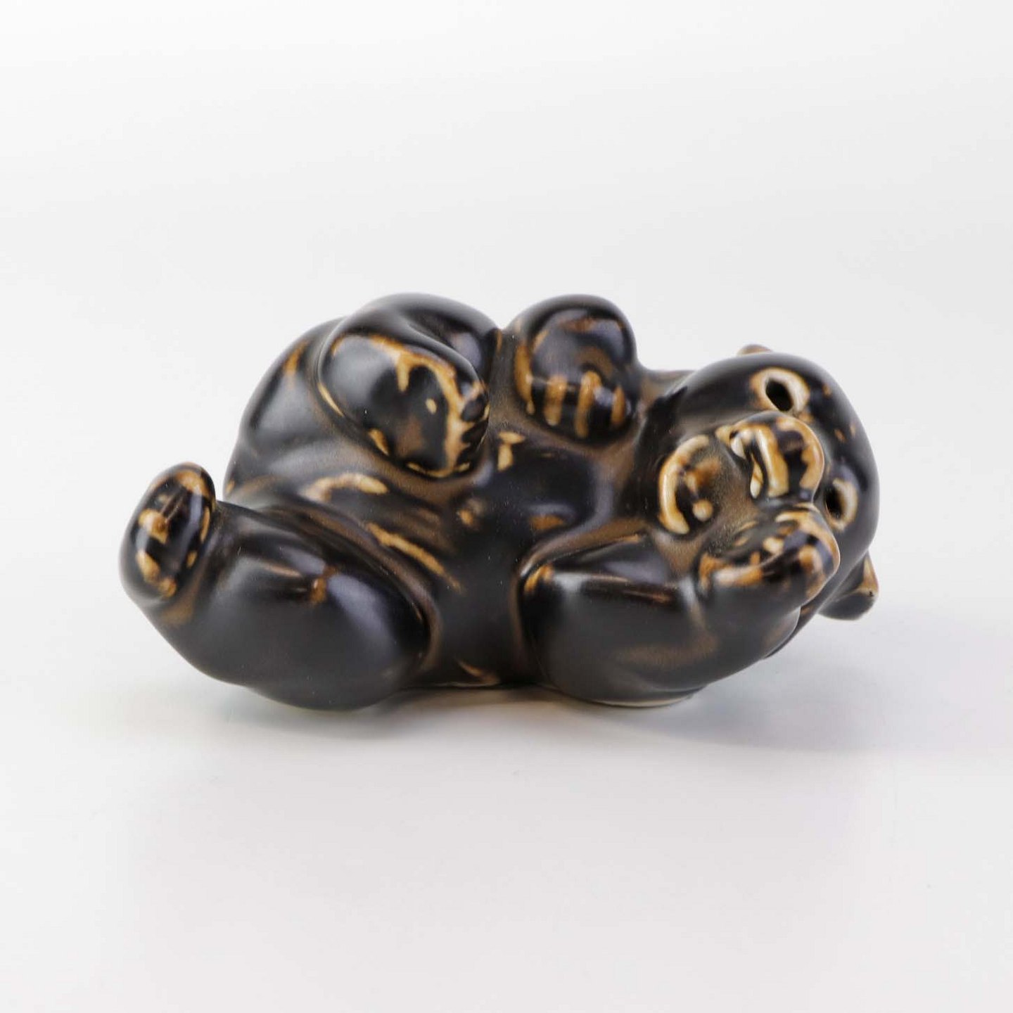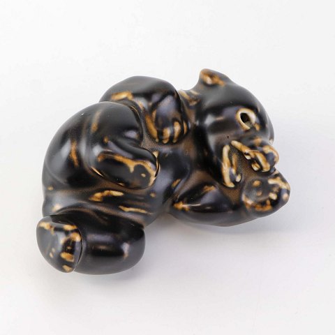 Figur i brunglaseret stentøj med motiv af liggende og legende bjørneunge. Nr. 21432