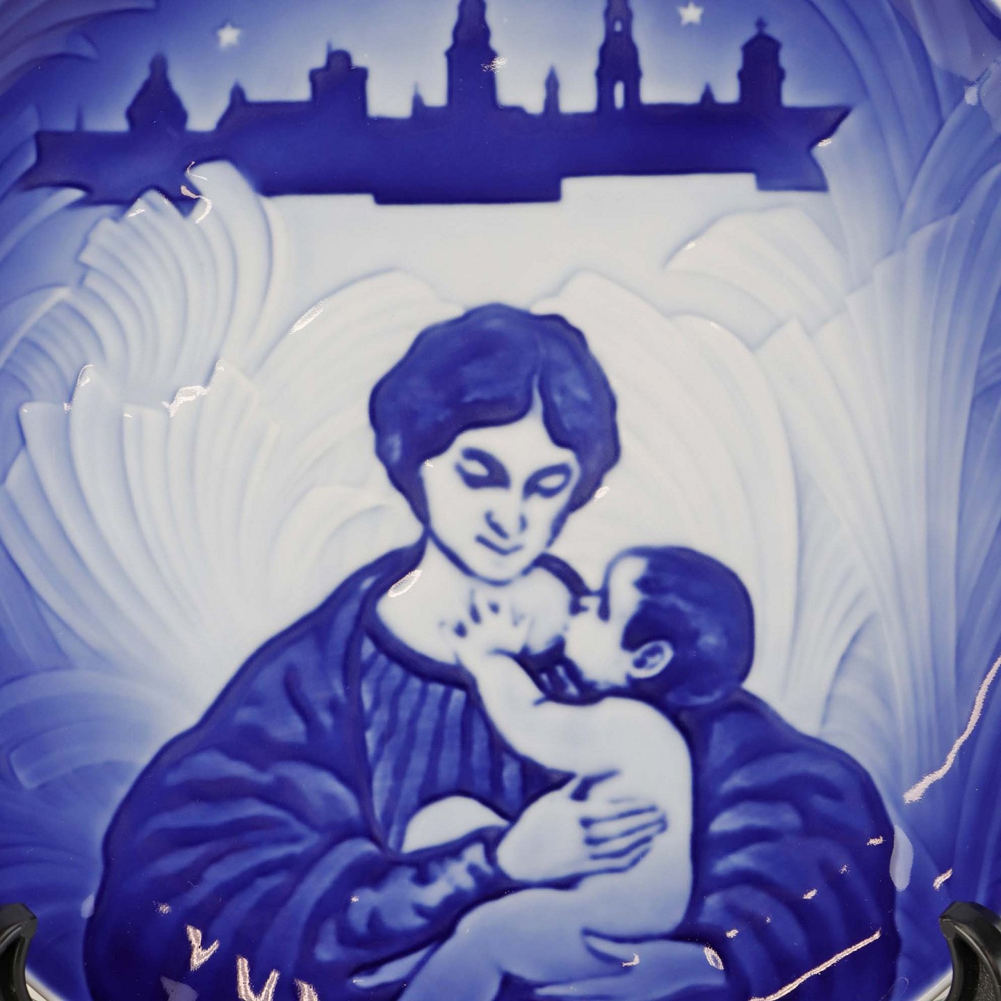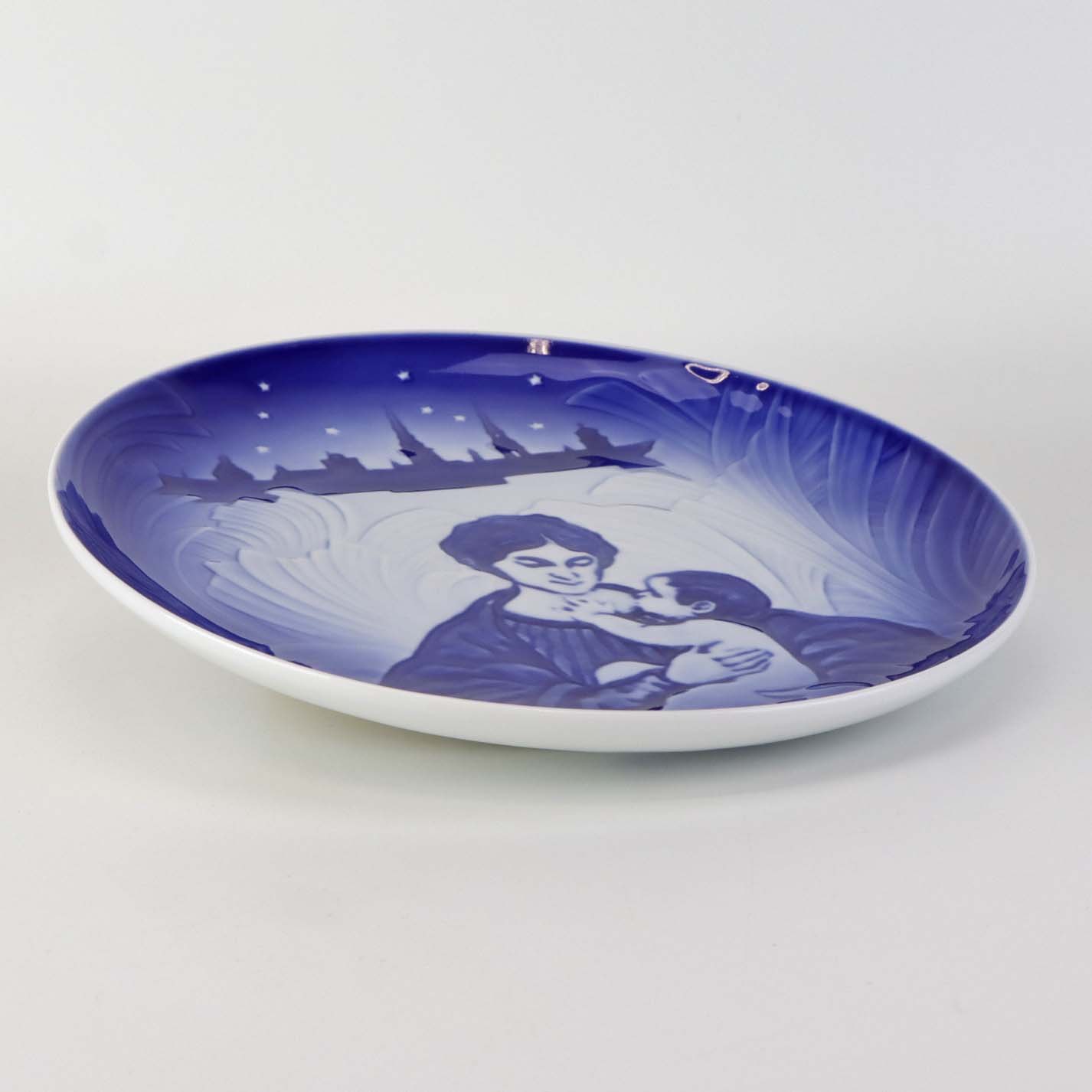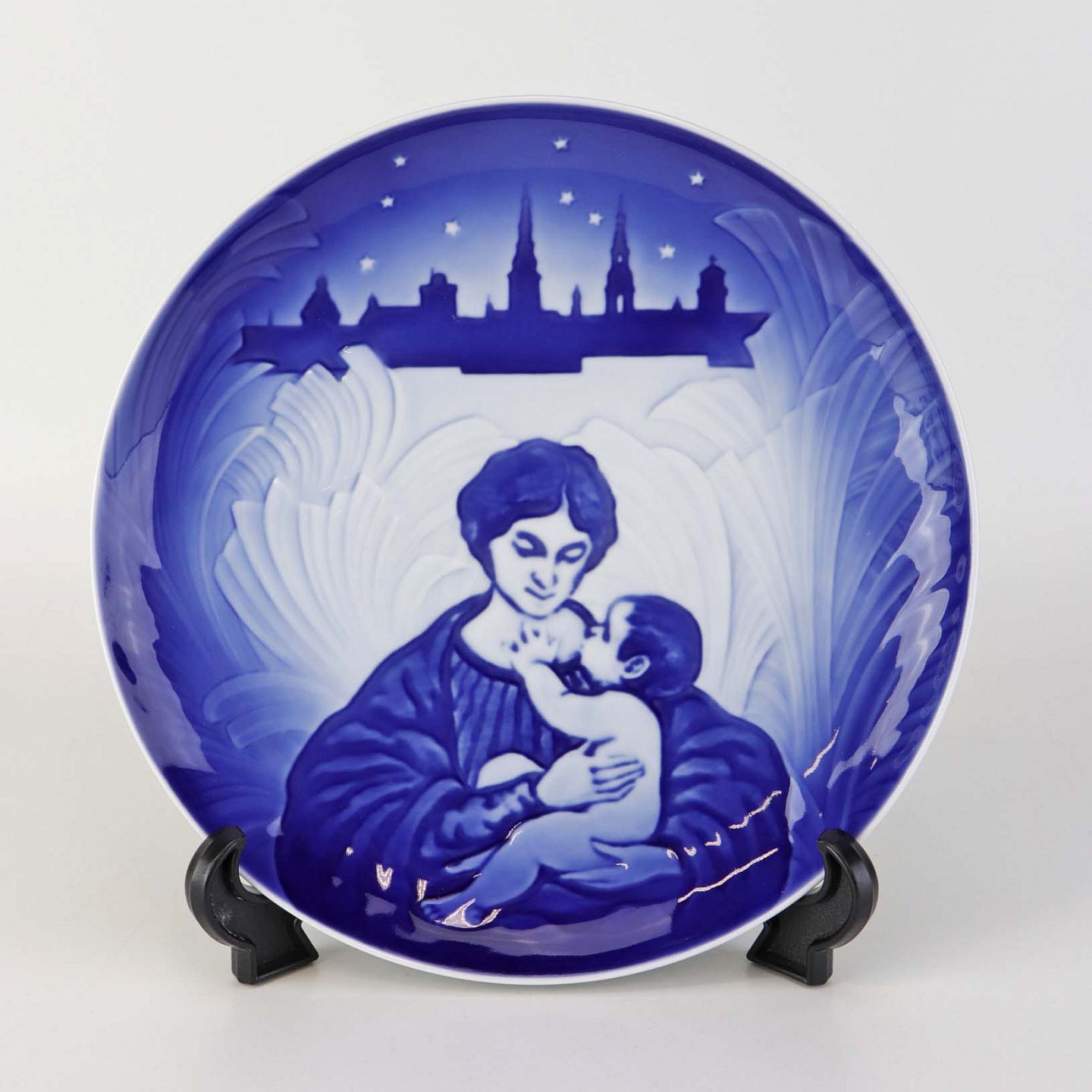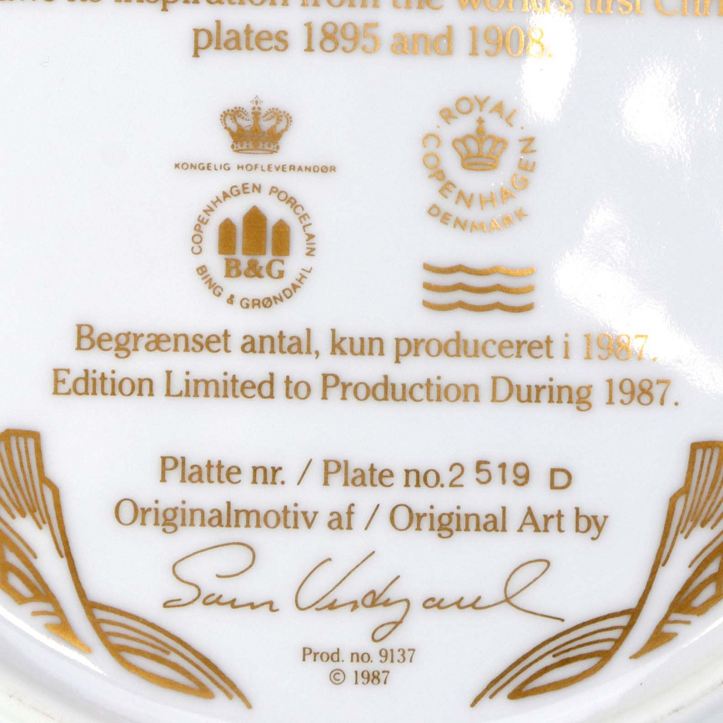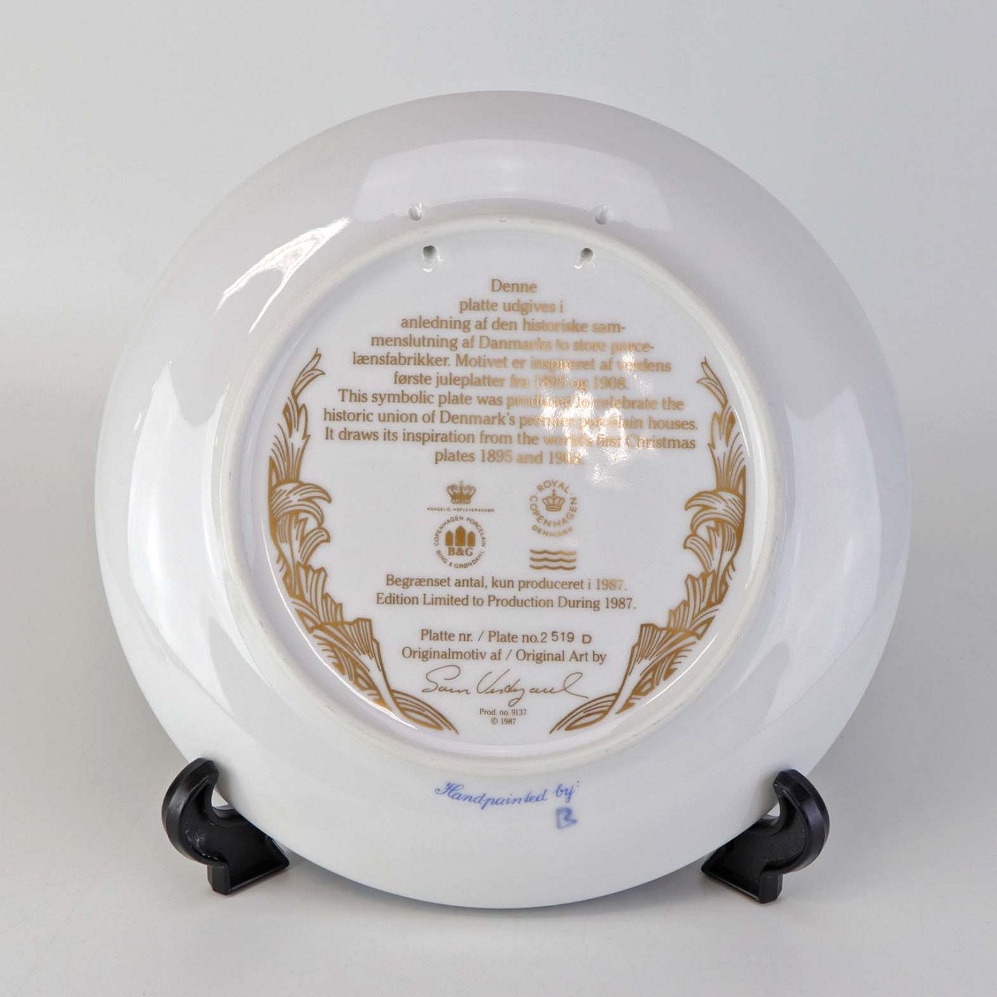 Text zugänglich auf Dänische: Håndmalet mindeplatte i porcelæn fra år 1987 i anledningen af sammenslutningen af Danmarks to store porcelænsfabrikker Bing & Grøndahl og Royal Copenhagen. Motivet er inspireret af juleplatten fra år 1895 og år 1908.