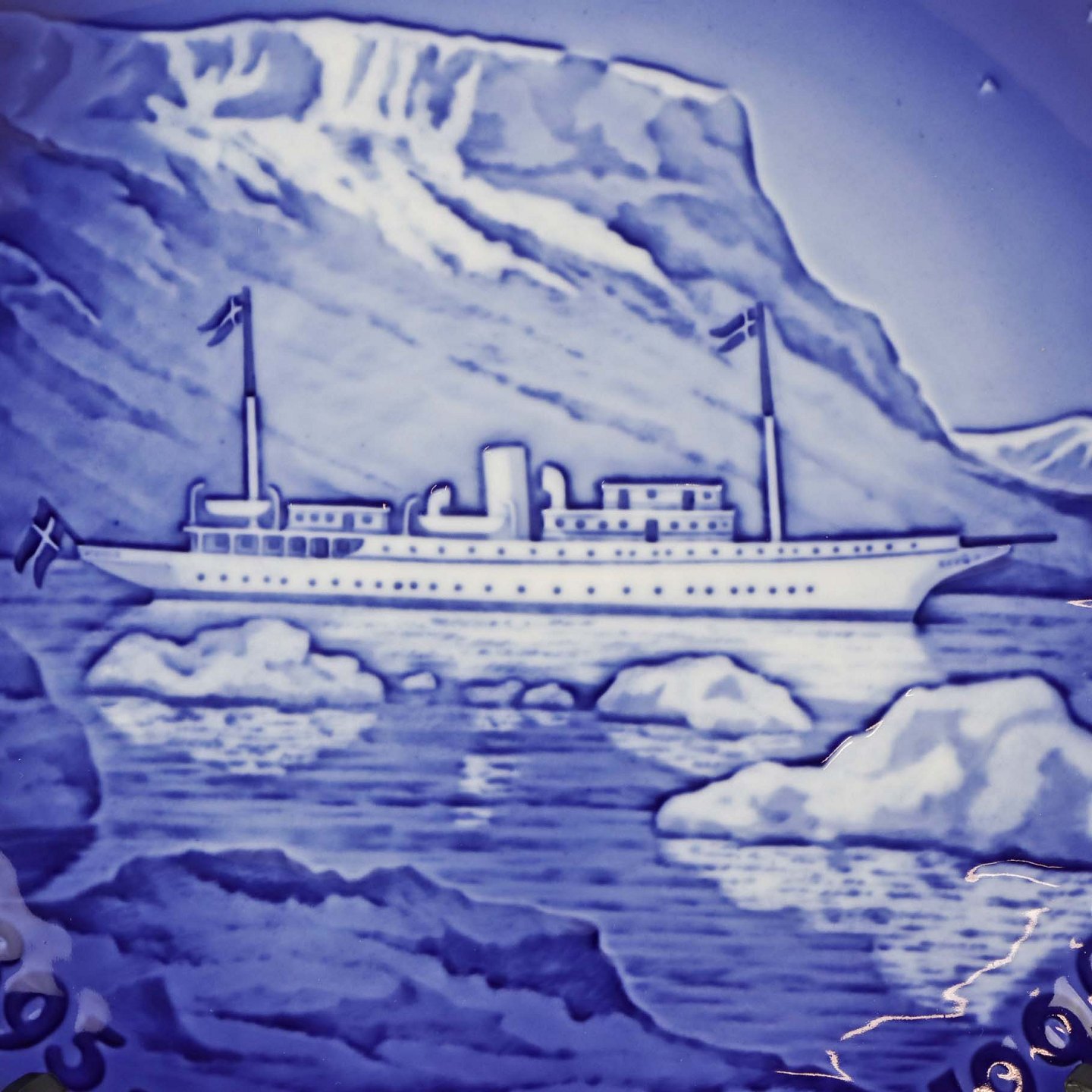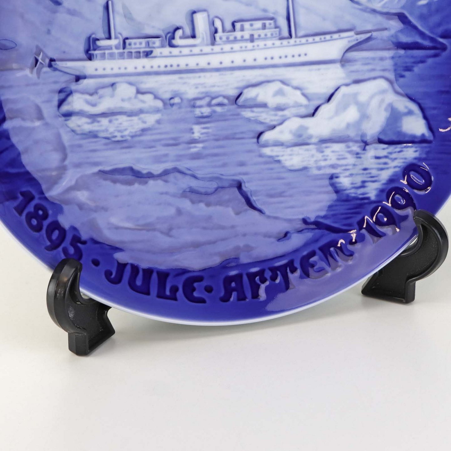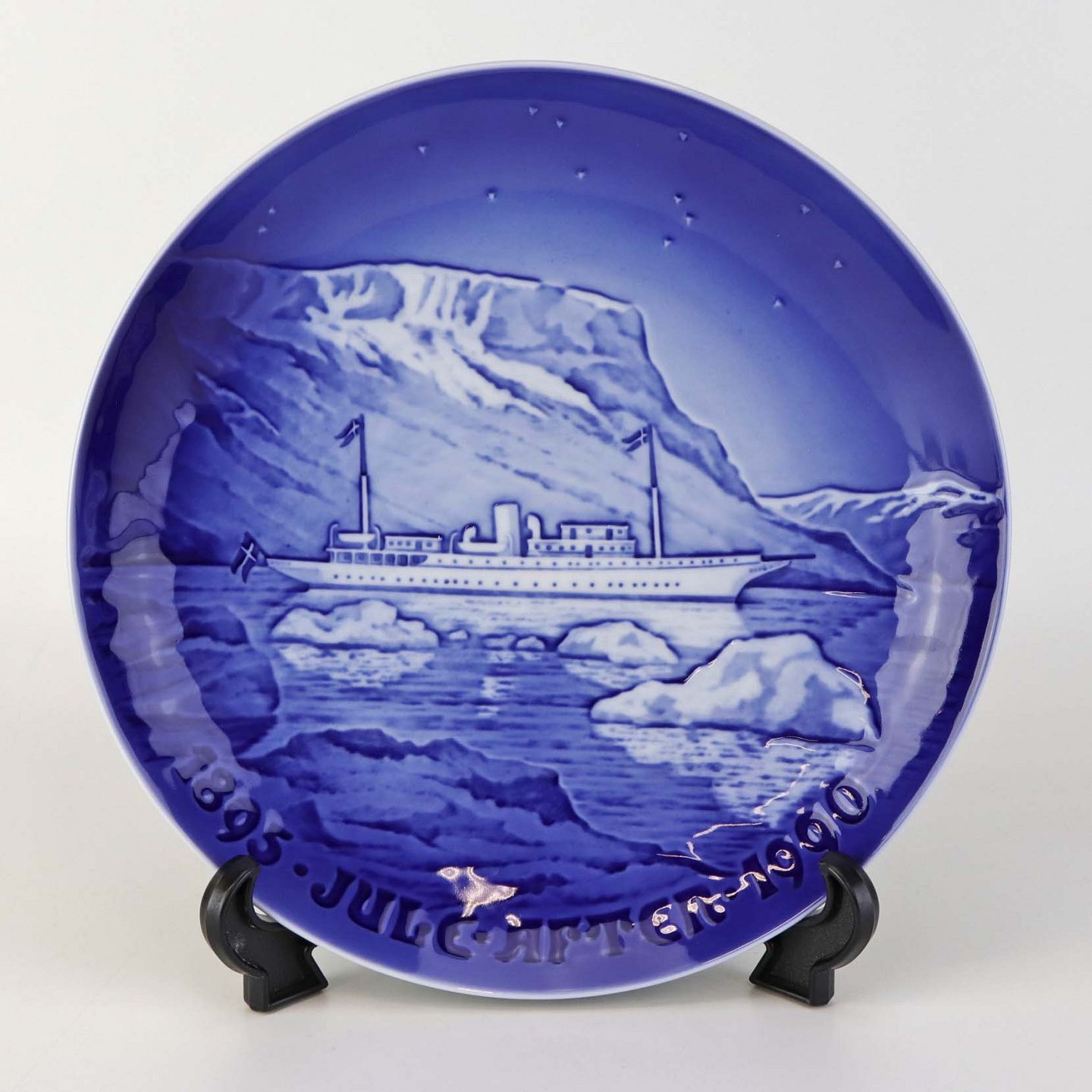 Text zugänglich auf Dänische: Jubilæumsplatte i porcelæn. Fremstillet i forbindelse med 95 års jubilæet for den første juleplatte fra år 1895. Plattens motiv viser Kongeskibet Dannebrog ved indsejlingen til Godthåbs havn ved Grønland. Teksten Juleaften 1895-1990.
