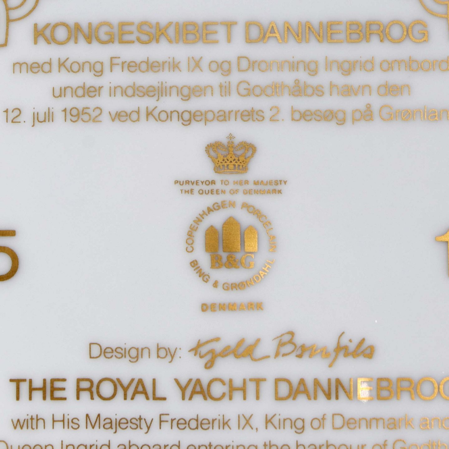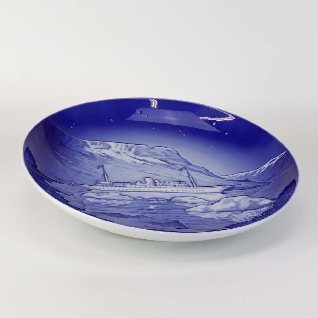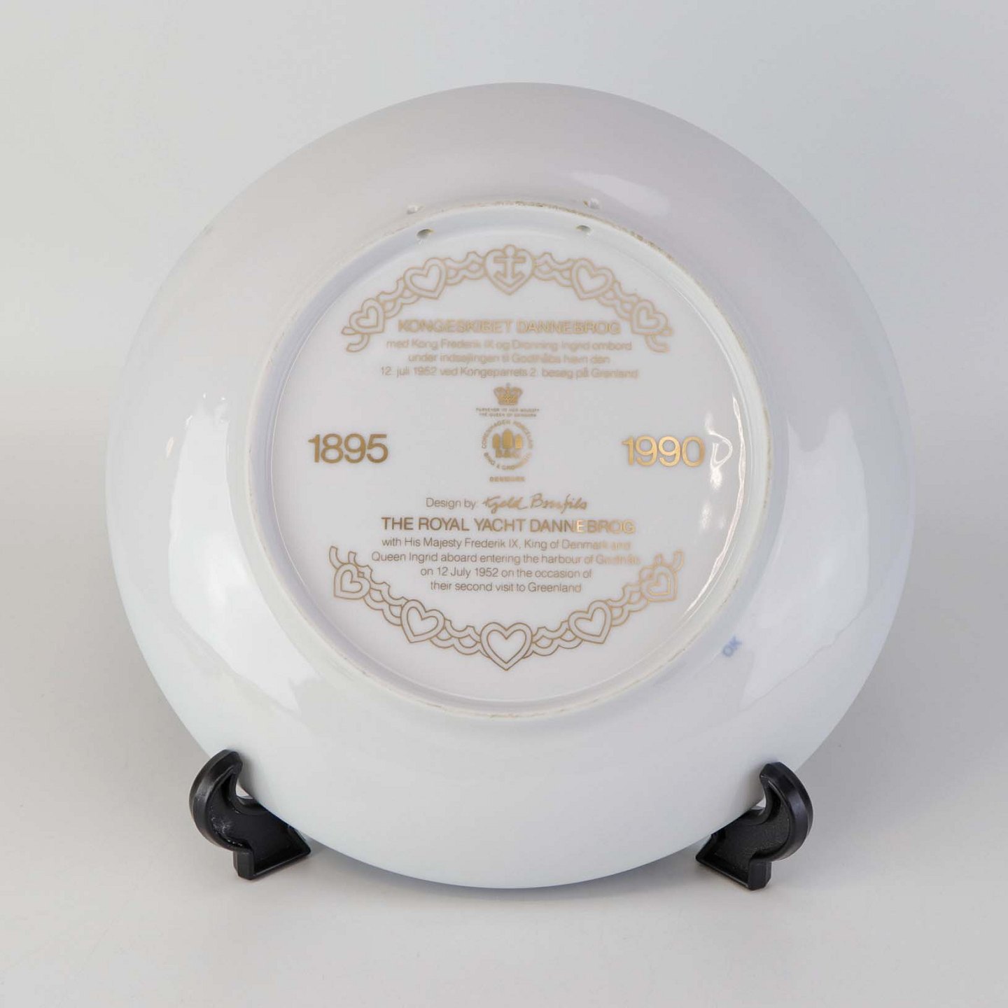 Text zugänglich auf Dänische: Jubilæumsplatte i porcelæn. Fremstillet i forbindelse med 95 års jubilæet for den første juleplatte fra år 1895. Plattens motiv viser Kongeskibet Dannebrog ved indsejlingen til Godthåbs havn ved Grønland. Teksten Juleaften 1895-1990.