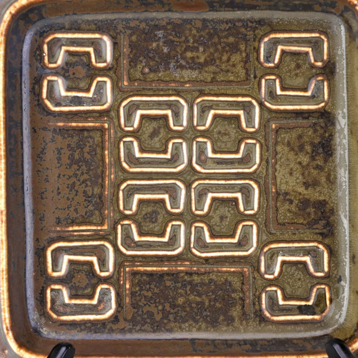 Firkantet bordfad i stentøj med brun glasur og geometrisk motiv. Nr. 7233